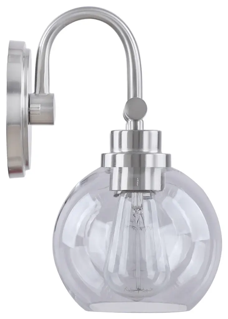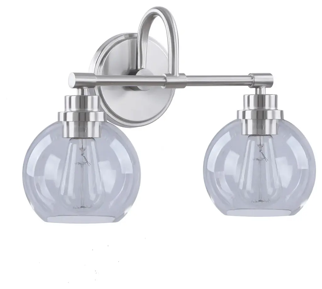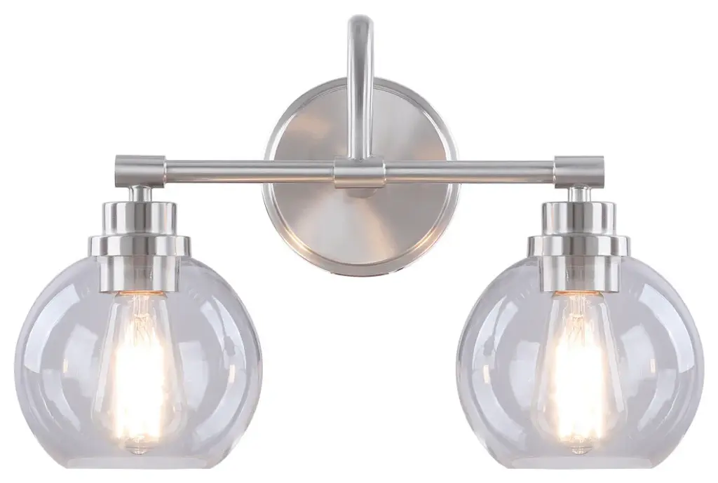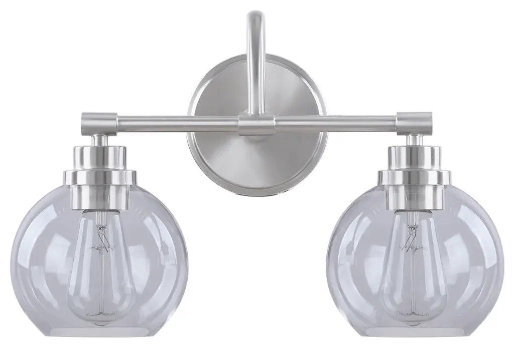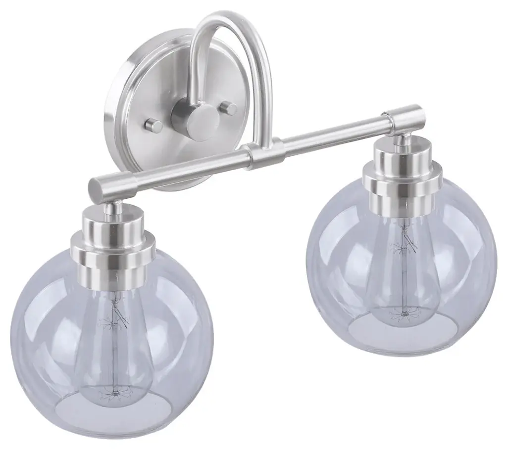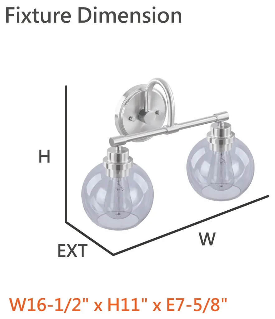 Aspen Creative offers a 2 light bathroom vanity wall light fixture in brushed nickel. Fixture dimensions 7 5/8" Deep x 16 1/2" Width x 11" Height. Backplate dimensions 3/4" Deep x 5 1/8" Width x 5 1/8" Height. Requires 2 type A - 60 watt E26 medium base light bulb (not included). Includes clear glass globeshades. Shade dimensions 6" Width x 5 1/2" Height. UL listed for bathroom wall installation above the mirror and vanity cabinet as well as powder rooms and makeup rooms.