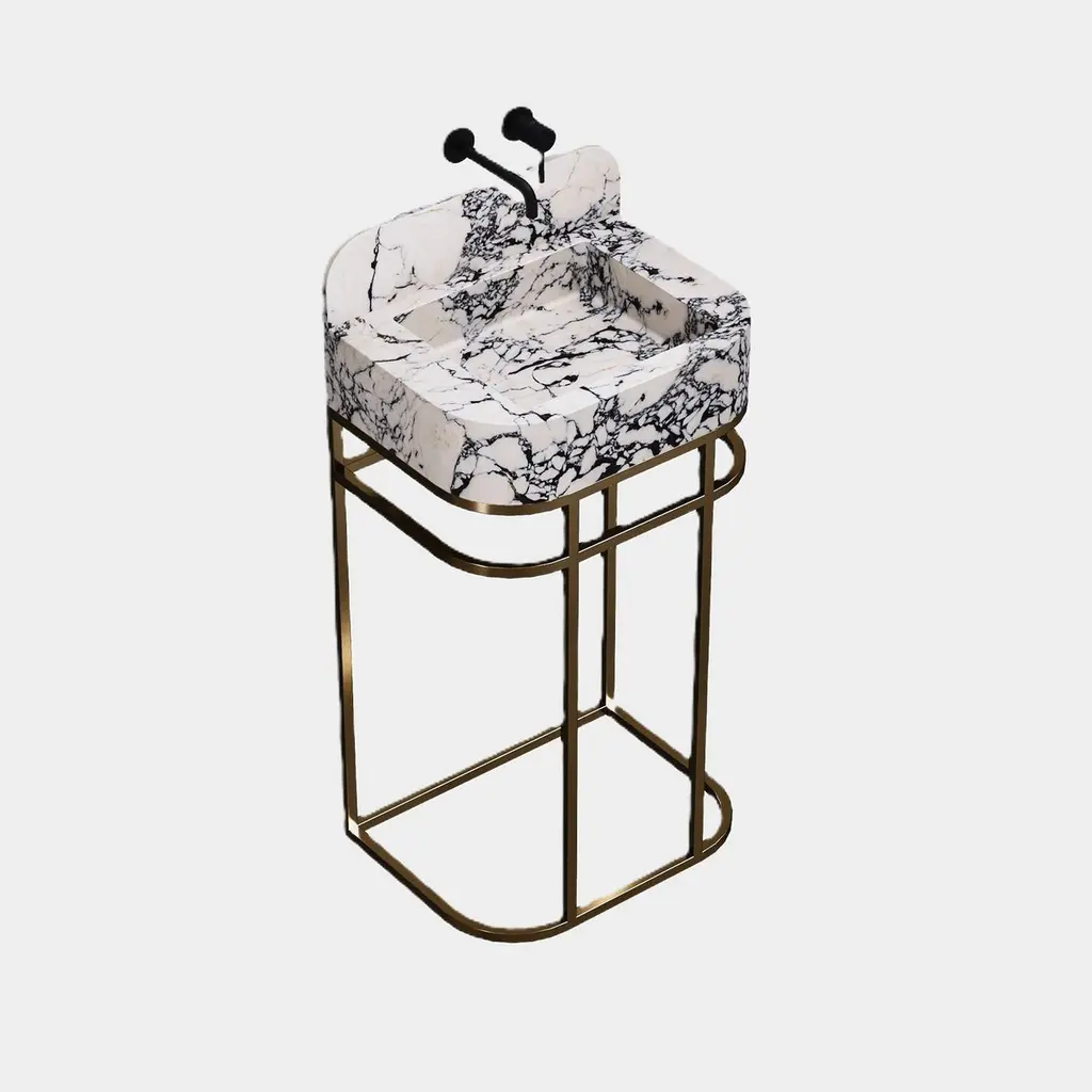 "The Assens is a luxurious marble basin featuring a sleek backsplash, seamlessly blending modern and traditional design elements. Its beveled edges and geometric shape create a refined yet timeless look, making it a stunning addition to any space.This basin is designed for use with brushed gold or black faucets and accessories, offering a stylish solution where space is limited. Available in multiple marble finishes, it allows you to choose the perfect aesthetic for your space.Please note: This listing is for the basin only and does not include the stand. If you wish to purchase the Assens Basin with the stand, please refer to the separate product listing for the Assens Free-standing Vanity. Lifestyle images are for illustrative purposes only and may feature a different size of the product. Actual product dimensions are specified on the product listing. Non-lifestyle images are of the actual product and will give you an accurate indication of size.The water supply kit, drain assembly, and faucet are not included.Stone SinksAs marble is a natural material, variations in background color, veining distribution, and patterns are to be expected, making each piece uniquely beautiful."Dimensions: 80 x 45 x 105 CM