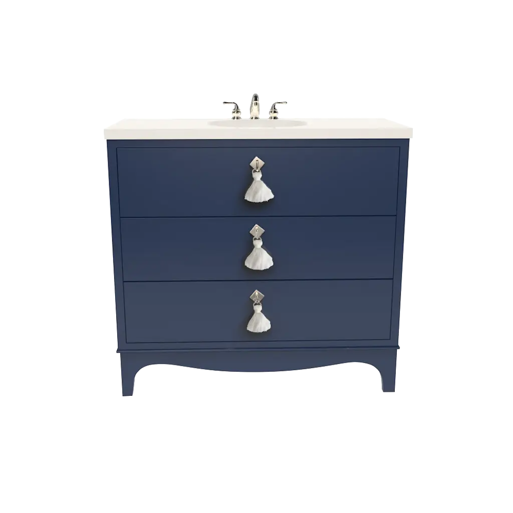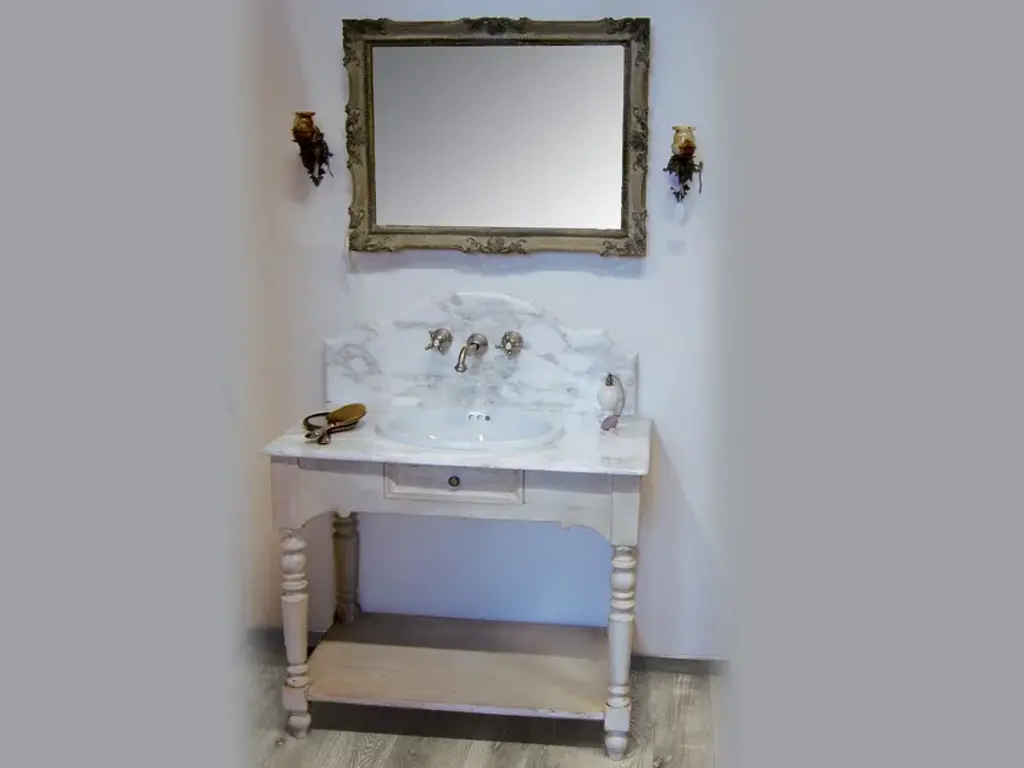 Composition Basilic : old pine handmade furniture with first patina + 1 drawer + top & backsplash in calacatta marble + ceramic undermount basin + mirror 90x70 cm.The hand made furniture Bleu Provence recalls the beautiful homes in our countryside. Large variety and quality of wood (old pine, oak,…) and large choice of materials for the basins (ceramic, marble, natural stone, travertine, serenna stone,…). Many sizes and models available (with 1 or 2 basins, drawers, mirrors, wall lamps,…).