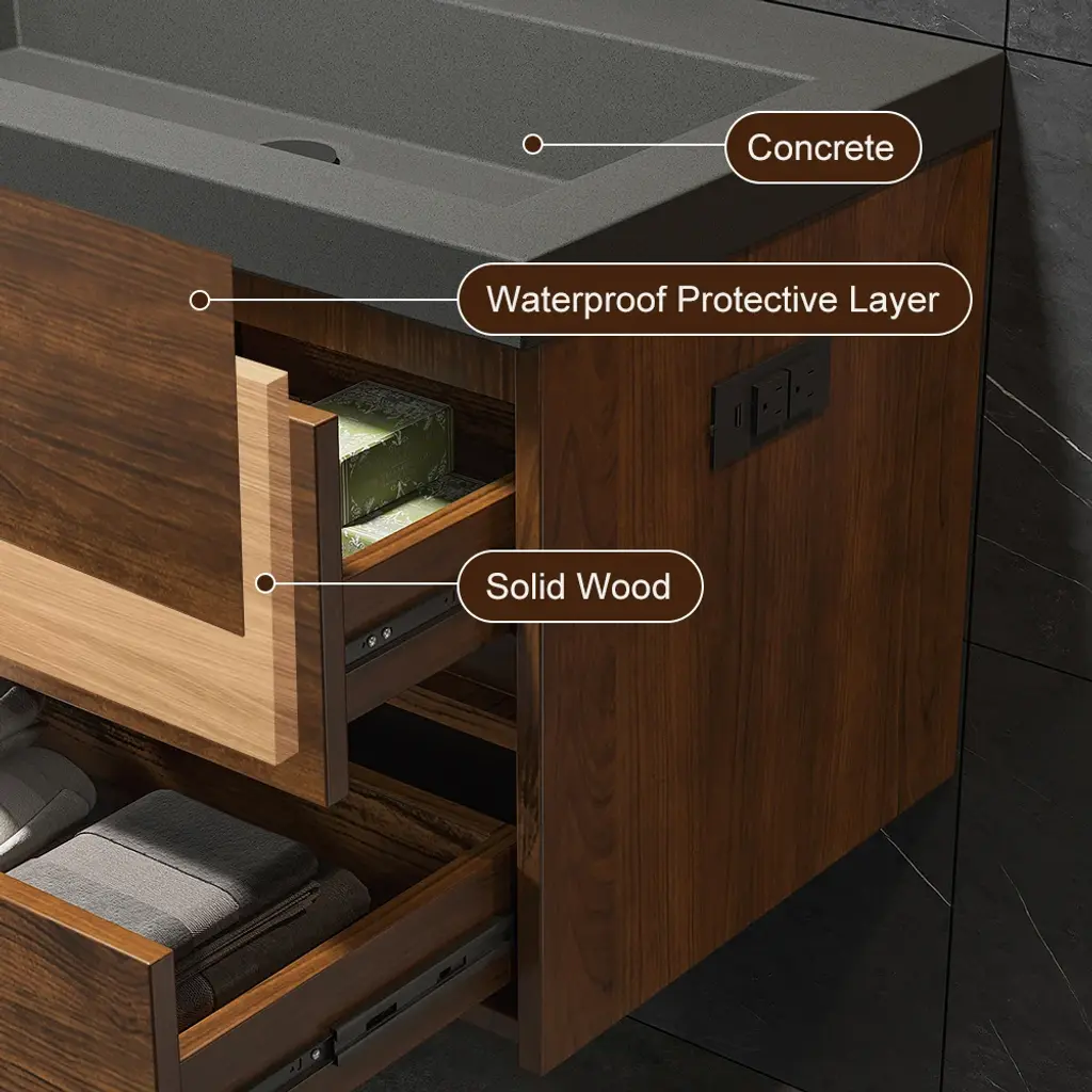 Bring functionality and style to your bathroom with this 35" wall-mounted wood bathroom vanity. Built with a solid wood base for that added warmth of natural beauty, the concrete vanity top brings a modern aspect to it. It is complemented with a ceramic vessel sink and a built-in charging station for everyday convenience. With two spacious soft-close drawers, this vanity will provide more than enough storage for all your essentials while keeping your space sleek and organized.