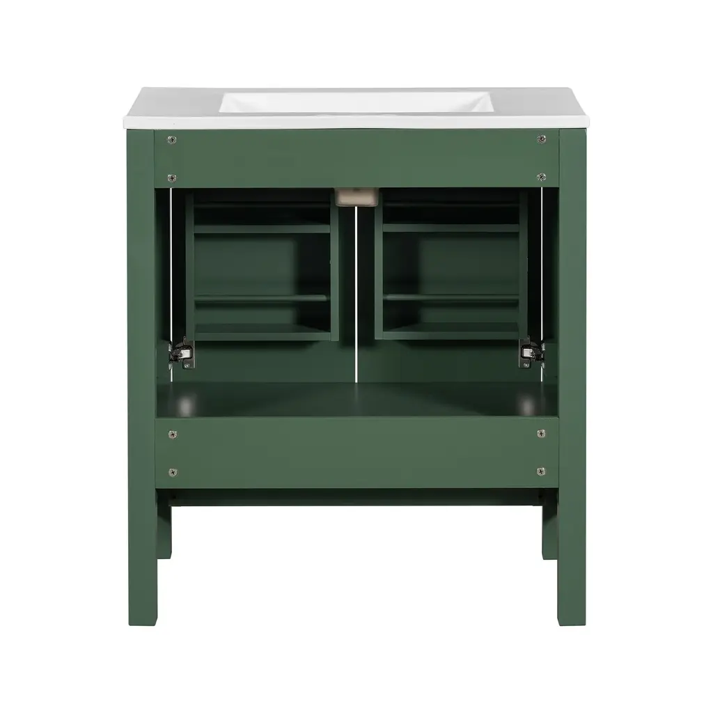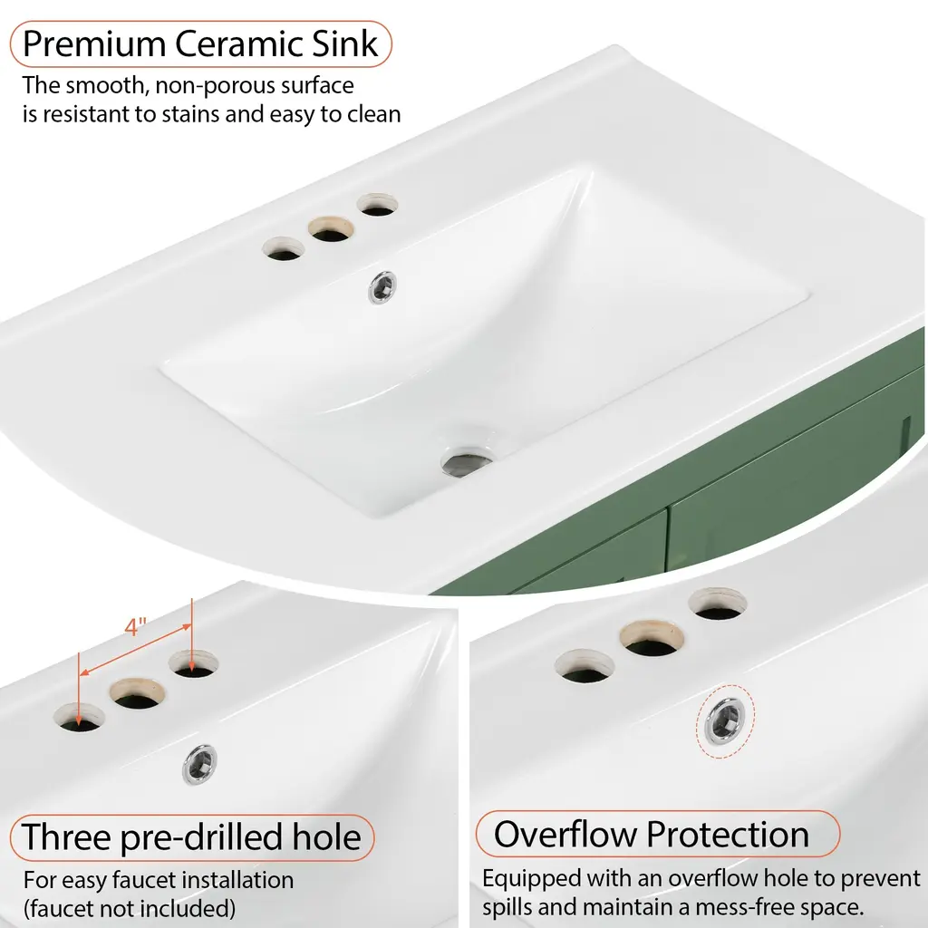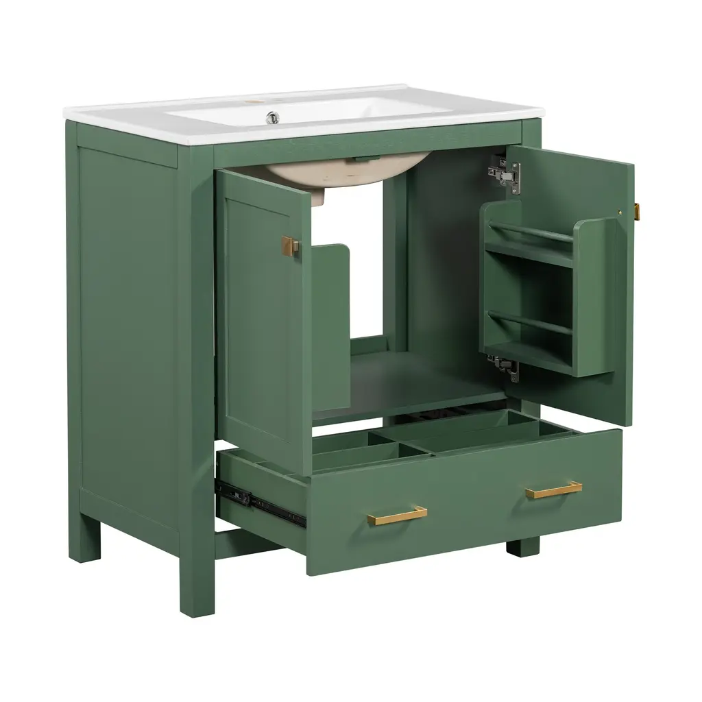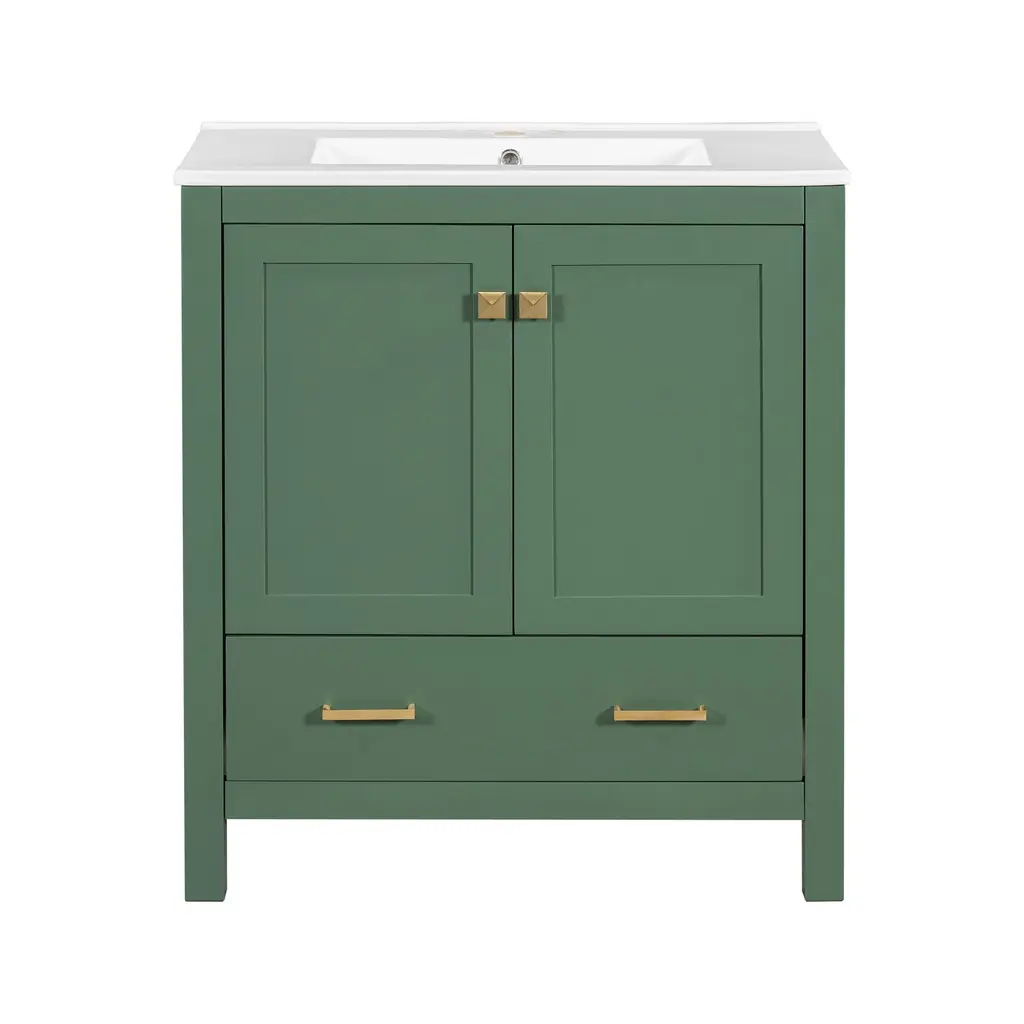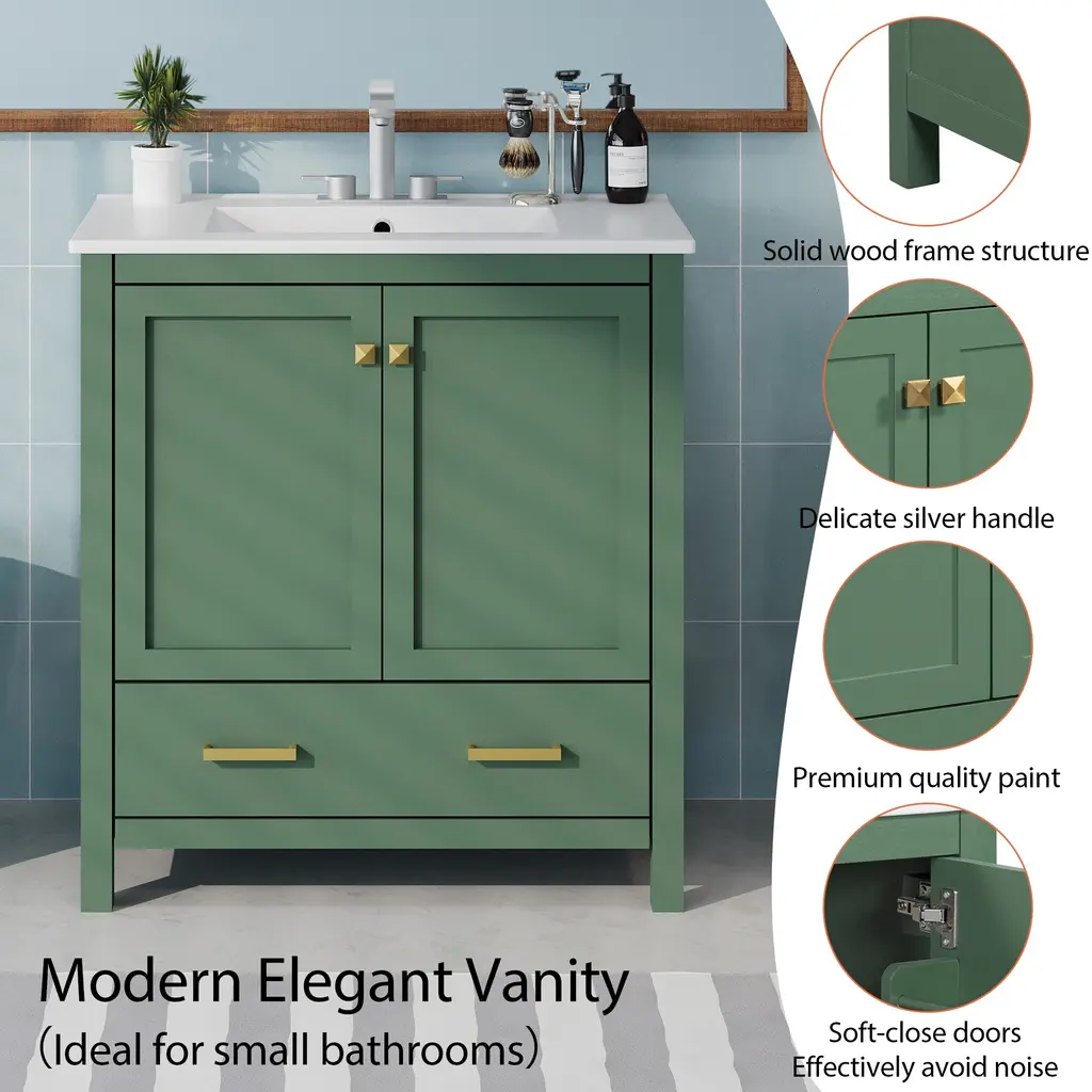 Product Features[Powerful Storage Function] Our bathroom cabinet is designed with convenient storage in mind. The cabinet doors feature built-in shelves, providing a secure space to store bath essentials such as cosmetics, shampoos, shower gels, razors, and more, preventing items from easily slipping off. The drawers are thoughtfully designed with partitioned compartments, allowing you to neatly store bathroom essentials, keeping your bathroom clean and organized.[Elegant and Stylish Appearance] Our 30-inch bathroom cabinet features sleek lines and modern design. With its sophisticated green exterior, stylish handles and white sink, it adds a touch of sparkle to your bathroom decor. The combination of style and functionality creates an inviting and beautiful atmosphere.[Embedded Sink] The cabinet is equipped with a pure white embedded ceramic basin. Not only does it enhance the overall appearance of the cabinet, but it also saves space in your bathroom. The smooth and waterproof surface is easy to clean. The basin features a pre-drilled hole suitable for a 4-inch faucet, offering convenience and compatibility.[Soft Close Doors] The cabinet doors are equipped with adjustable hinges and a soft-closing design, reducing noise when closing. Say goodbye to slamming doors and enjoy a quiet and peaceful bathroom experience.[Sturdy, Durable & High-Quality] Our bathroom cabinet is constructed with a solid wood frame, providing stability and durability. The interior and exterior of the cabinet are coated with environmentally friendly water-resistant paint. This high-quality construction extends the lifespan of the cabinet, offering long-lasting use.