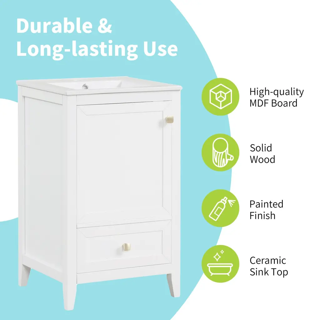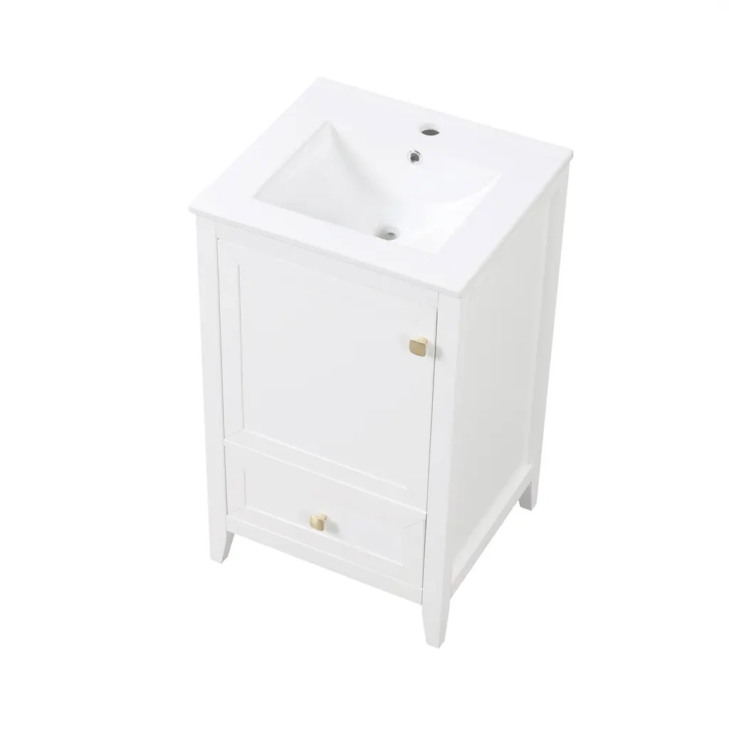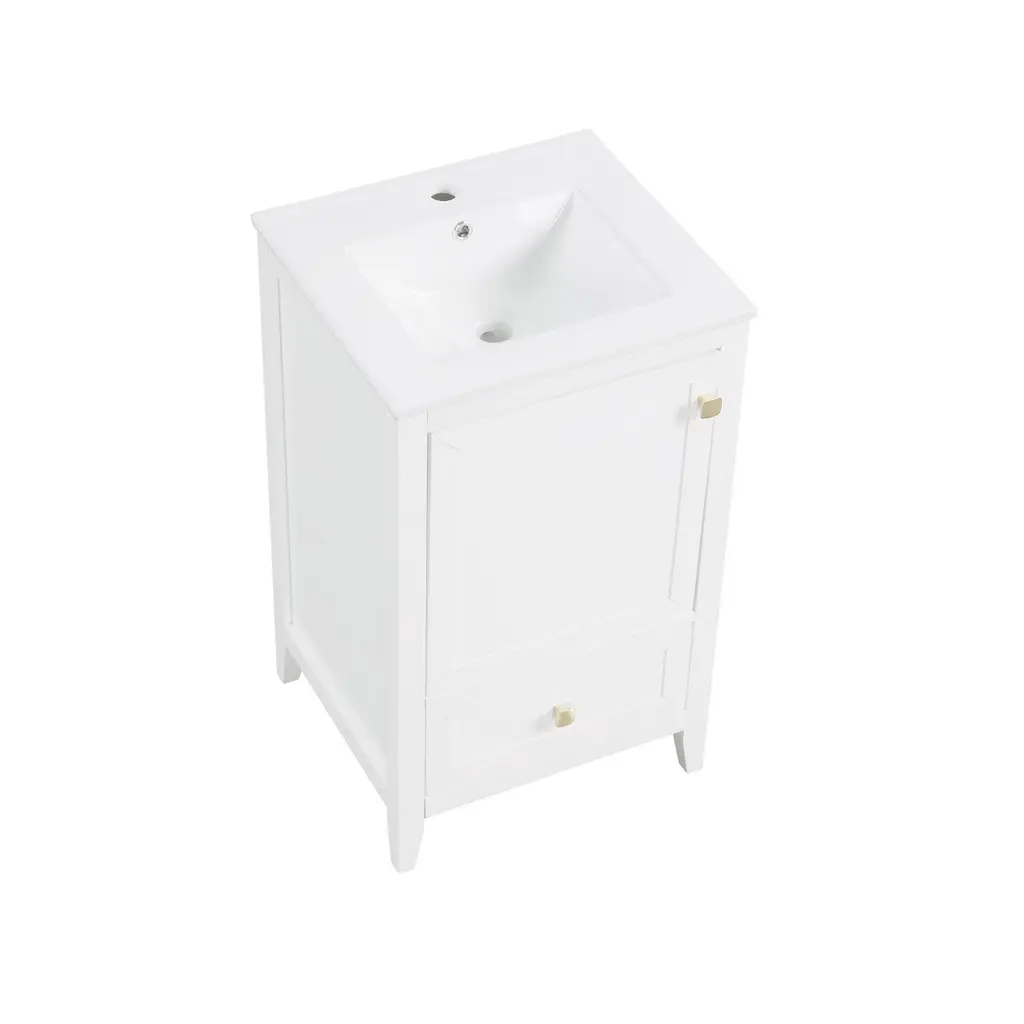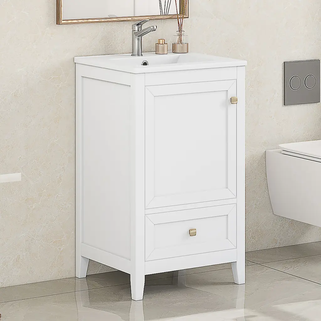 Product FeaturesMaterial - Practicality and durability is important to bathroom facilities, so we use real wood and MDF boards for this product, which not only increases the product stability but also ensures a long-lasting use. Furthermore, the surface of this vanity cabinet is in painted finish. It is water-proof, stain proof and very easy to clean.Semilune Ceramic Sink: The elegant white ceramic sink with rounded basin is equipped with an integrated overflow and three hole faucet mount. Half-moon shaped design ceramic sink extends boundary almost to the edge to make a large sink. Ceramic is so easy to clean that you can keep it smooth and shinning effortlessly.Vanity with Cabinet & Door Shelf & A Drawer - This bathroom vanity has ample storage space: one cabinet with door, and a big drawer. You can put soaps, towels, shampoos, tissue paper and other bathroom essentials in it so to keep them away from dust.Thoughtful Details: Considering the humid environment in the bathroom, the door hinges and handle are made of stainless steel, which is not easy to rust. In order to keep silent when open and closing the door, Magnetic door stoper is selected for this cabinet. Retro dark gold on the door, creating a modern look that is smooth to the touch and pleasant to use.Assembly Required - This bathroom vanity with sink, needs assembly, is in one package. All the hardware and instruction manual are provided.