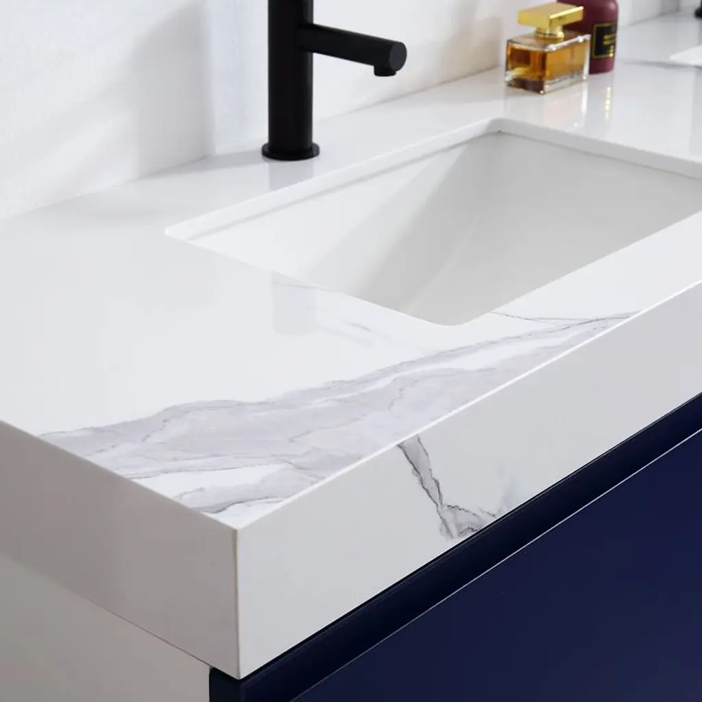 Top is made from a premium grade solid surface. Engineered hardwood frame and drawers in a Navy Blue finish. All wood is kiln-dried for added durability. 2 drawers open on metal glides. 2 drilled faucet holes. Sink is UPC™ certified (included). Faucets not included. Drain stops shipped in Chrome finish, not Black as pictured. Professional plumber and contractor installation required. Engineered for bathroom environments. Metal fixtures won't corrode and panels are sealed during finishing to protect against moisture. Made in China.