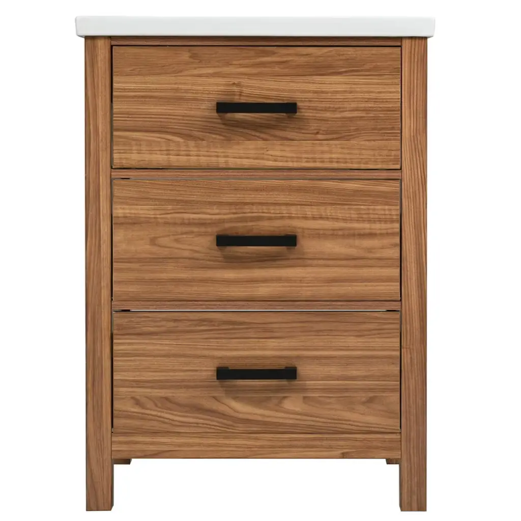 Transform your bathroom with this elegant 24-inch modern bathroom vanity. Designed for both style and function, this freestanding cabinet features a sleek ceramic basin sink, elevating your space with a touch of sophistication. With three spacious drawers, you'll enjoy ample storage for all your essentials, keeping your bathroom tidy and organized. The contemporary design blends seamlessly with various décor styles, making it a versatile addition to your home. Perfect for smaller spaces, this vanity provides style and functionality without compromising on quality. Experience the ideal combination of modern aesthetics and practicality.