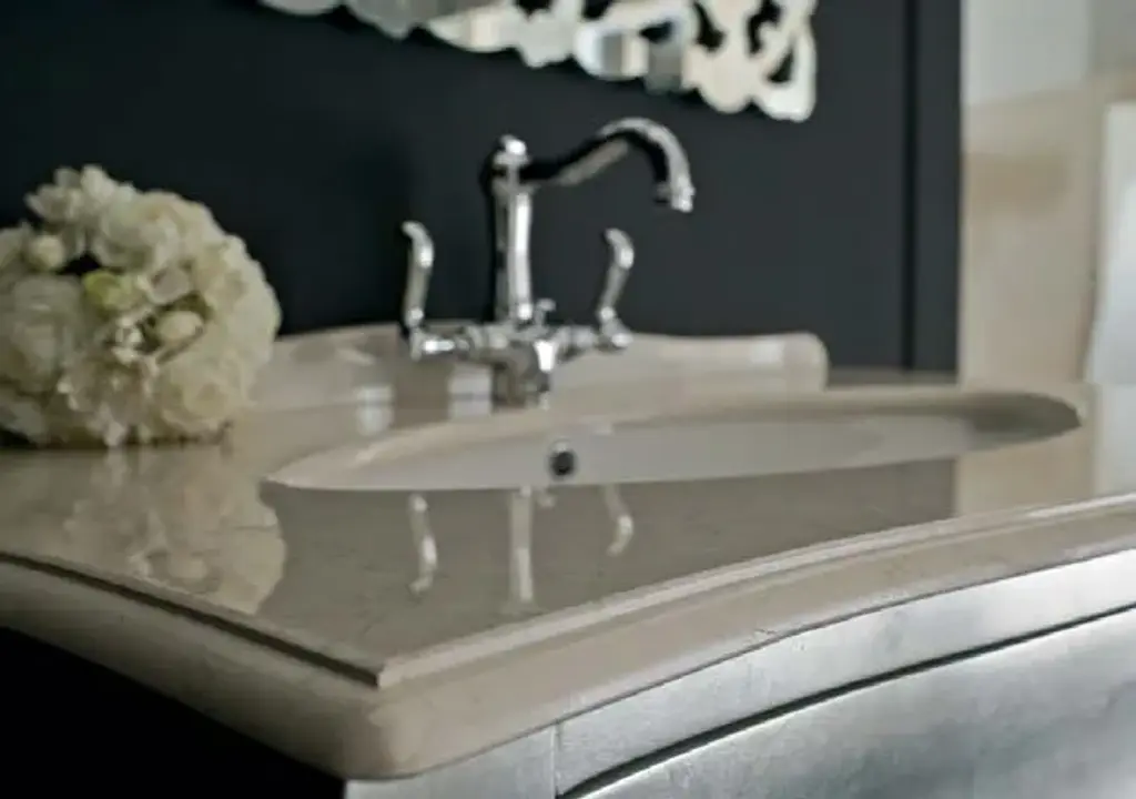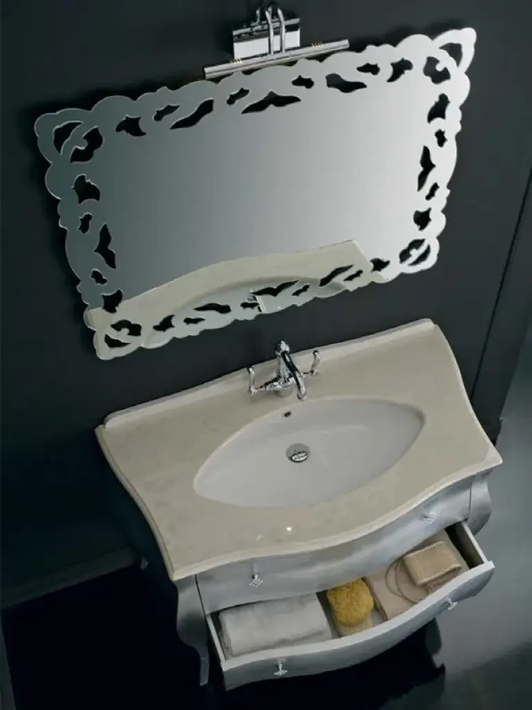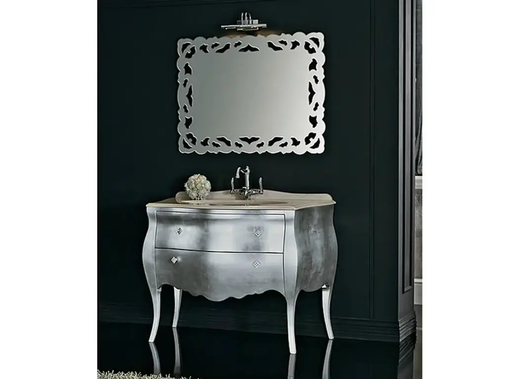 BELLAGIO 1 by Lasa Idea is a classical style washbasin unit composed of:BE100 - Washbasin base 110 x 57.5 x H 83 cmBE-TOP - Trani Marble Top UndertopBE-ALZ - Trani Marble backsplash LUNA - Luna ceramic washbasinBE0010 - Mirror 100 x H 74 cmGP40 - Applique GP40 chromeFinish: silver leaf.Trani marble top and backsplash.Class and elegance, magnificence and wealth, past and present come together to create the Bellagio collection, a choice of furnishing suited to both a classic and modern setting.