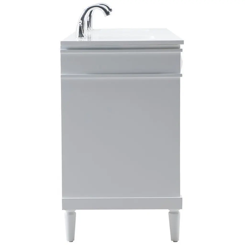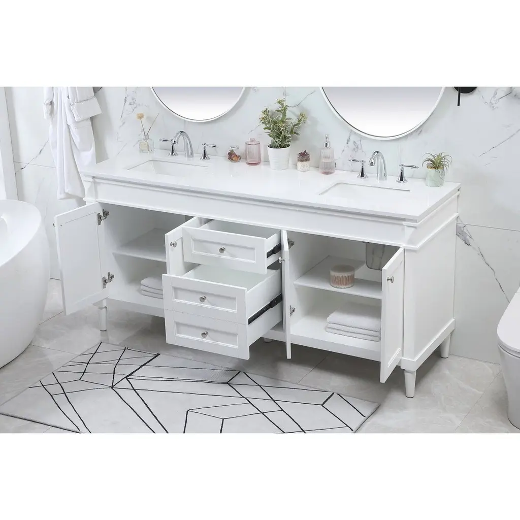This transitional vanity is a beautiful piece of bathroom furniture will look amazing in your design scheme. The cabinet features a shaker style smooth door panel with simple round knobs and soft close hinges provide ample room for accessories. Packed with multiple side drawers with soft close glides for added comfort and full access to bath supplies. Convenient deep drawer stores all of your tall bath essentials. Constructed of engineered wood and solid wood legs with hand painted finish. The durable quartz countertop is a versatile material in an ivory white finish. Minor assembly of the legs needed to get this vanity up and running.