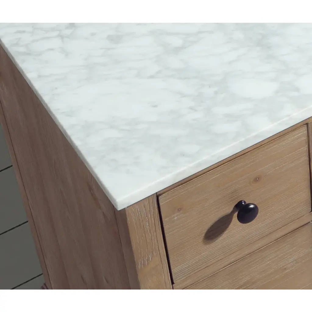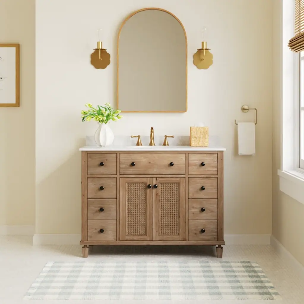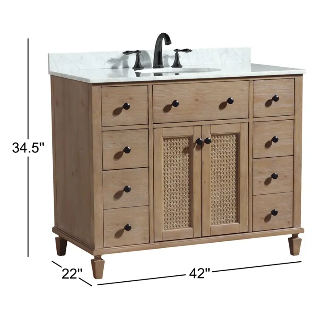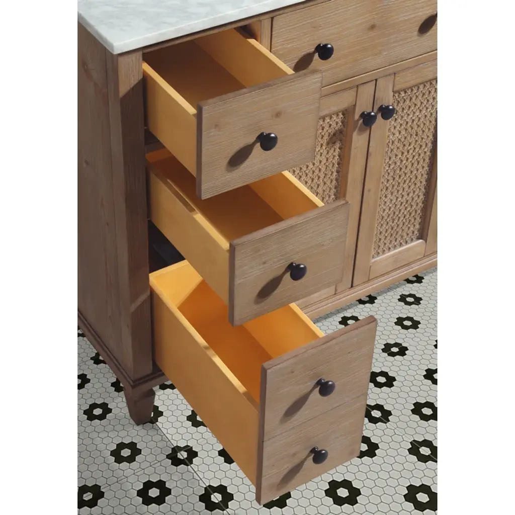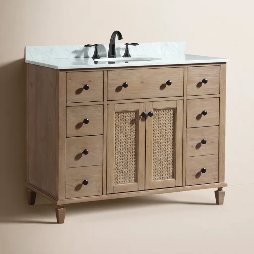 This freestanding vanity completes the look of your main or guest bathroom. It comes with a sink and backsplash, so with plumbing supplies and installation, you’re ready to wash up! The cabinet is made from solid wood with a warm finish that highlights the natural grain variation, and it stands on square tapered feet. The oval undermount sink is made from ceramic and is integrated into the Carrara marble top, leaving you plenty of room for toiletries and essentials. There are six soft-close drawers each with quality dovetail joints and a roomy cabinet that has rattan door fronts.