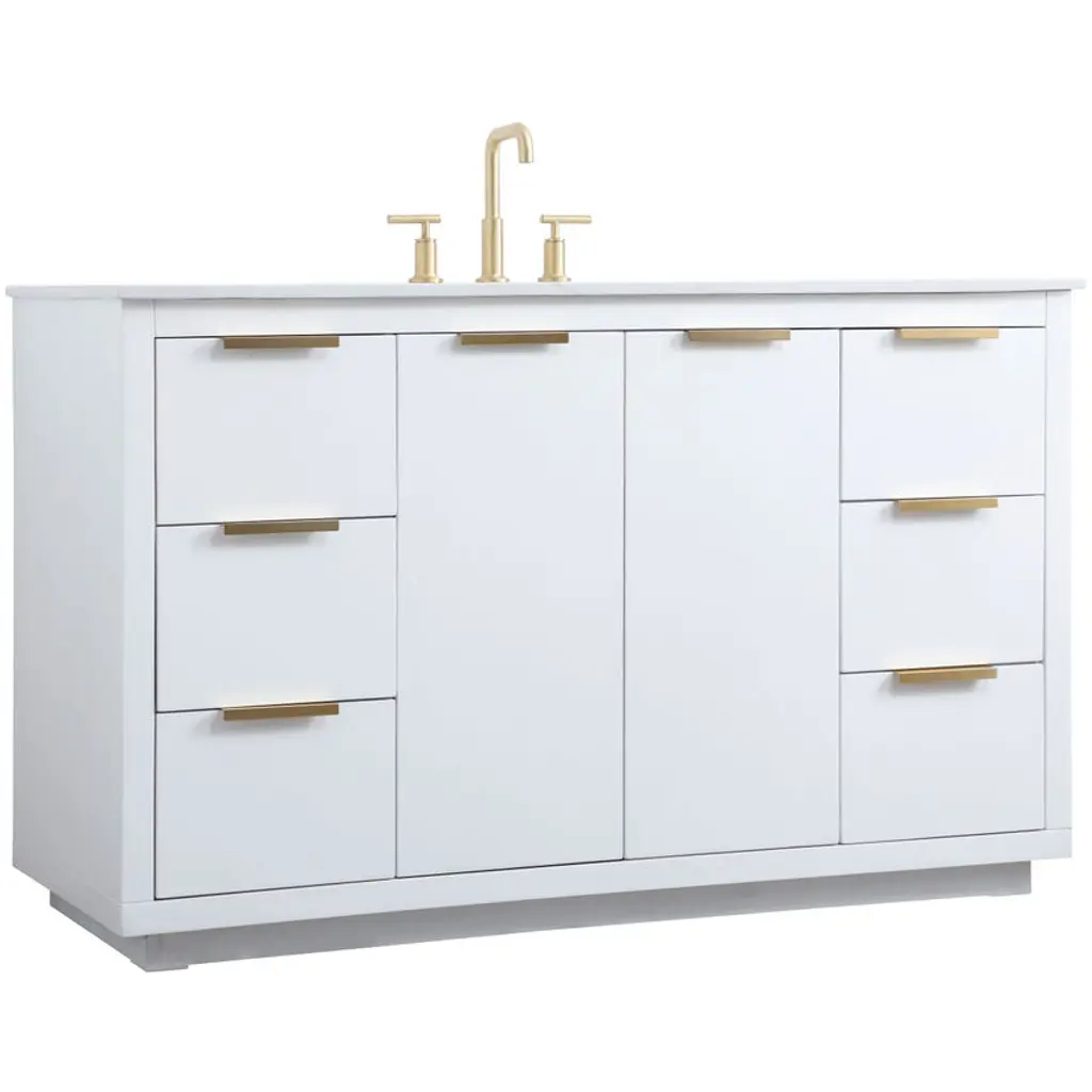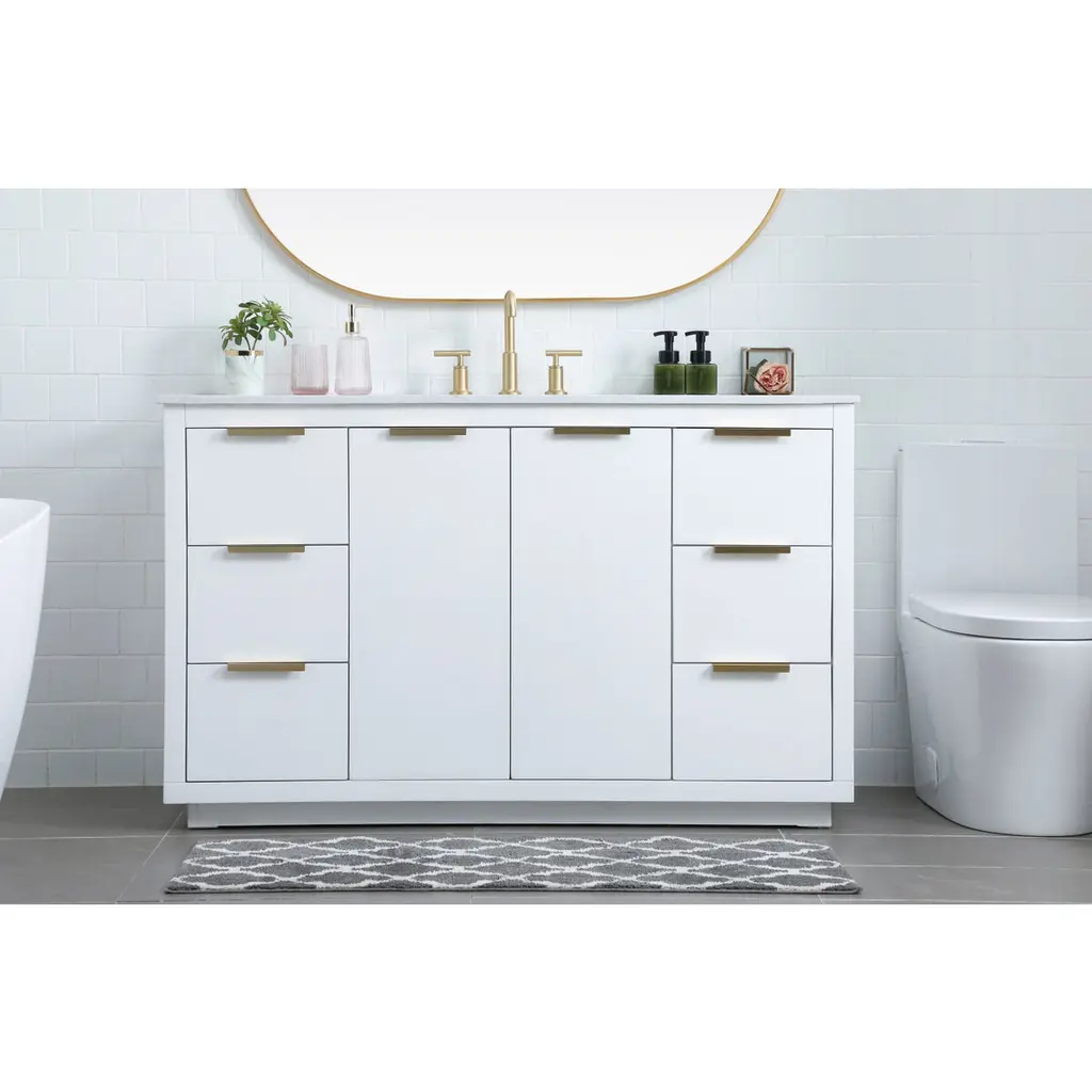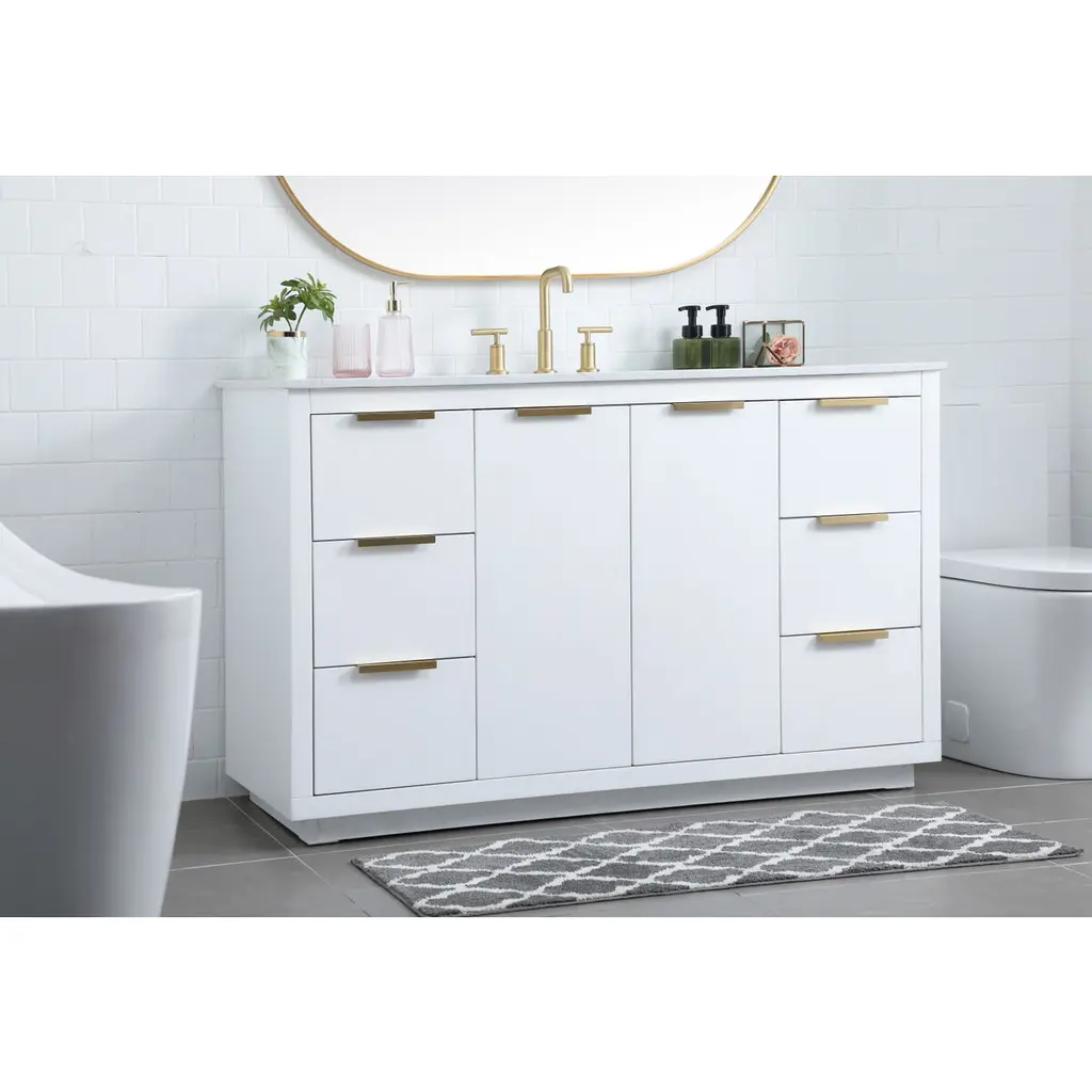 Upgrade your bathroom effortlessly with our stylish 54-inch vanity, showcasing an engineered marble top with a chic straight edge cut. The combination of six functional soft-close drawer and a convenient cabinet offers a perfect balance of design elegance and versatile storage. With an undermount porcelain sink, this vanity seamlessly blends timeless elegance with practical functionality. Adorned with sleek pulls, it adds a modern touch, enhancing the overall aesthetic. With three pre-drilled holes, it allows you to personalize your bathroom by choosing the perfect widespread faucet. Redefine your bathroom experience with this compact yet impactful vanity that optimizes space without compromising style.