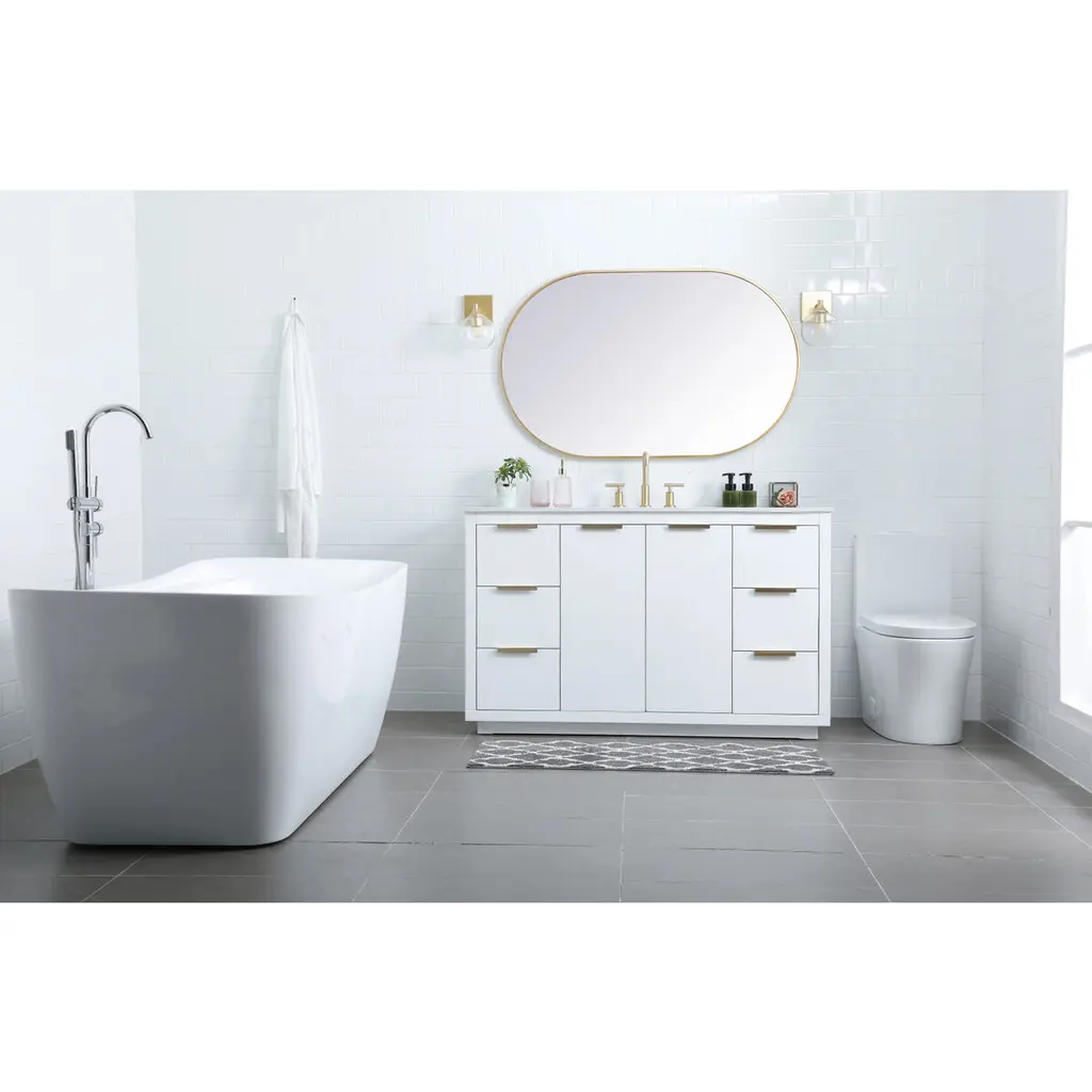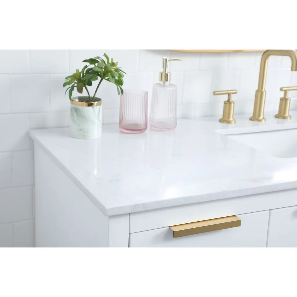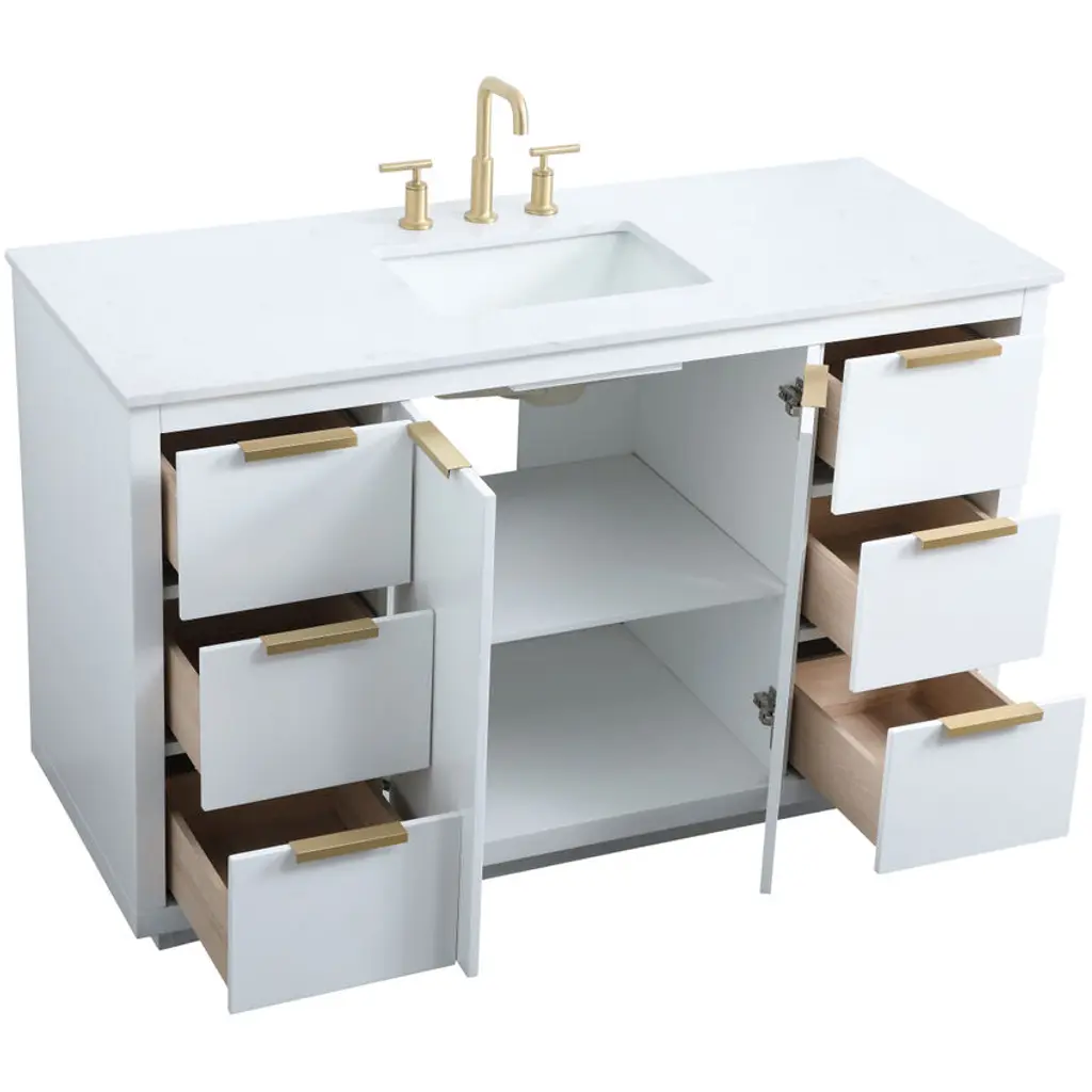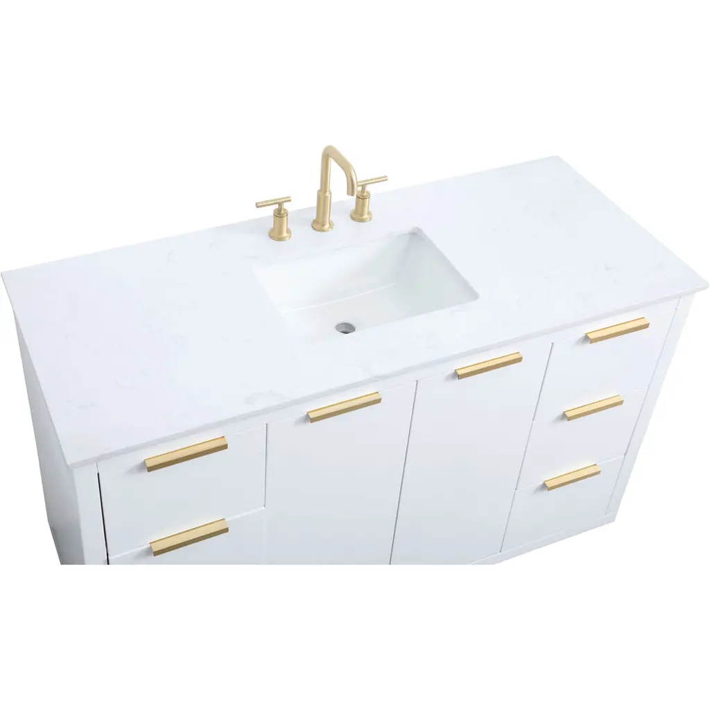 Upgrade your bathroom effortlessly with our stylish 54-inch vanity, showcasing an engineered marble top with a chic straight edge cut. The combination of six functional soft-close drawer and a convenient cabinet offers a perfect balance of design elegance and versatile storage. With an undermount porcelain sink, this vanity seamlessly blends timeless elegance with practical functionality. Adorned with sleek pulls, it adds a modern touch, enhancing the overall aesthetic. With three pre-drilled holes, it allows you to personalize your bathroom by choosing the perfect widespread faucet. Redefine your bathroom experience with this compact yet impactful vanity that optimizes space without compromising style.