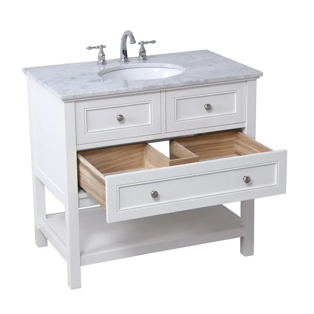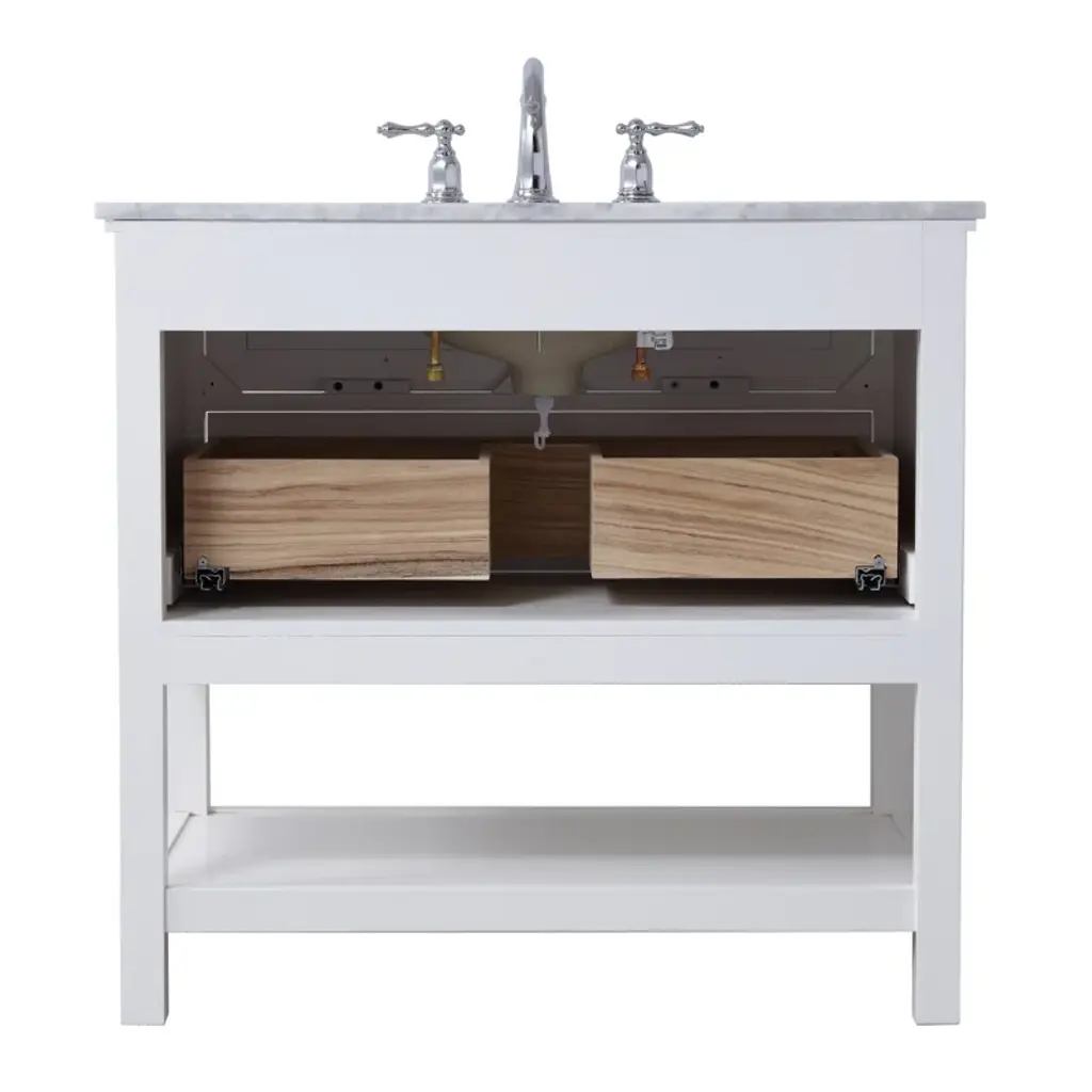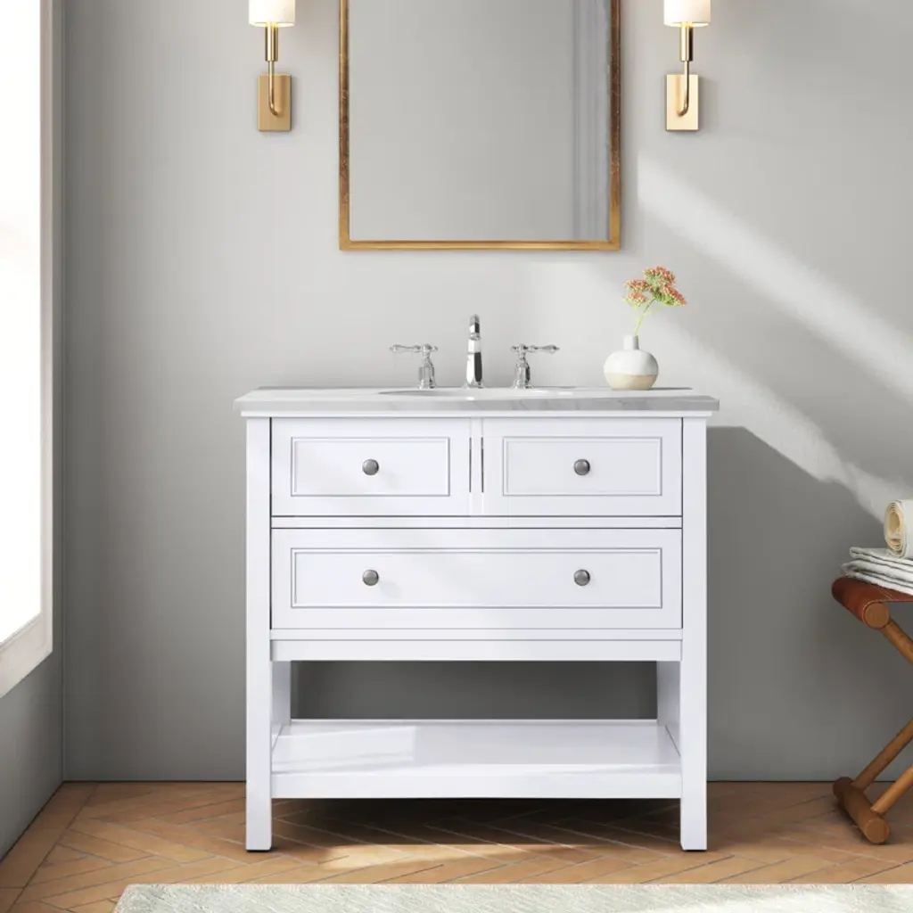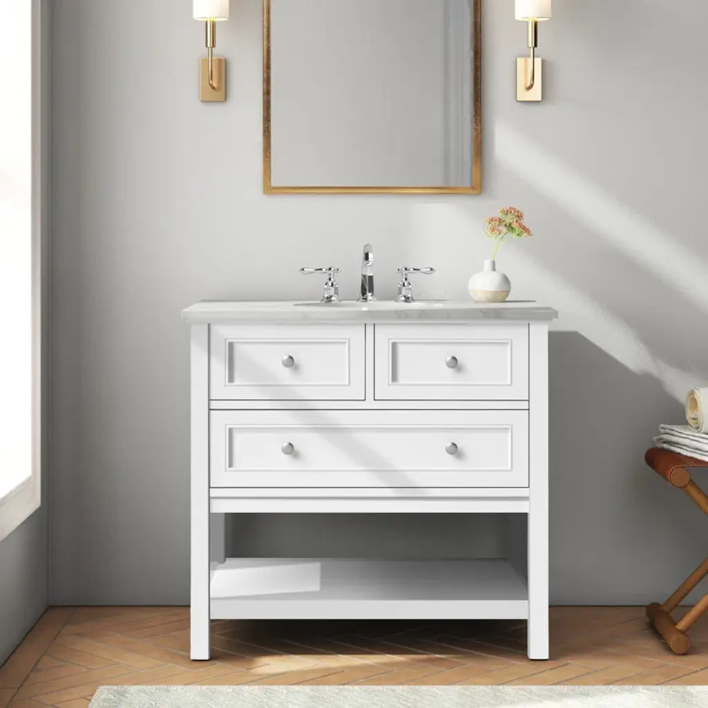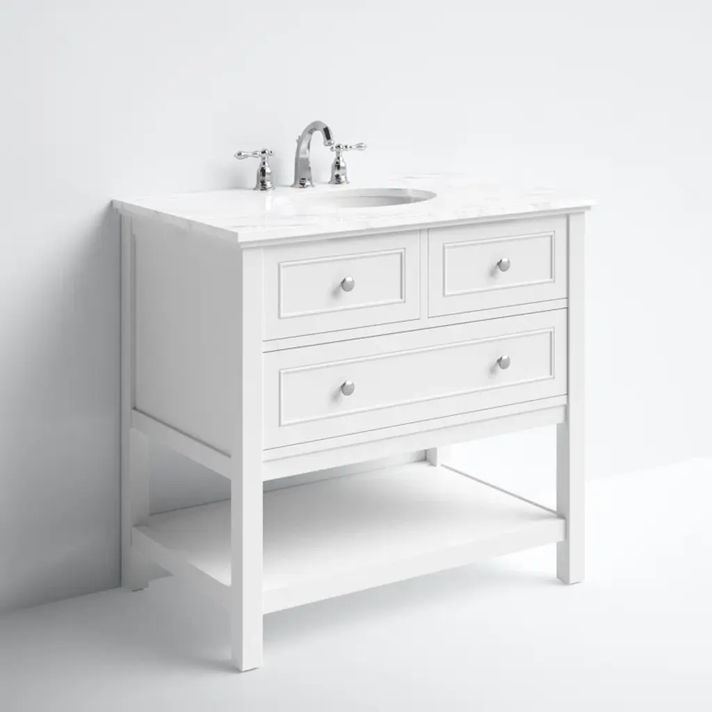 Spa day, every day. Carve out your own self-care retreat at home with our freestanding vanity. The marble countertop frames an under-mount porcelain sink for a traditional look, while the single drawer down below keeps your bathroom essentials out of sight. Plus, the lower shelf is ideal for fluffy towels and decorative baskets, and the open countertop pairs perfectly with your favorite scented candle. Accommodates an 8’’ widespread faucet (sold separately).