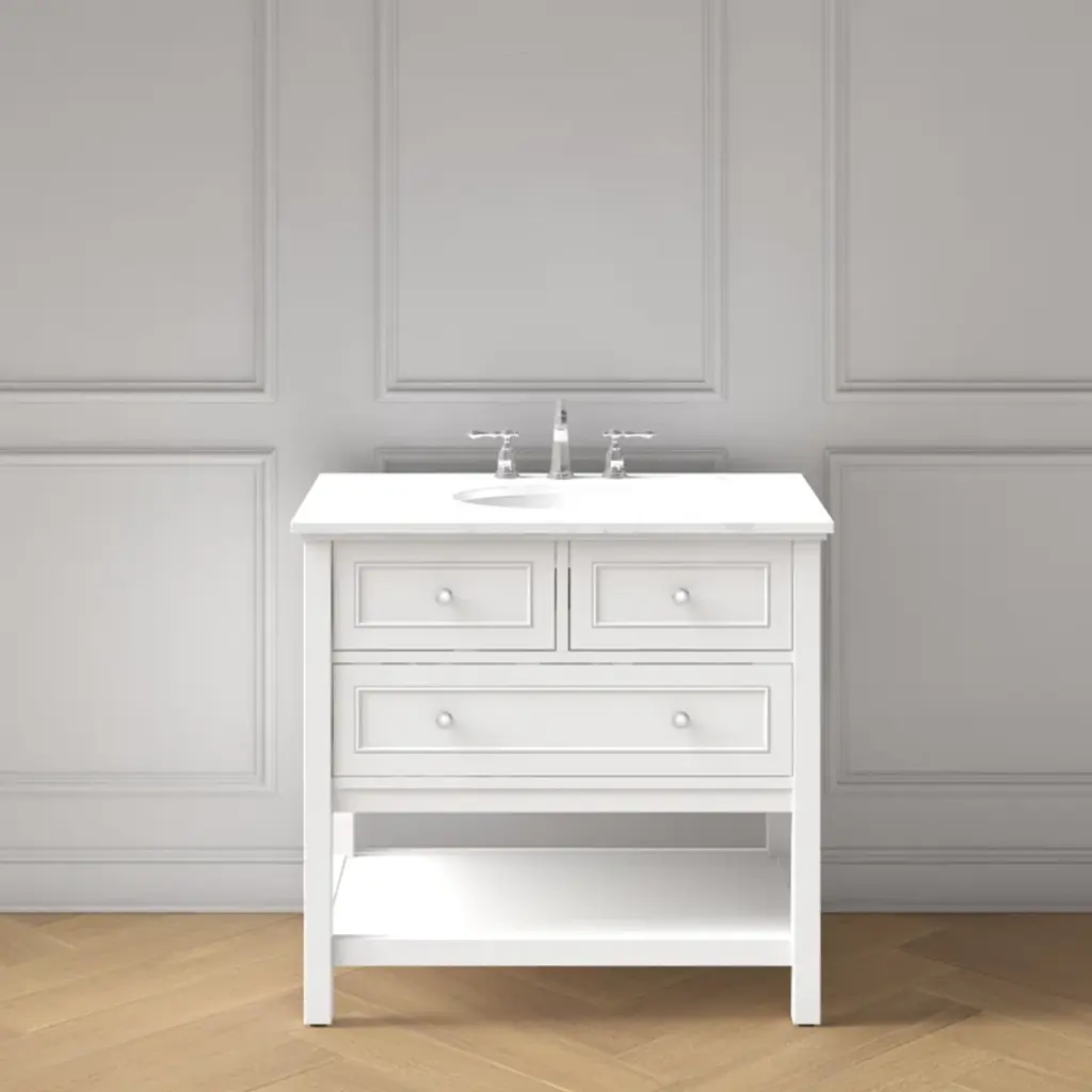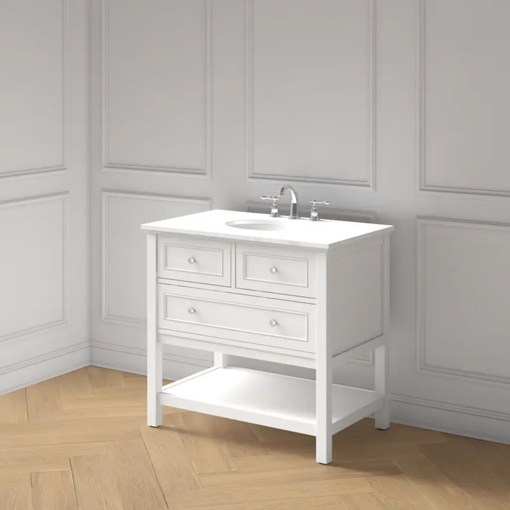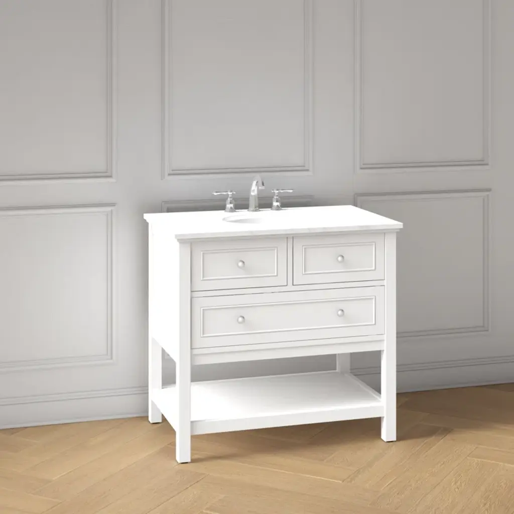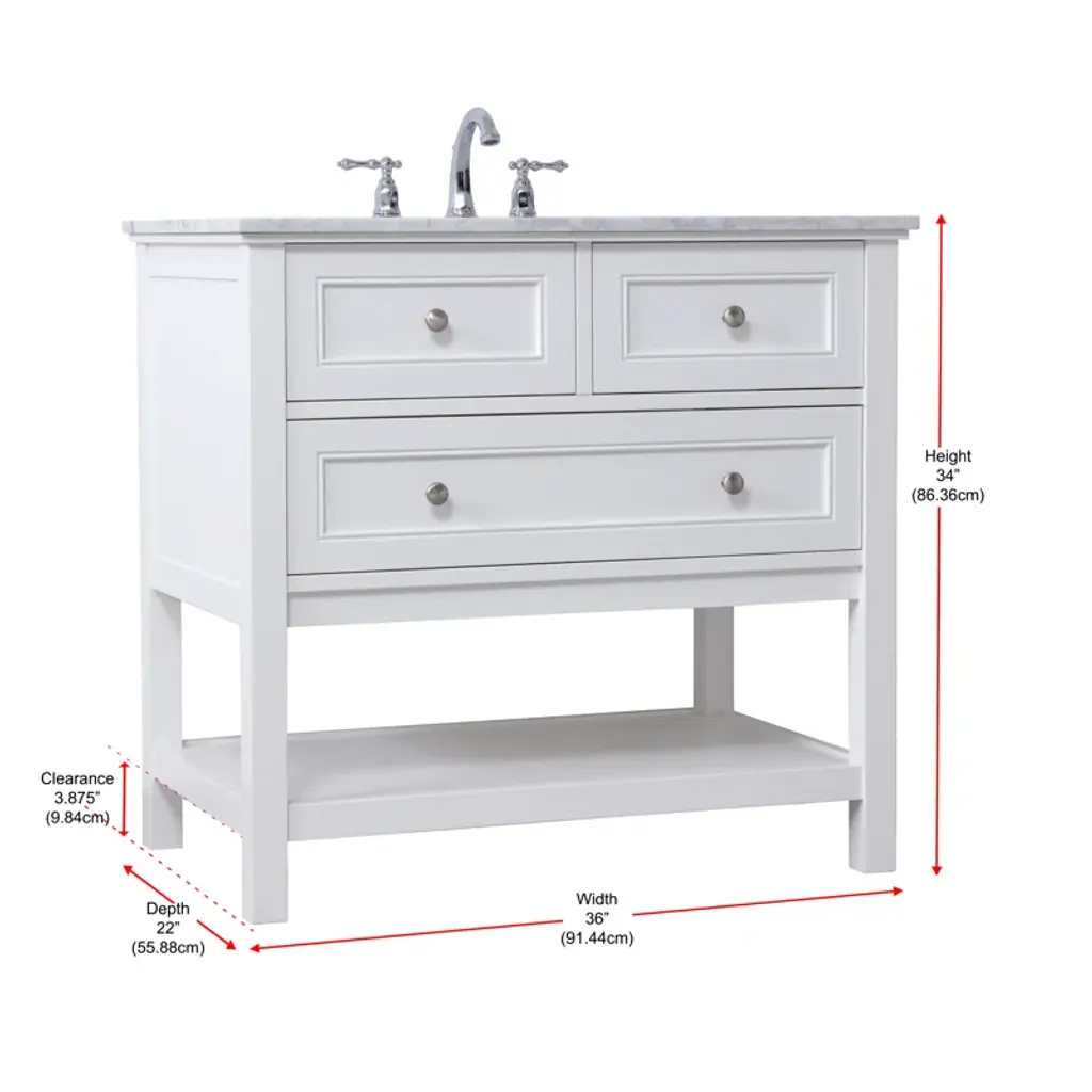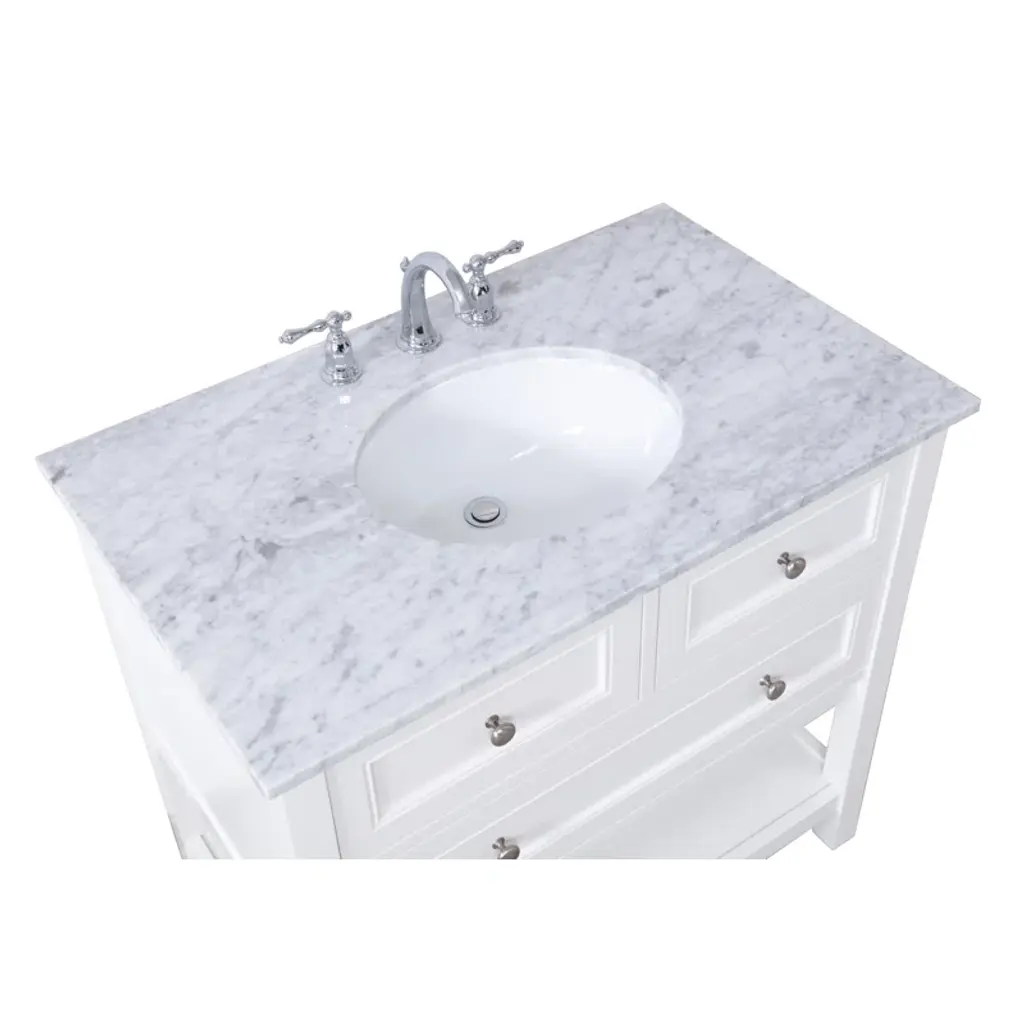 Spa day, every day. Carve out your own self-care retreat at home with our freestanding vanity. The marble countertop frames an under-mount porcelain sink for a traditional look, while the single drawer down below keeps your bathroom essentials out of sight. Plus, the lower shelf is ideal for fluffy towels and decorative baskets, and the open countertop pairs perfectly with your favorite scented candle. Accommodates an 8’’ widespread faucet (sold separately).