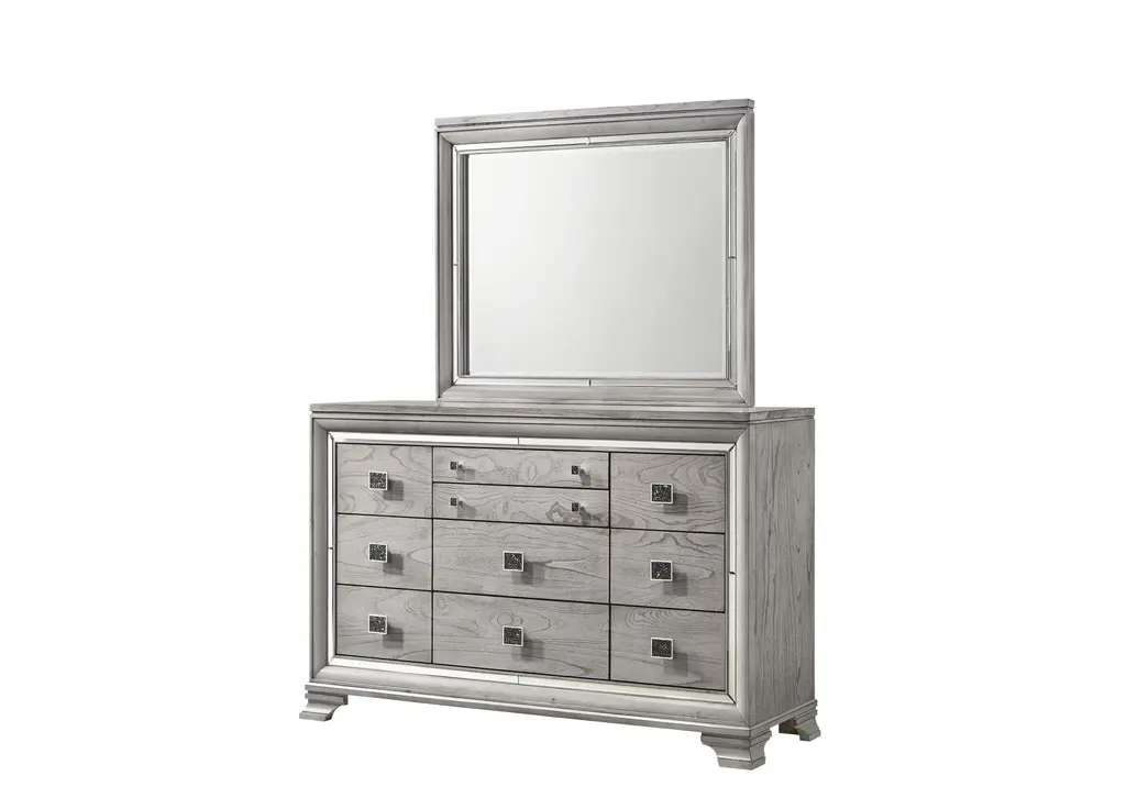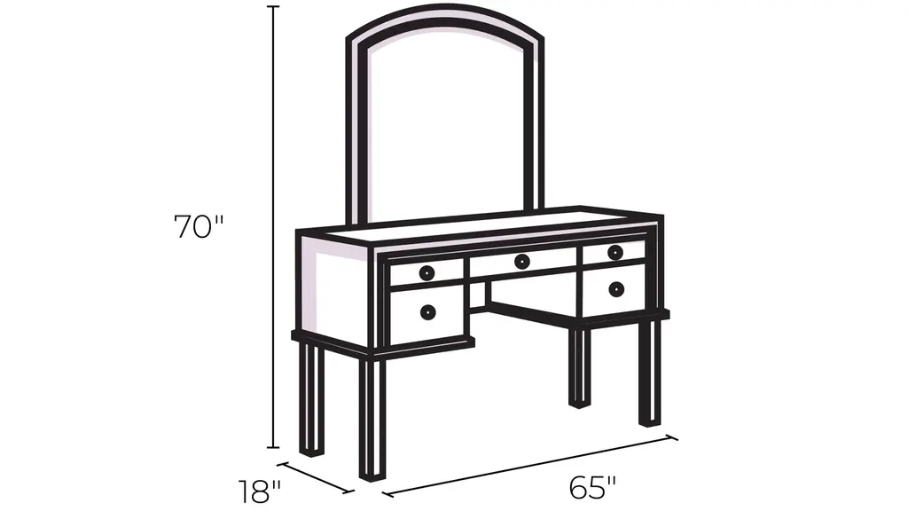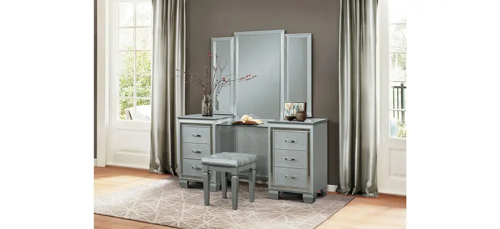 Glamour reigns in the design of the Brambley vanity. Each piece is framing a decorative beveled mirror accent that enhances illumination. Alligator embossing and high polished crystal elevates hardware boldly accent the finish - over mindy veneer - of the collection. The vanity features behind-the-mirror jewelry hooks, drawer storage, tri-fold mirror and a glass shelf that connects the drawer units.