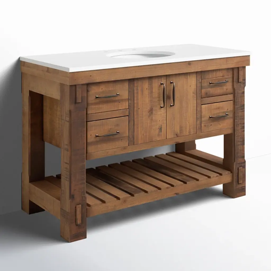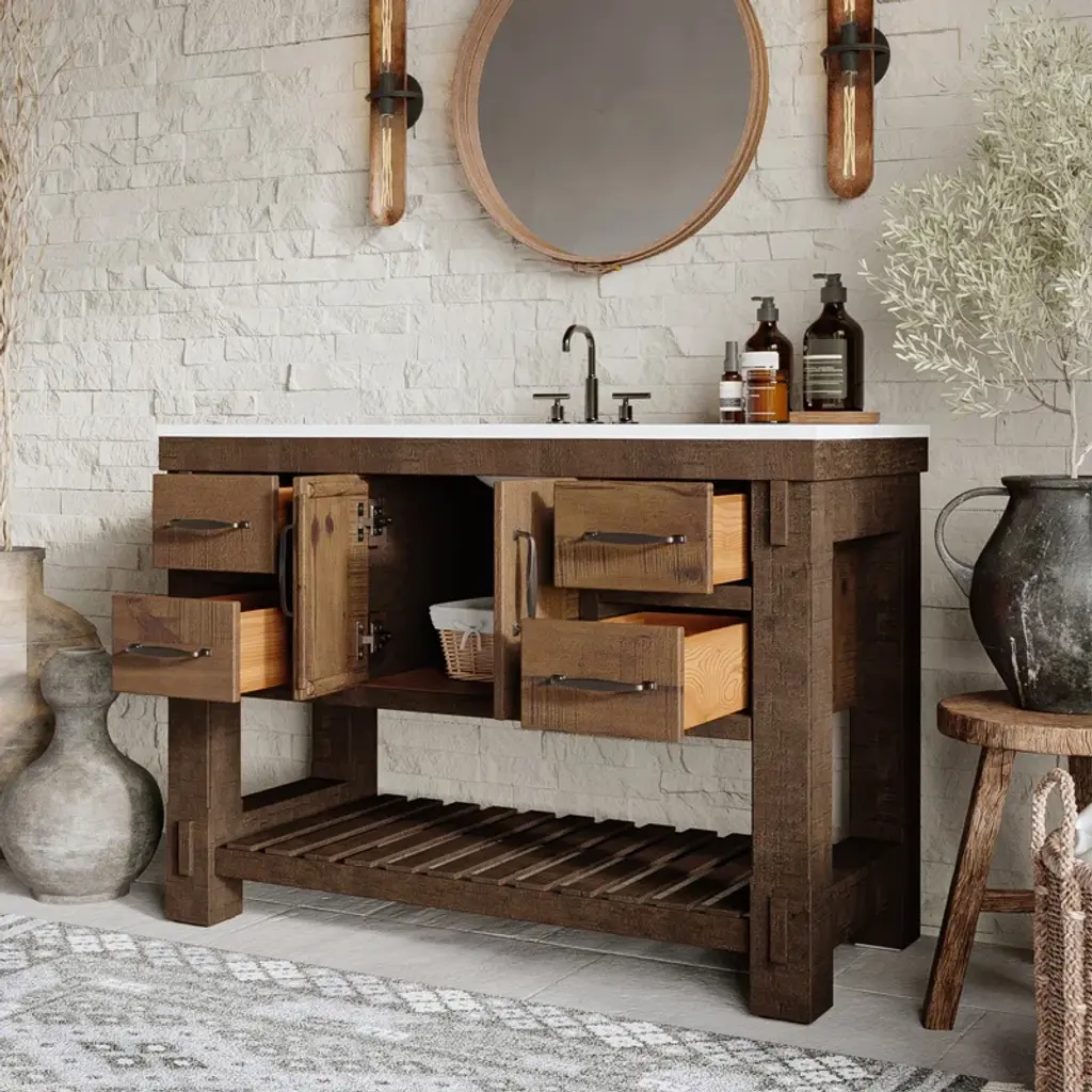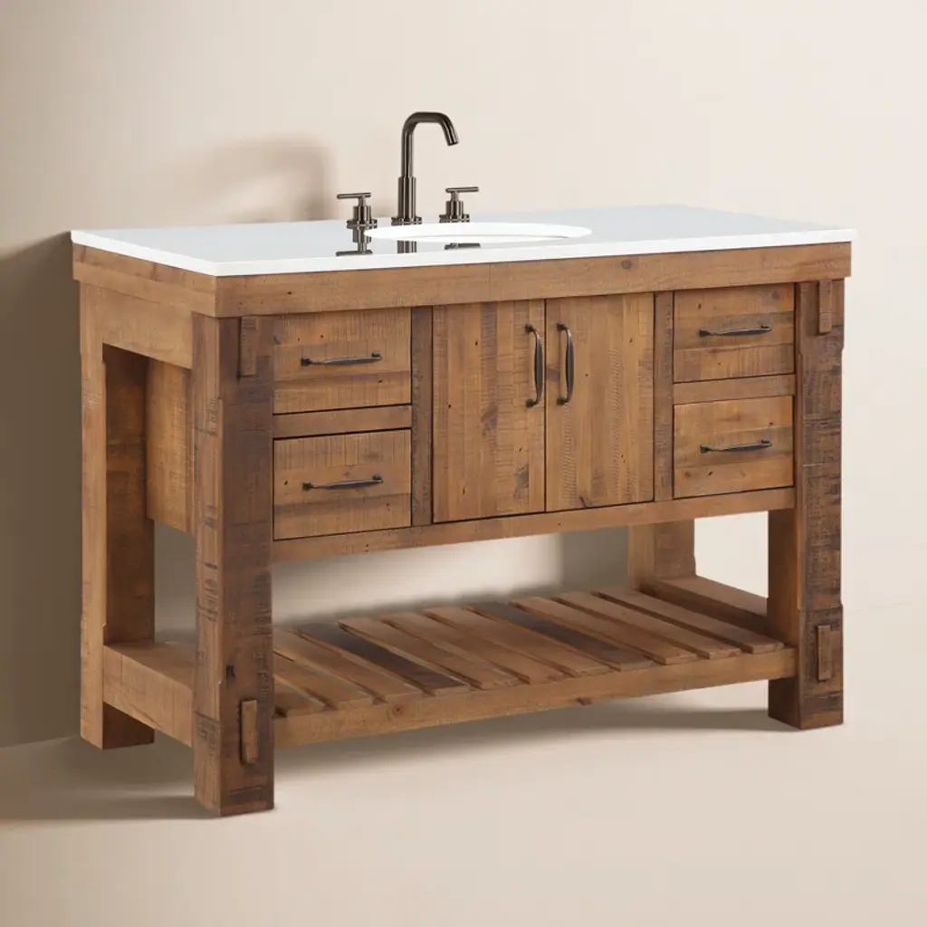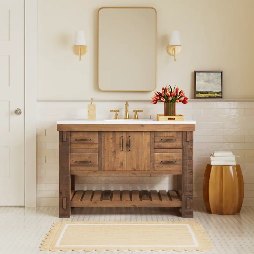 Bring farmhouse charm into your bathroom but with the benefit of modern conveniences. This sturdy vanity will last for years to come. It features pure white quartz with a matte finish top resting upon a solid pine, hand-finished frame. Ample storage is provided by soft-close drawers built with dovetail joinery.