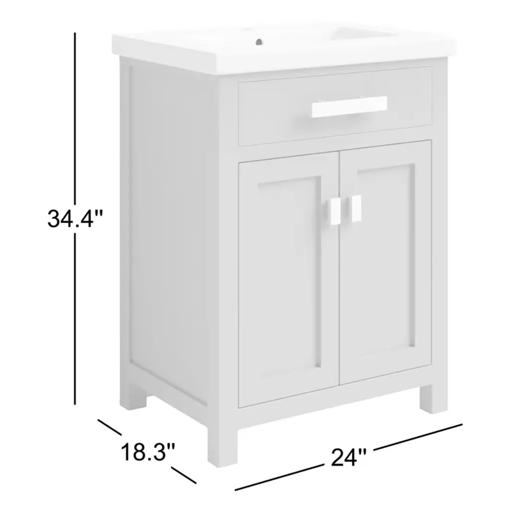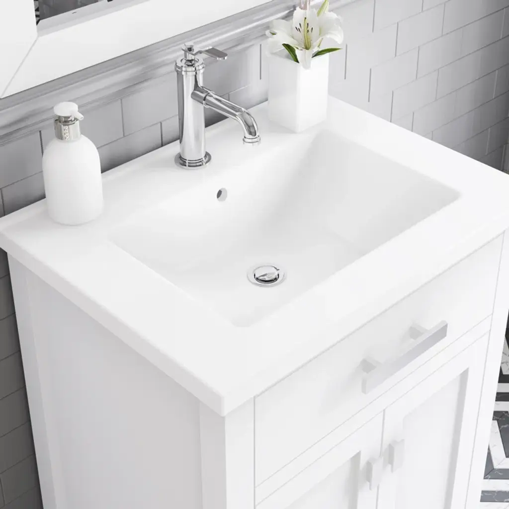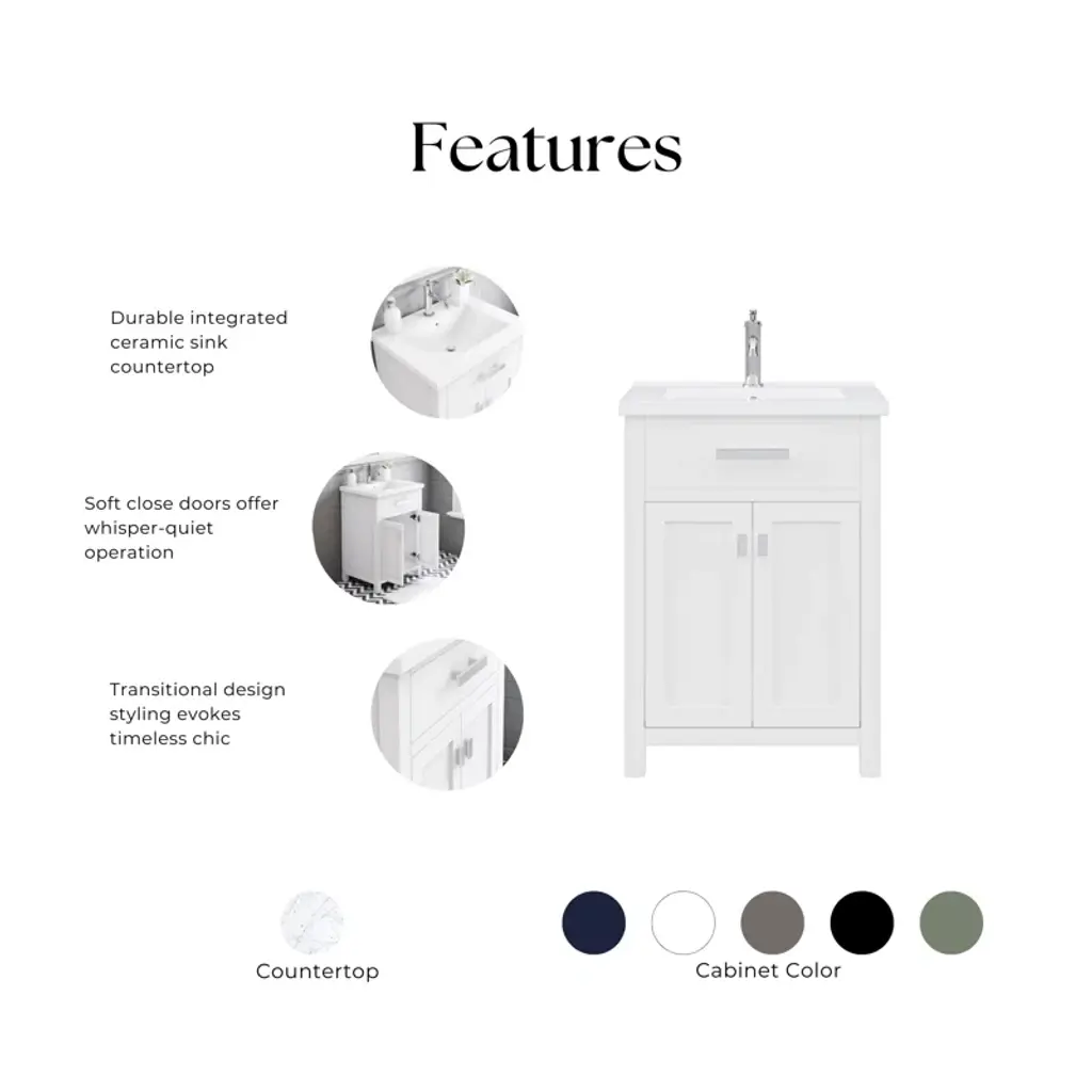 Elevate your bathroom with this sleek and minimalist vanity. With an integrated ceramic sink and soft-close door hinges, it combines style and convenience. The rectangular sink shape and brushed chrome hardware finish add a modern touch. Install a single-hole faucet for a seamless look.