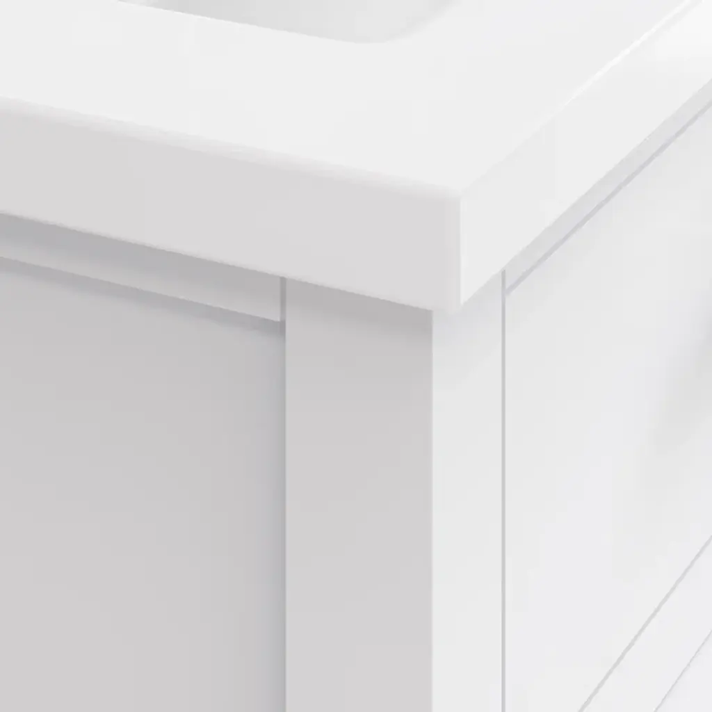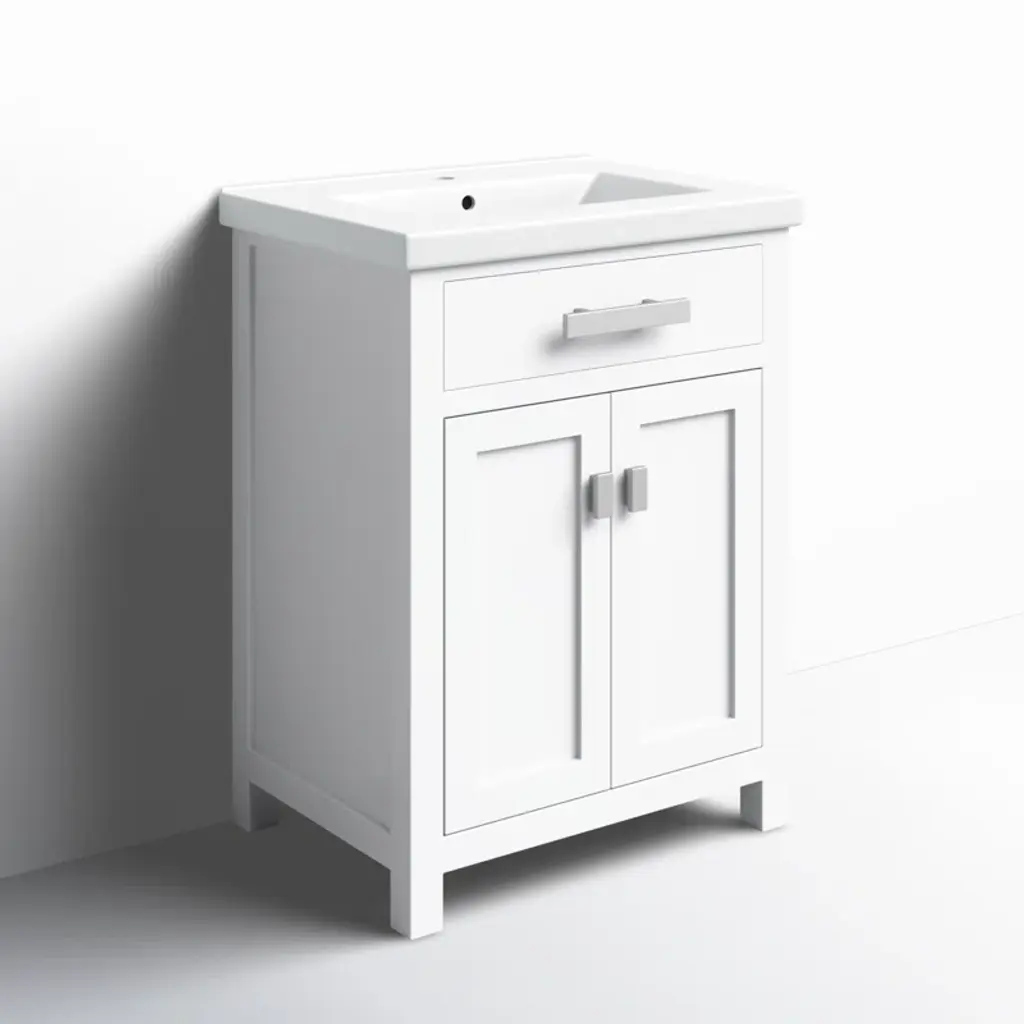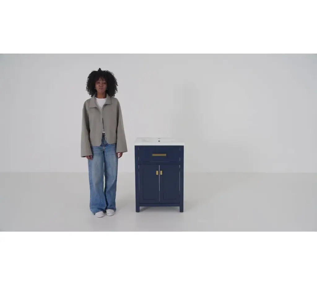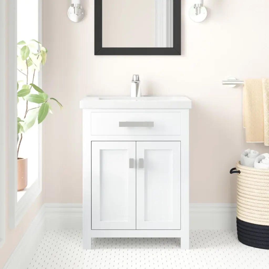 Elevate your bathroom with this sleek and minimalist vanity. With an integrated ceramic sink and soft-close door hinges, it combines style and convenience. The rectangular sink shape and brushed chrome hardware finish add a modern touch. Install a single-hole faucet for a seamless look.