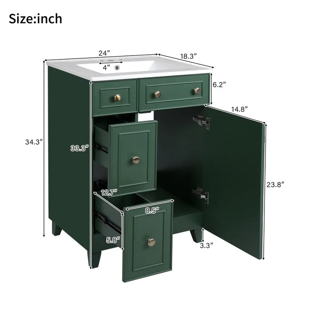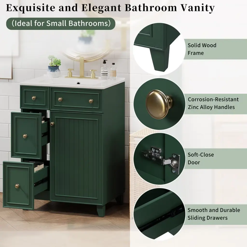 Cavinas 24"w Bathroom Vanity Cabinet With Ceramic Sink,freestanding Single Vanity Set With 2 Drawers And Soft-close Door,frosty Green