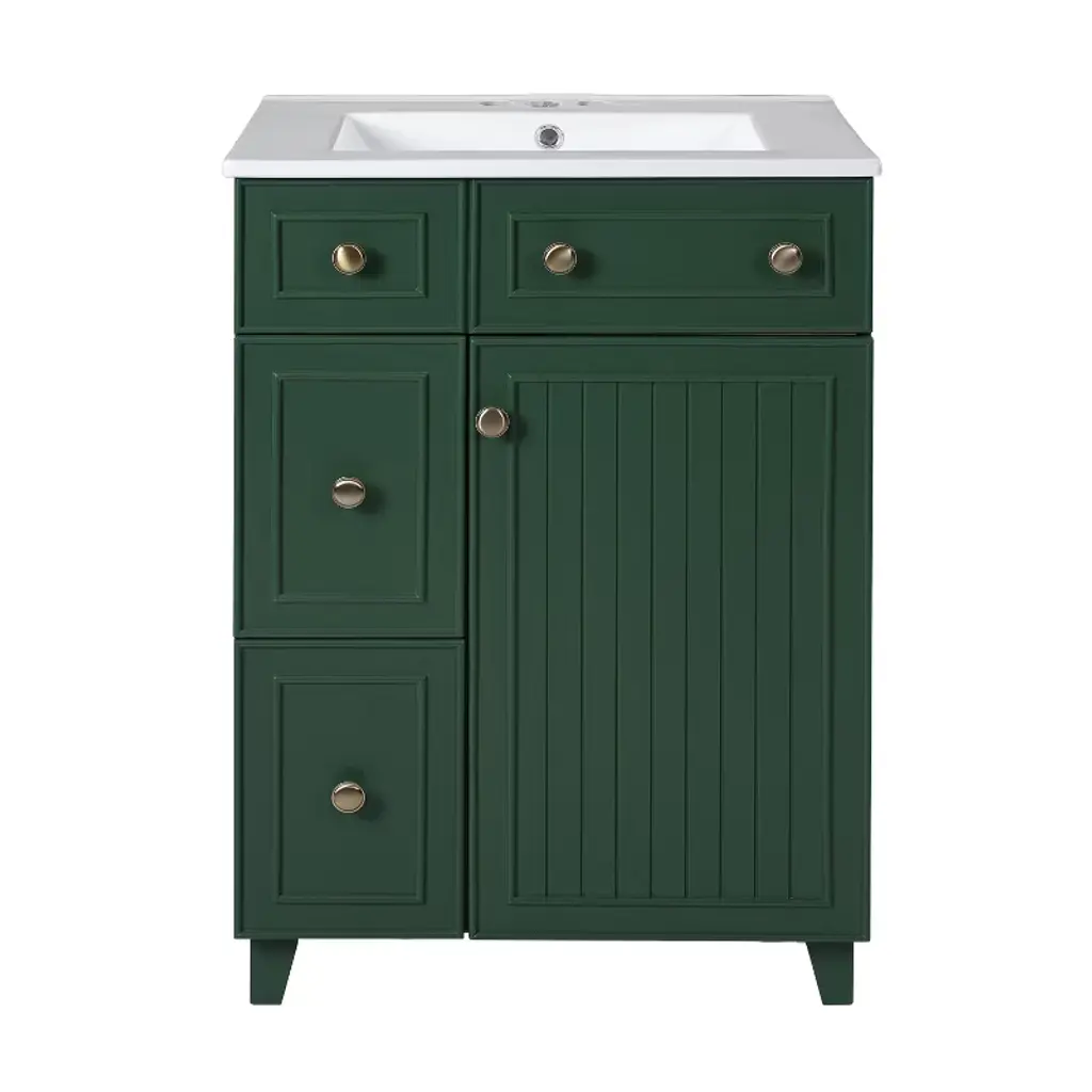 Designed for compact bathrooms, this vanity maximizes space with an efficient profile that offers substantial storage without compromising style. It features a dual storage system with two spacious drawers and a cabinet door to keep all essentials organized and accessible. The low-maintenance surfaces include an easy-clean MDF exterior and a stain-resistant ceramic basin for effortless upkeep. Constructed from robust MDF with solid wood feet for stability, it is accentuated by chic golden round handles that add a refined touch. Assembly is quick and straightforward with clear instructions and pre-designed components, allowing two people to set it up in about an hour for immediate use.