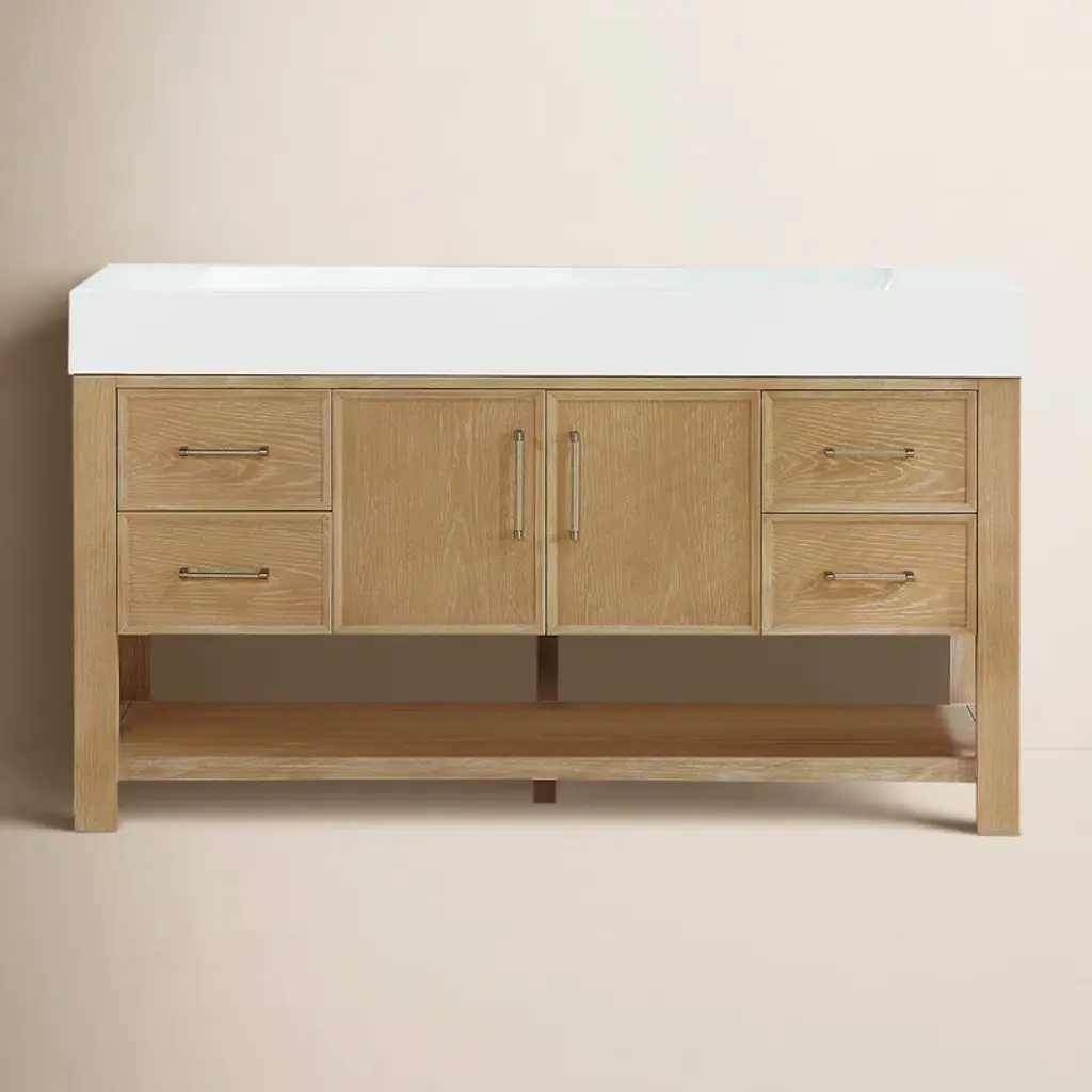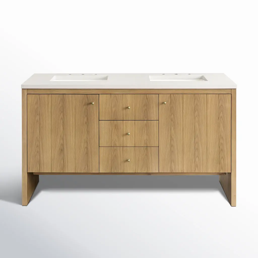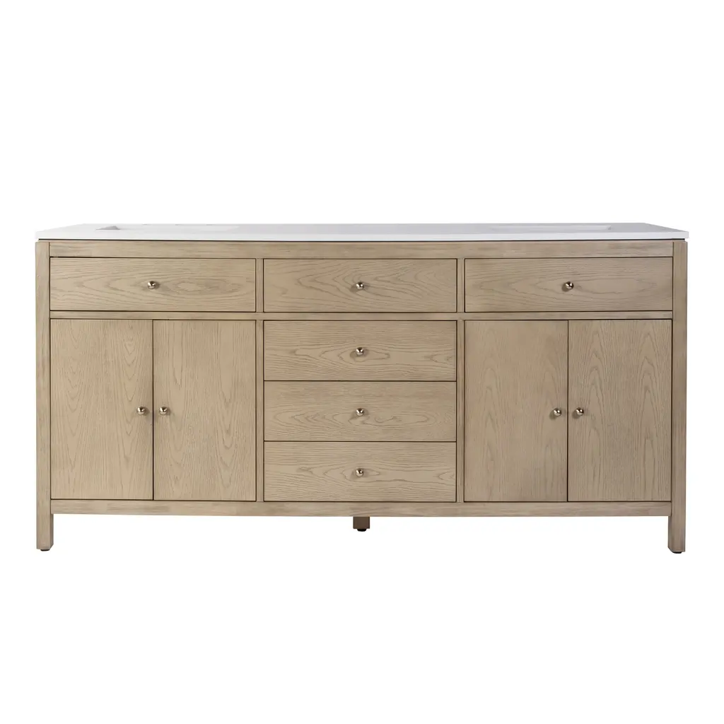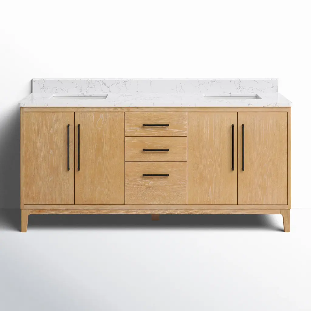 Upgrade your bathroom with the expertly crafted 72 Inch Double Sink Vanity, designed for both residential and commercial use. This stylish yet functional piece features soft-close drawers, an interior cabinet with two adjustable shelves, and a pristine quartz countertop for a sophisticated touch. The finish with natural grain variations adds warmth and character, while removable hardware allows for customization. Built for durability and elegance, this vanity seamlessly enhances both private homes and high-traffic commercial spaces like hotels and upscale offices with its timeless design and modern convenience.