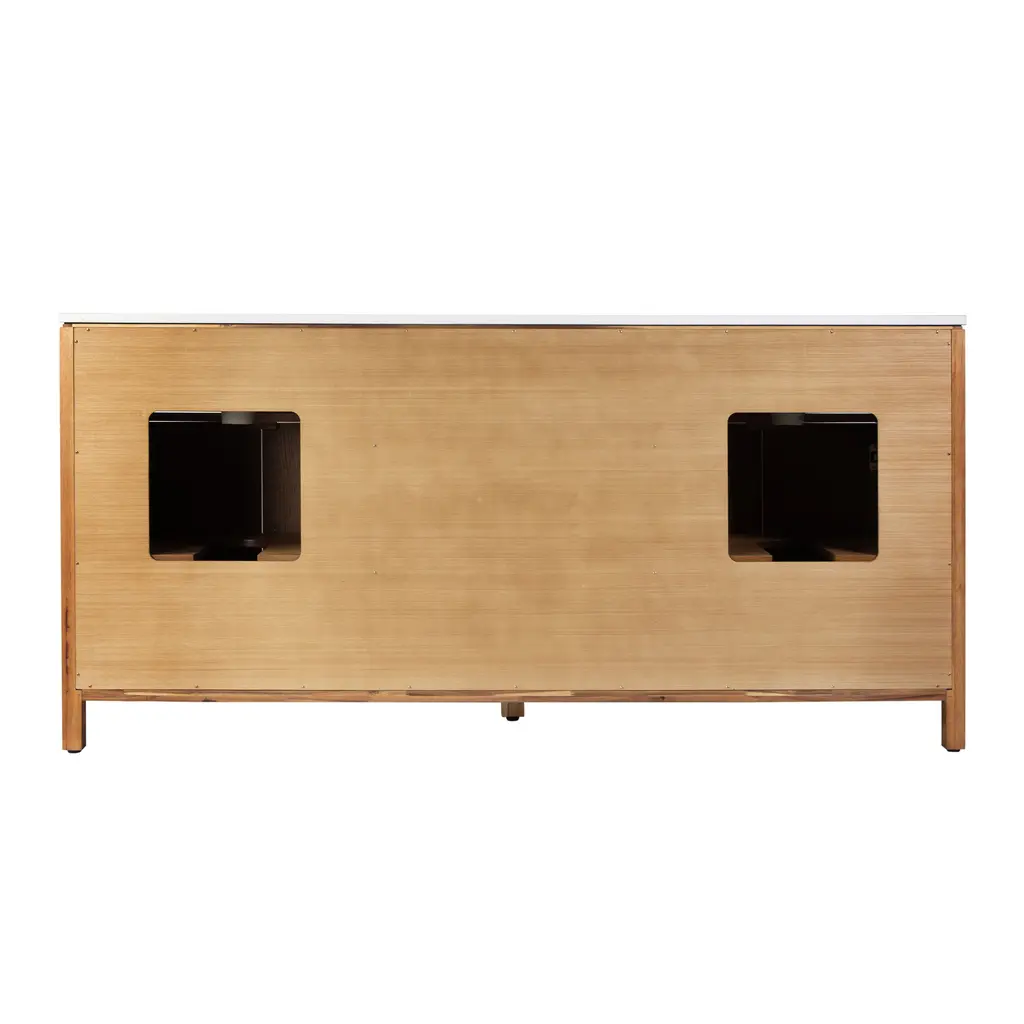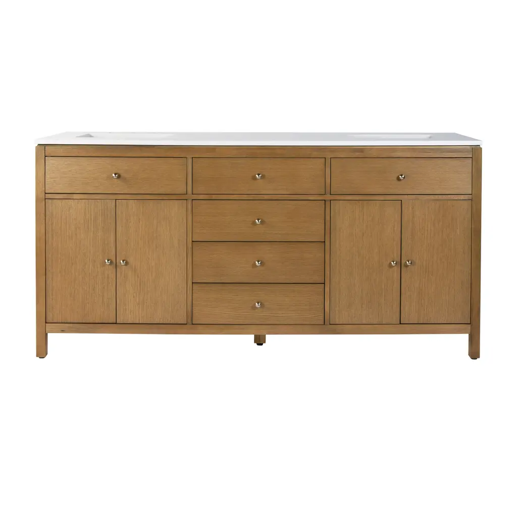 Upgrade your bathroom with the expertly crafted 72 Inch Double Sink Vanity, designed for both residential and commercial use. This stylish yet functional piece features soft-close drawers, an interior cabinet with two adjustable shelves, and a pristine quartz countertop for a sophisticated touch. The finish with natural grain variations adds warmth and character, while removable hardware allows for customization. Built for durability and elegance, this vanity seamlessly enhances both private homes and high-traffic commercial spaces like hotels and upscale offices with its timeless design and modern convenience.