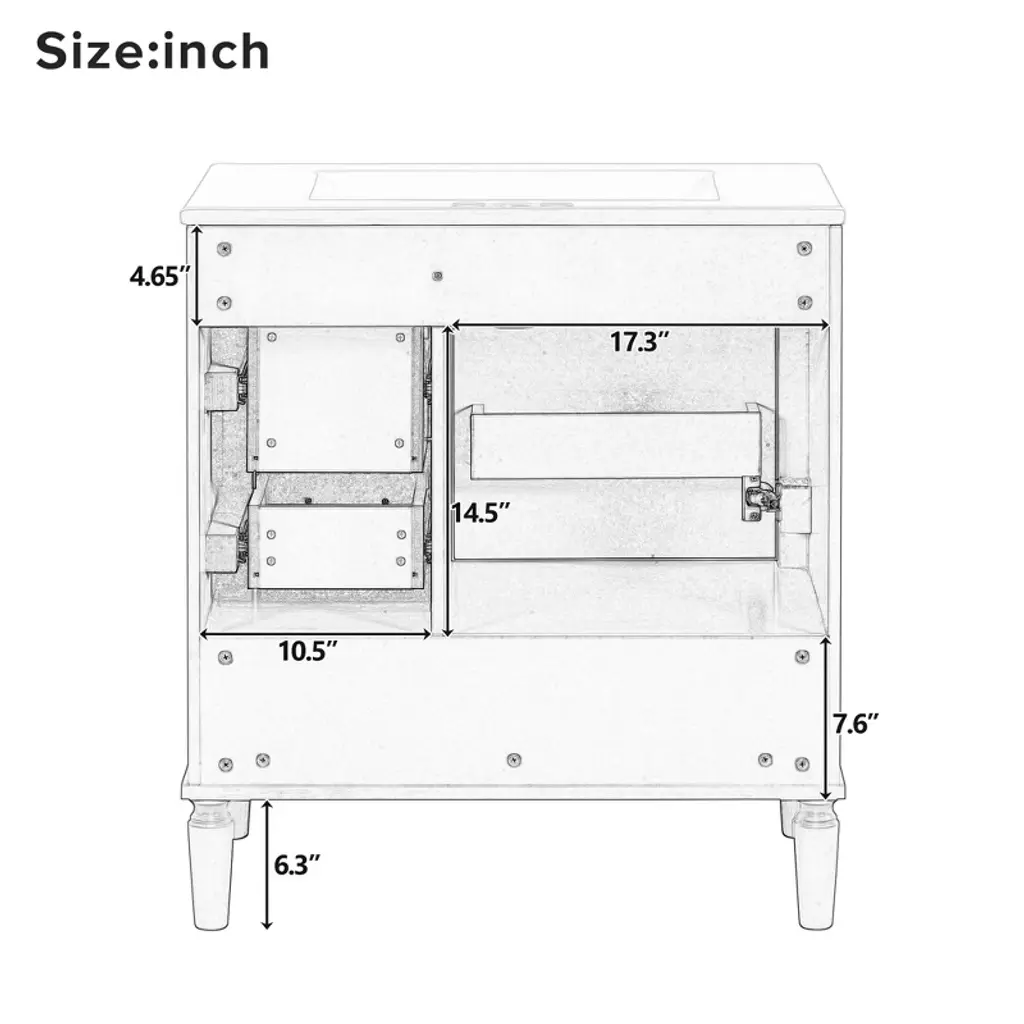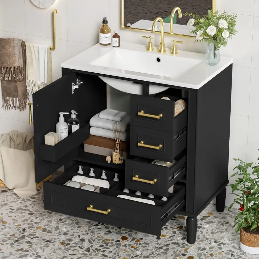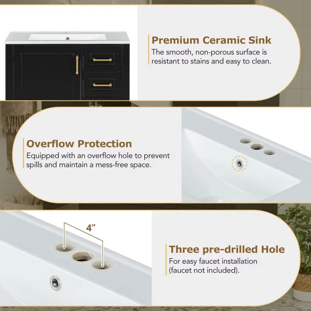 ChicFurnit offers a stylish freestanding vanity that is perfectly sized for compact bathrooms, maximizing space while maintaining both functionality and elegance. The durable ceramic basin resists stains and is easy to clean, making daily maintenance a breeze. With an integrated overflow drain, this vanity helps prevent water spills and keeps your bathroom dry. Constructed with a solid wood frame and premium MDF, it provides lasting durability. The soft-close door and three drawers offer generous storage to keep essentials organized.
