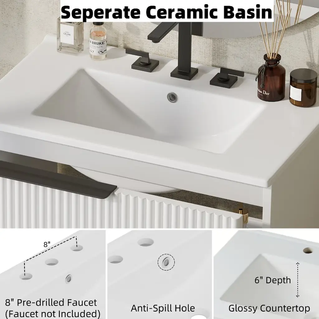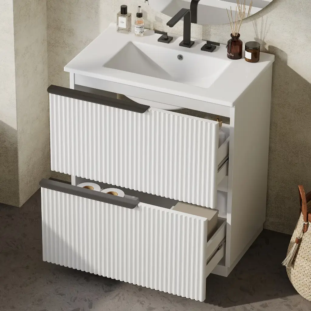 This bathroom vanity is designed for smart organization, featuring a dual-tier split-drawer system with central partitions that create distinct storage zones while preserving a sleek, unified exterior. The integrated bright white ceramic sink offers a glossy, non-porous surface that resists stains, scratches, and bacteria, with a deep basin that helps prevent splashing. Soft-close drawer slides ensure quiet, gentle operation, while deep 6" drawers provide generous storage for bottles, towels, and essentials. The handcrafted fluted design adds sophisticated texture, with vertical grooves that resist fingerprints and smudges for lasting elegance and easy maintenance. Main Material: MDF + Ceramic Mount Type: Freestanding Assembly Required Dimensions: 18.25"D X 30.00"W X 34.00"H Use Case: Bathroom