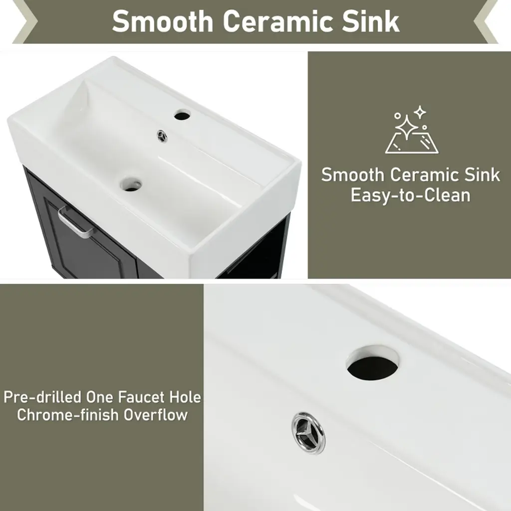Refresh your bathroom with this 21.8-inch wall-mounted floating vanity, blending minimalist design and smart storage. Made from durable MDF and paired with a sleek ceramic sink, it offers easy maintenance and long-term performance. A spacious soft-close drawer keeps essentials neatly organized, while side shelves—complete with an integrated toilet paper holder—add functionality. With an open back for plumbing access and simple assembly, this all-in-one vanity delivers style, space-saving utility, and everyday convenience. Material: MDF + Metal + Ceramic Finish: Painted Finish Muti-Color Options Mounting Type: Wall-Mounted Overall Dimension: 21.80" W x 12.10" D x 21.50'' H Overall Weight Capacity: 48.28 lbs. Package Quantity: 1