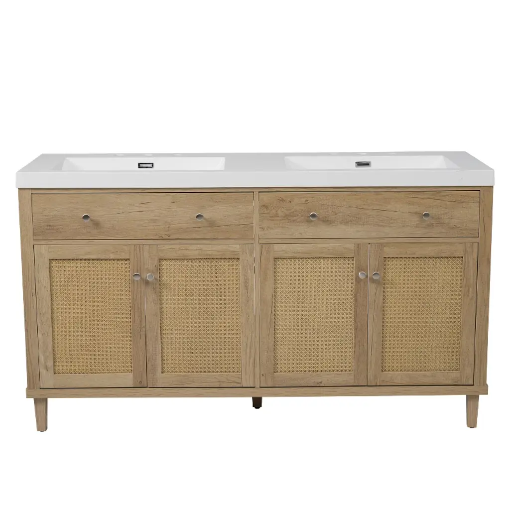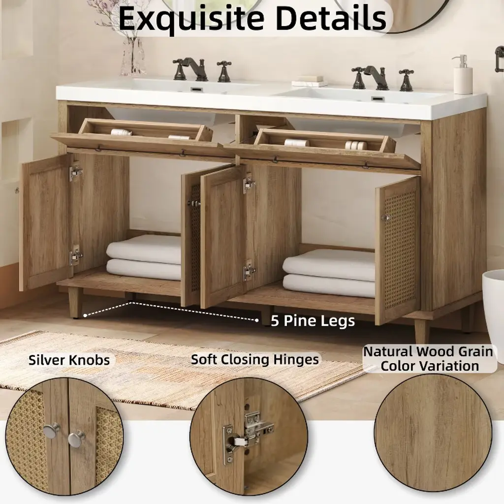 Bring rustic charm and everyday function into your home with this 60-inch farmhouse-inspired double-sink vanity. Designed with durable sinks that resist scratches, stains, and water damage, it ensures both beauty and practicality. The wide countertop provides generous space for daily essentials, while the thoughtful combination of flip-out trays and large cabinets keeps your bathroom tidy and organized. Supported by a solid pine frame with five legs, including a central reinforcement, this vanity stays stable and reliable over time. Featuring silver metal knobs and textured rattan door panels, it strikes the perfect balance between farmhouse warmth and timeless sophistication, making it a standout piece for any bathroom retreat. Main Material: Pine + Rattan Dimensions: 60.00"W × 20.00"D × 34.05"H Assembly Required Use Case: Bathroom Product Style: Farmhouse