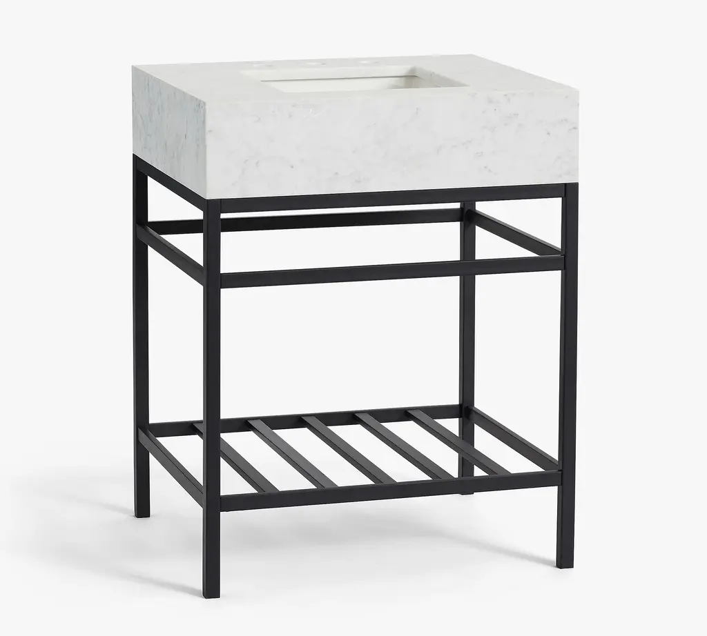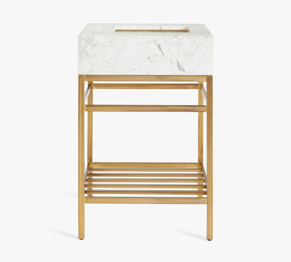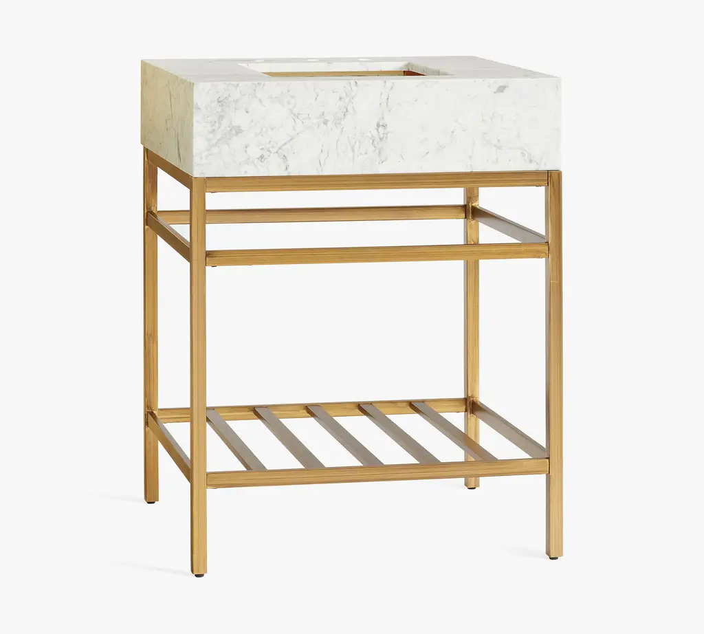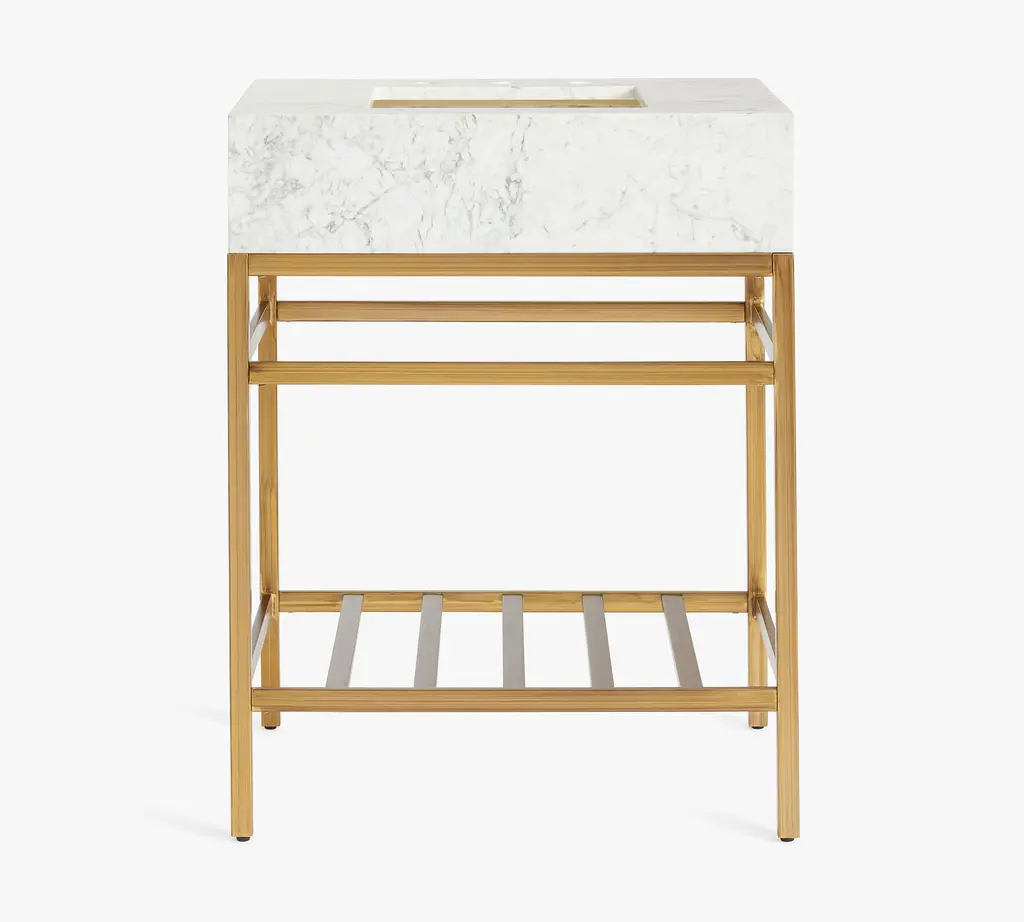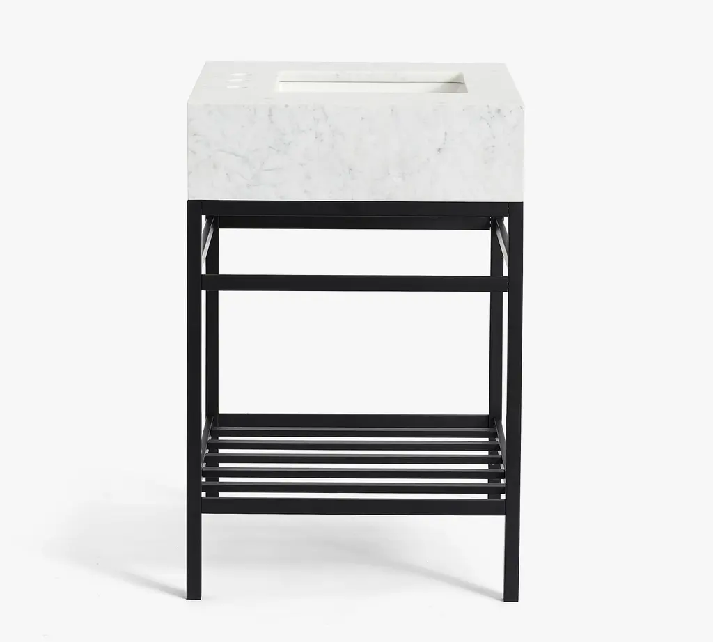 The mini apothecary-style Clarence Sink Vanity blends the best of contemporary and vintage style with straight lines and an antiqued metal finish. The airy, open look is the perfect choice for a bathroom refresh, and the small footprint works well in powder rooms or apartment settings.