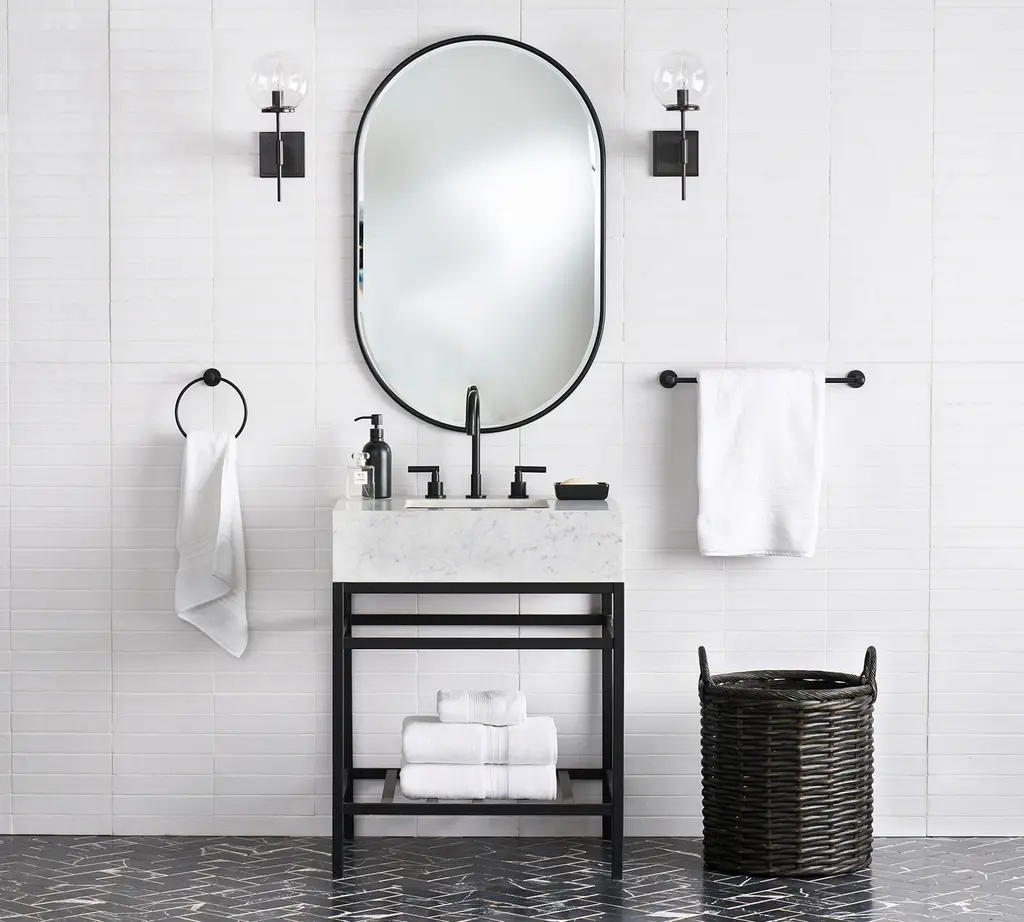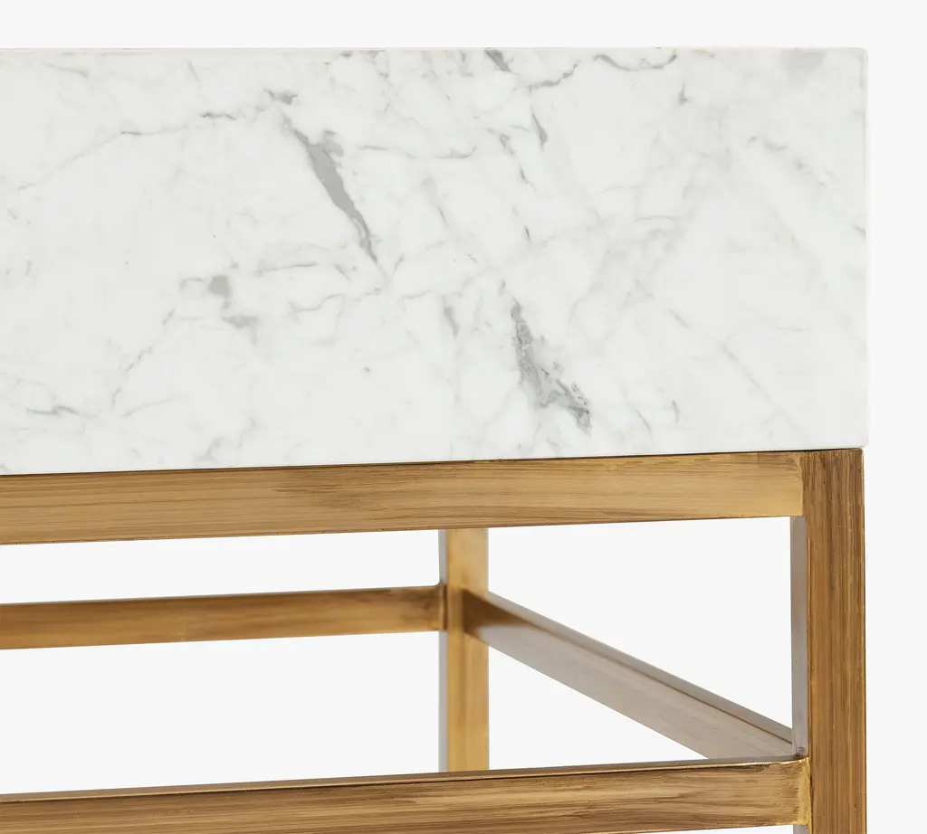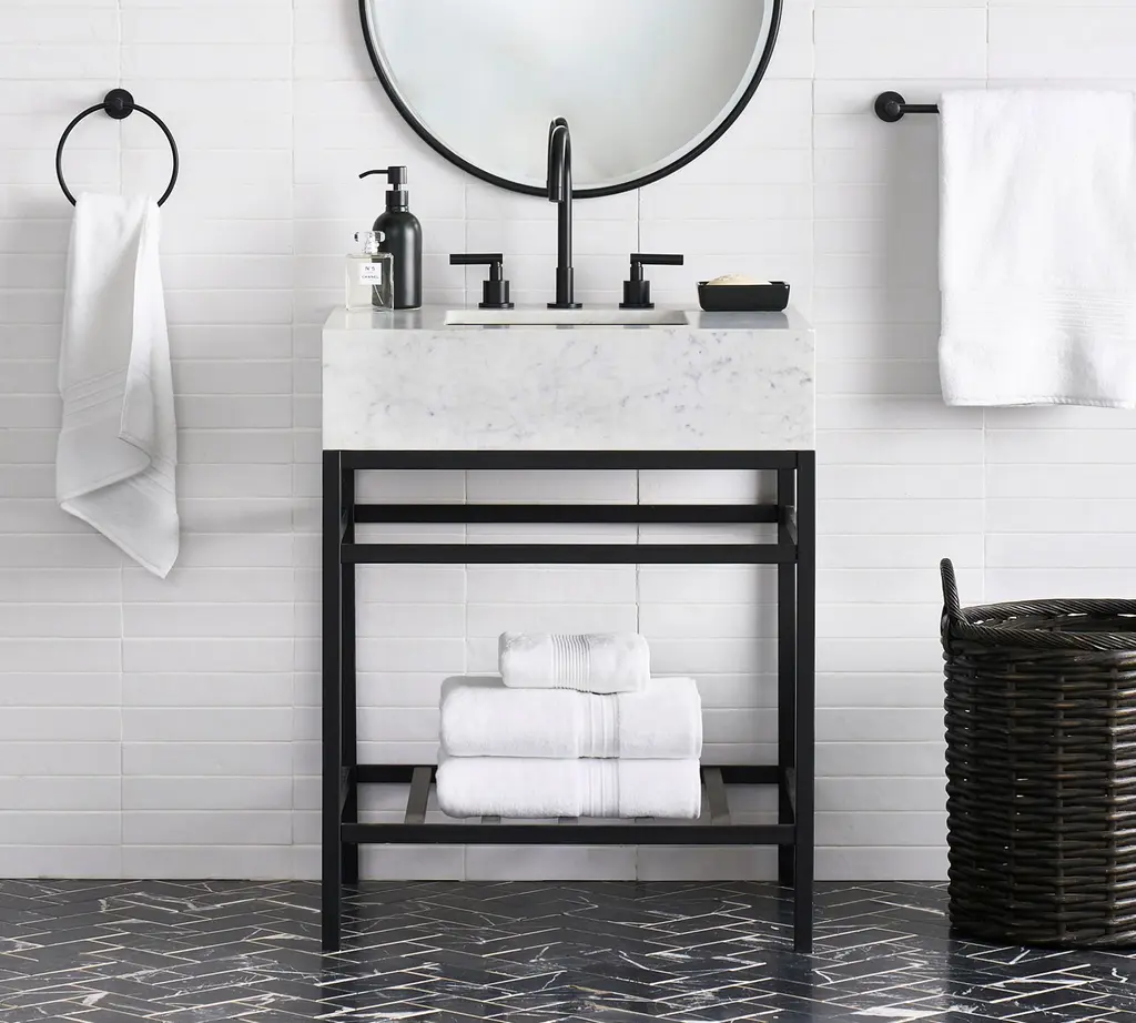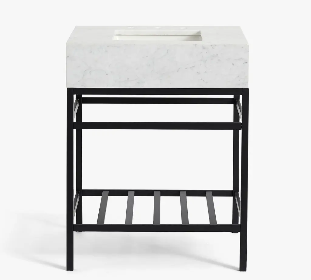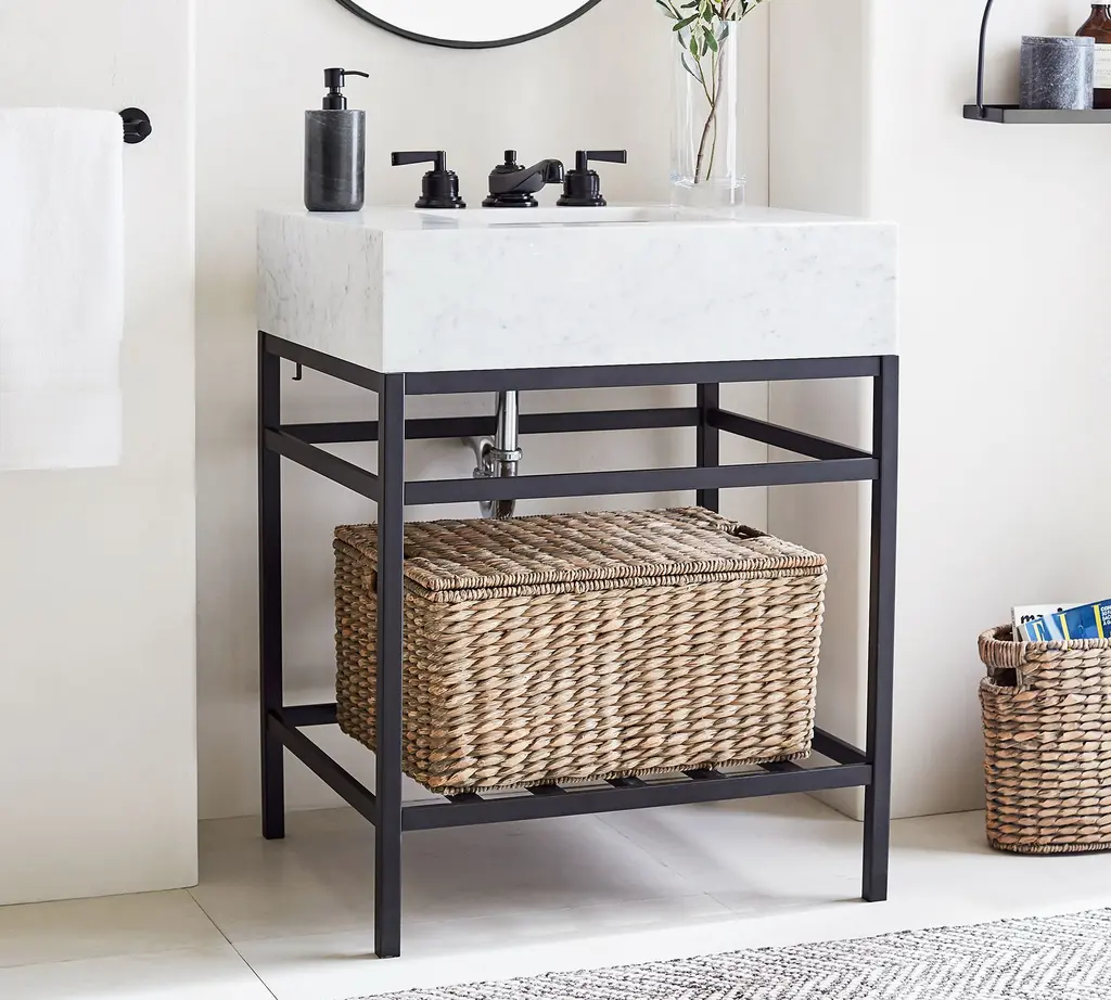The mini apothecary-style Clarence Sink Vanity blends the best of contemporary and vintage style with straight lines and an antiqued metal finish. The airy, open look is the perfect choice for a bathroom refresh, and the small footprint works well in powder rooms or apartment settings.