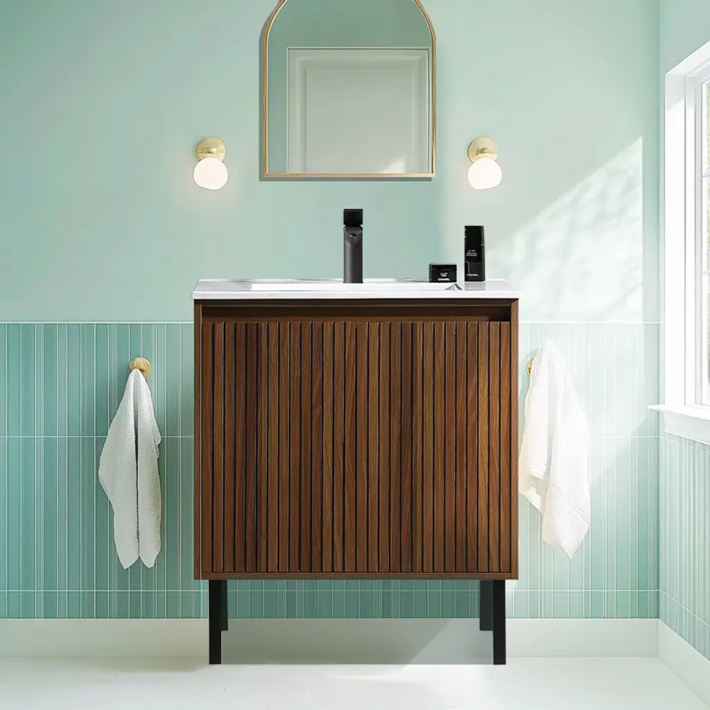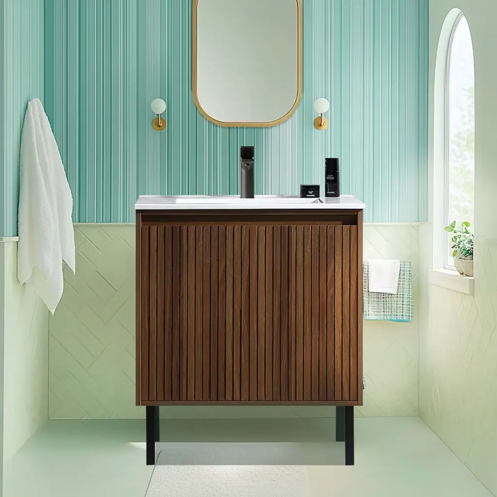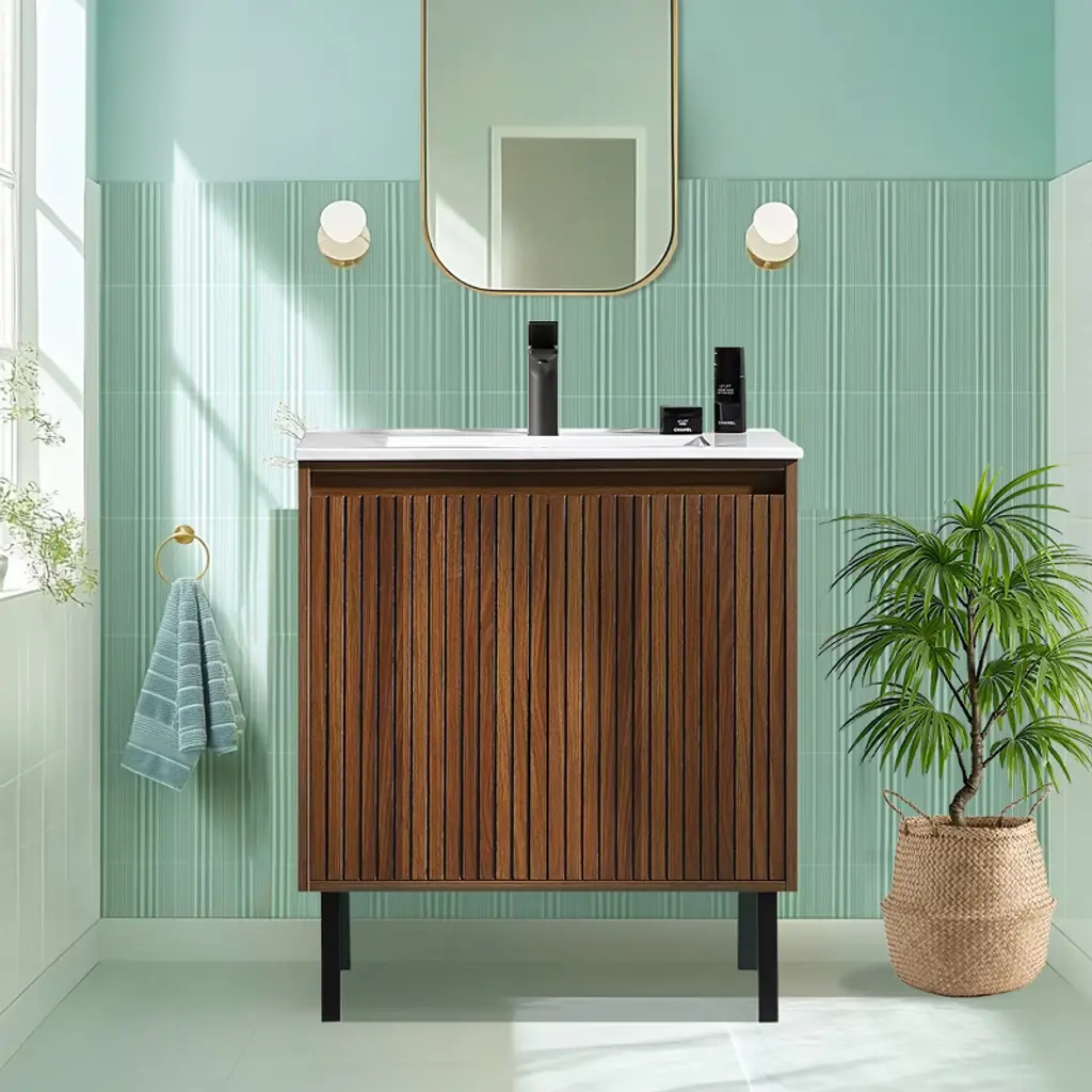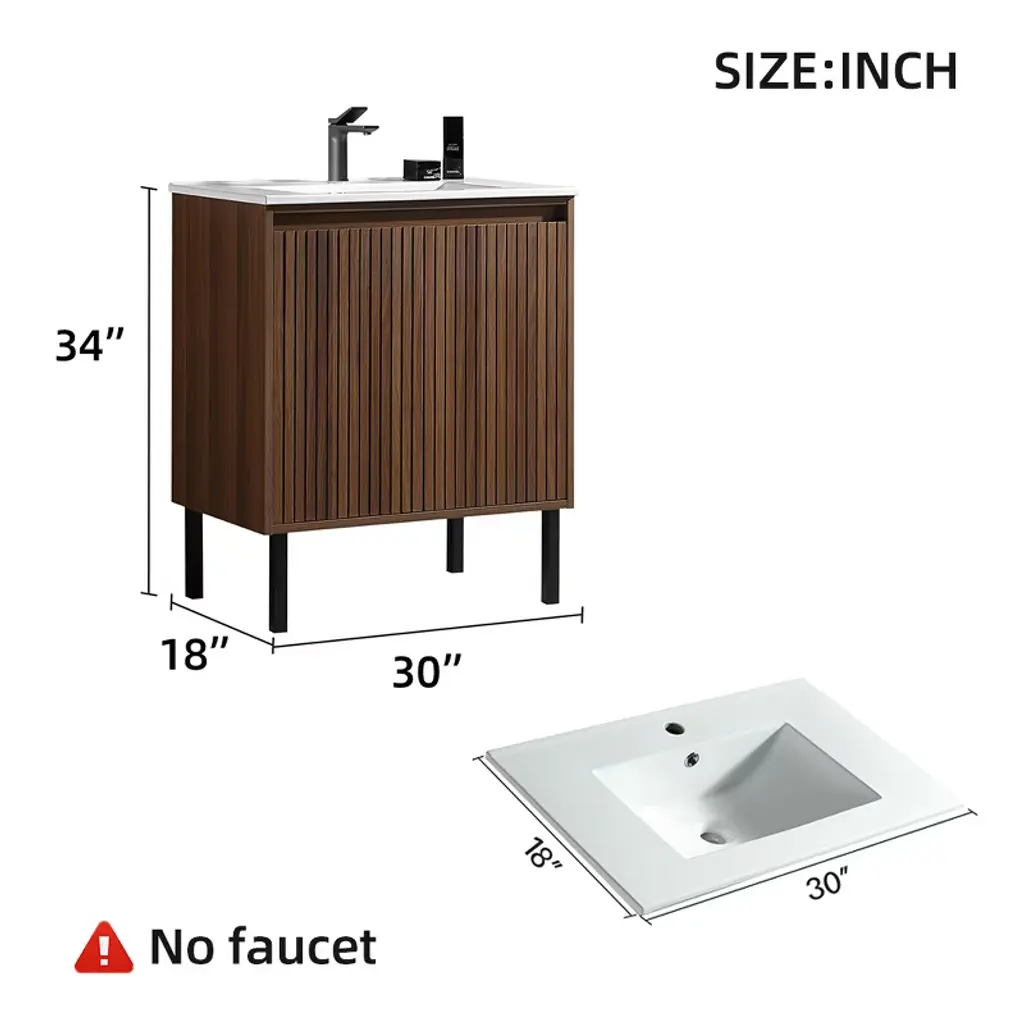 Cowlown Brown 30-in Freestanding Bathroom Vanity With Ceramic Sink, Realistic Wood Grain Finish, Large Storage Space, Contemporary Bathroom Furniture