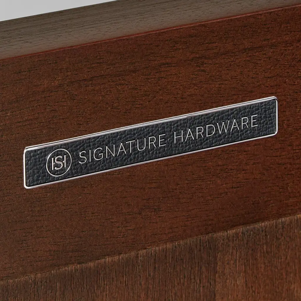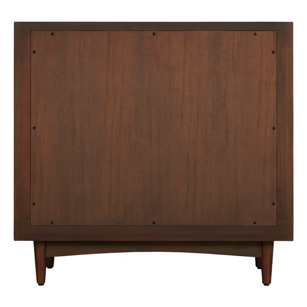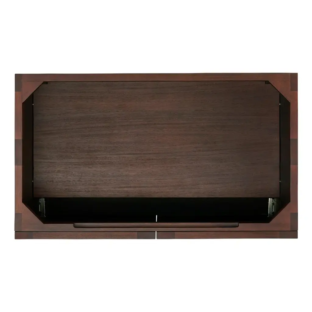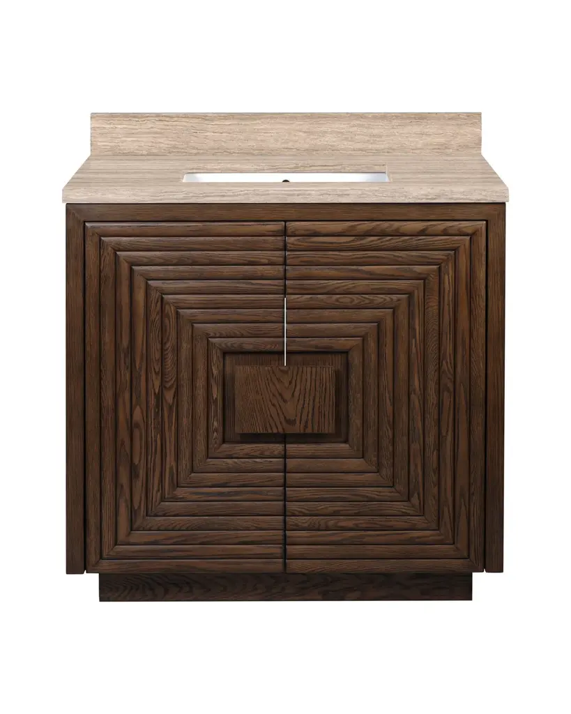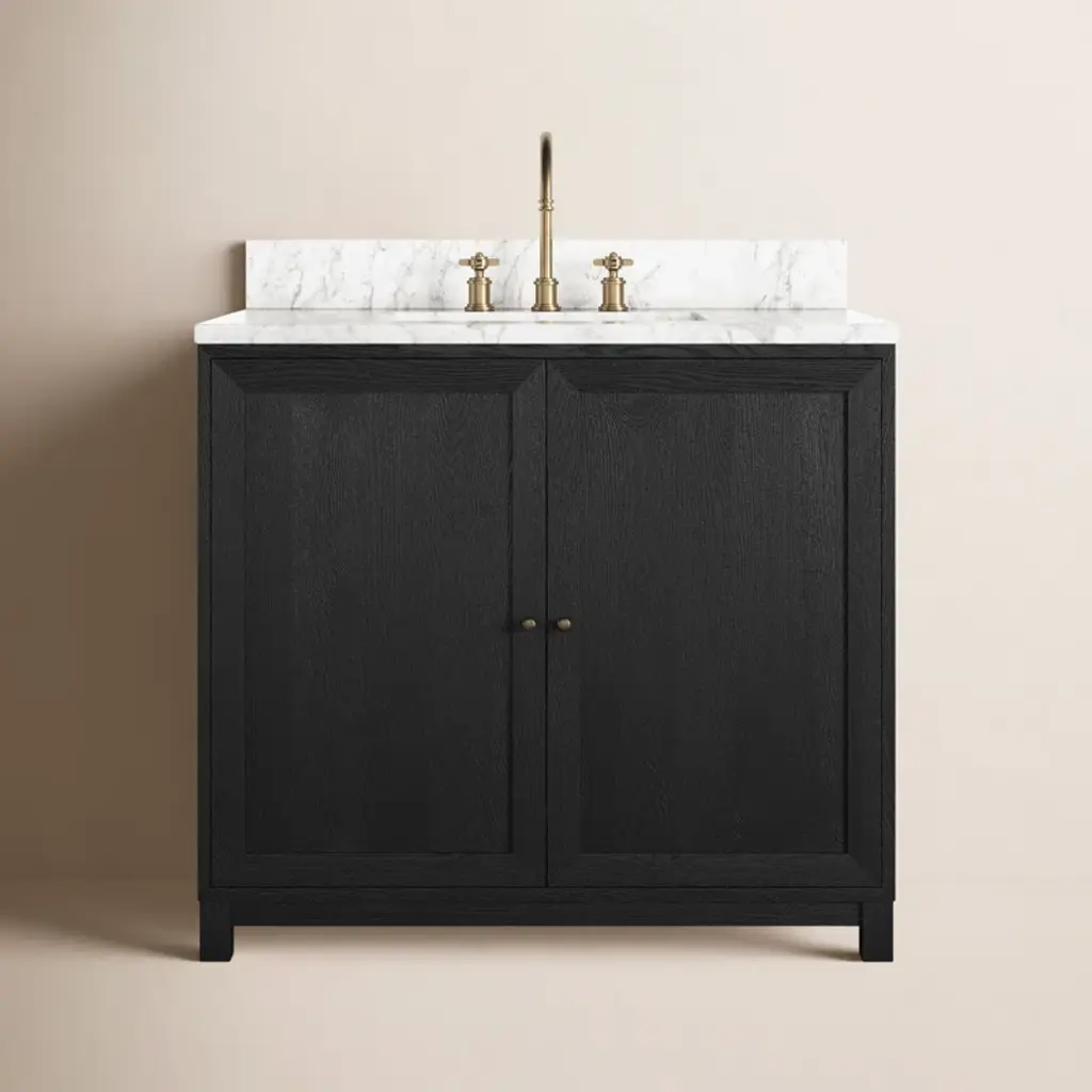 Flaunt unique, organic modern style with the 36" Delavan vanity with undermount sink. Teeming with natural warmth, a solid mahogany construction meets complete with satin brass hardware for a delicate hint of shine. Adding stunning dimension, a recessed panel effect is applied to the doors, which open to reveal ample convenient storage. Soft-closing hinges and an adjustable shelf complete the design, ensuring seamless usability.