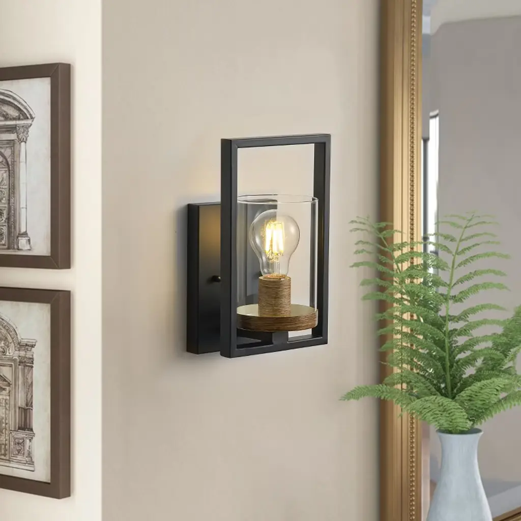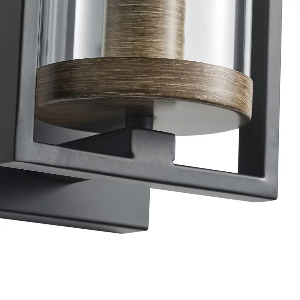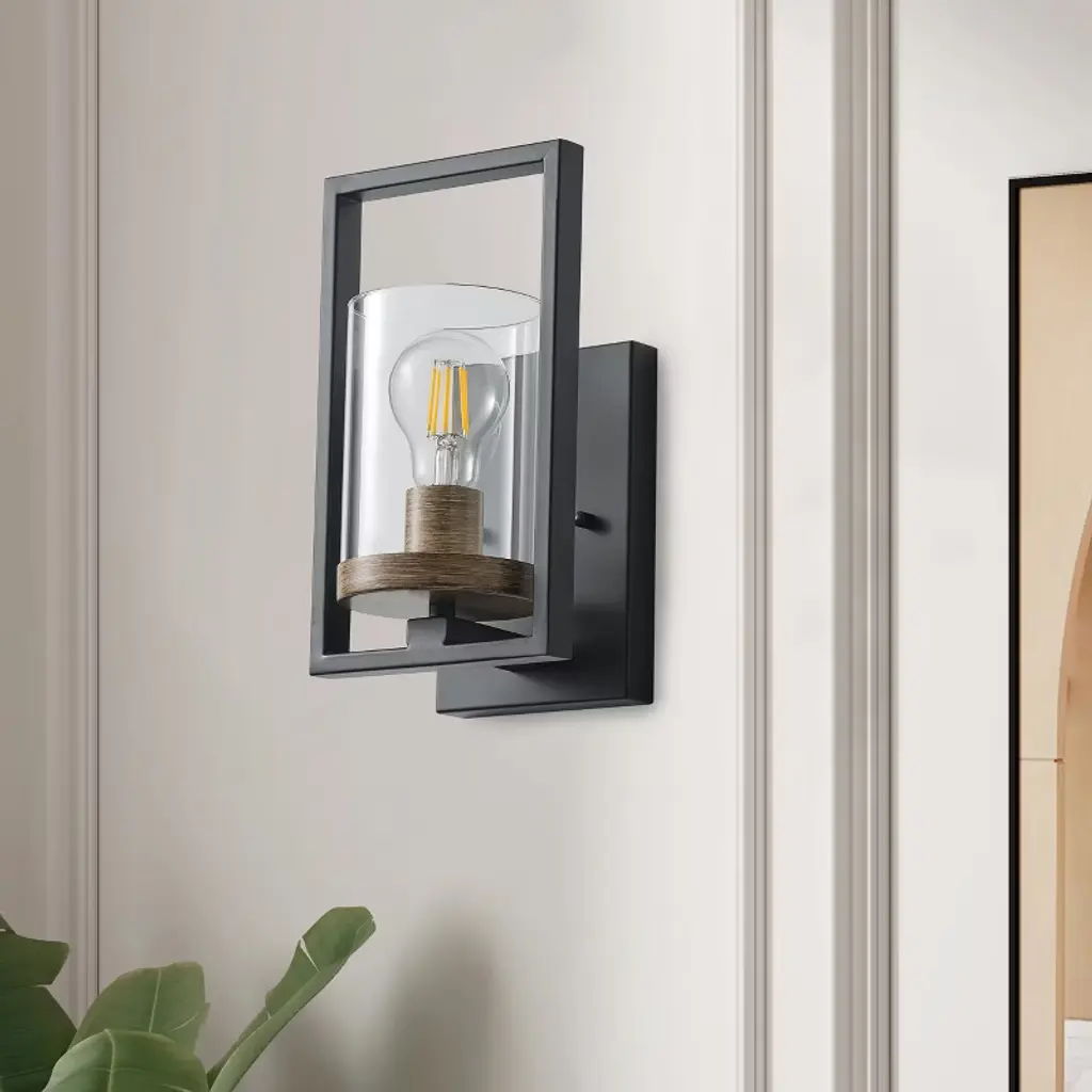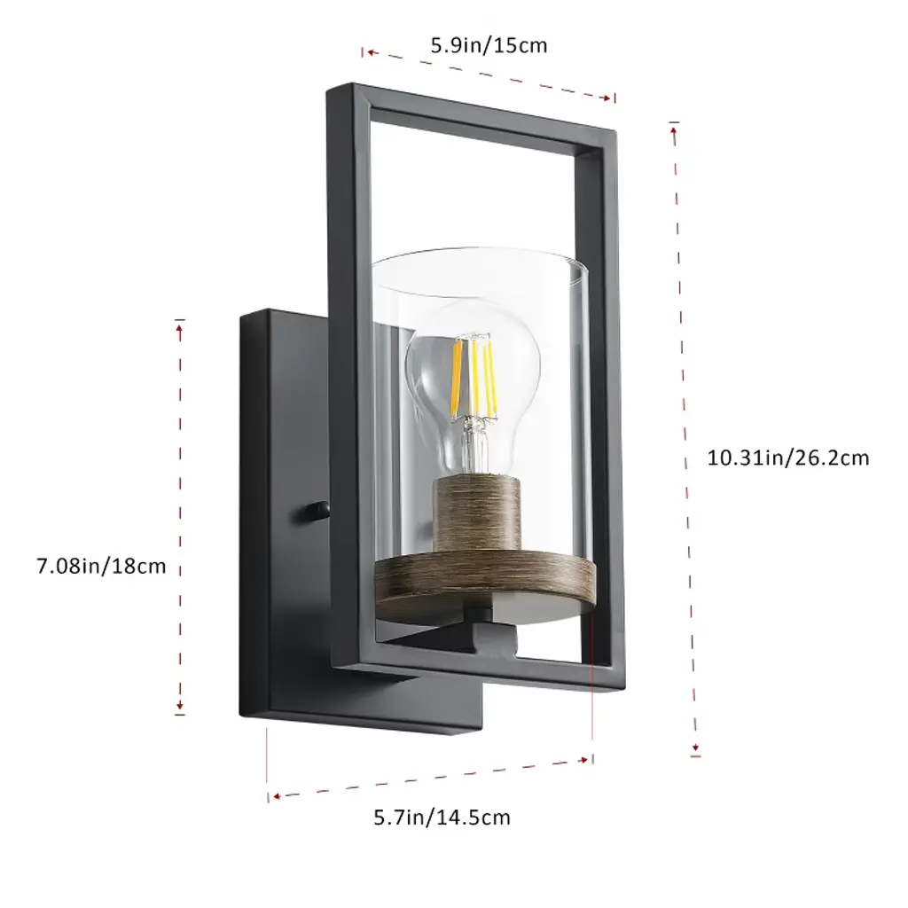 Add rustic charm and modern edge to your space with this Dewdrop industrial wall sconce. Featuring a matte black iron frame, faux pine wood finish, and clear explosion-proof glass shade, this ETL-certified fixture offers safe, stylish lighting for any room.