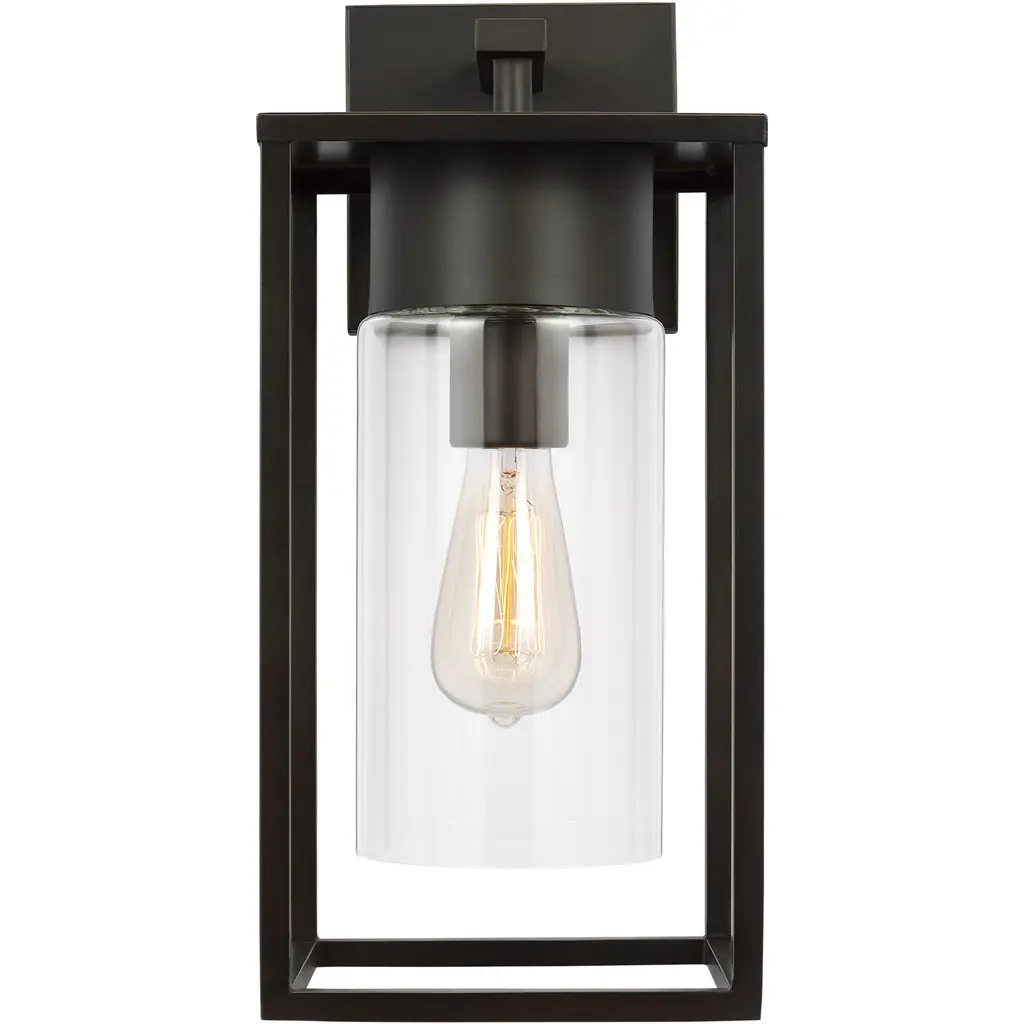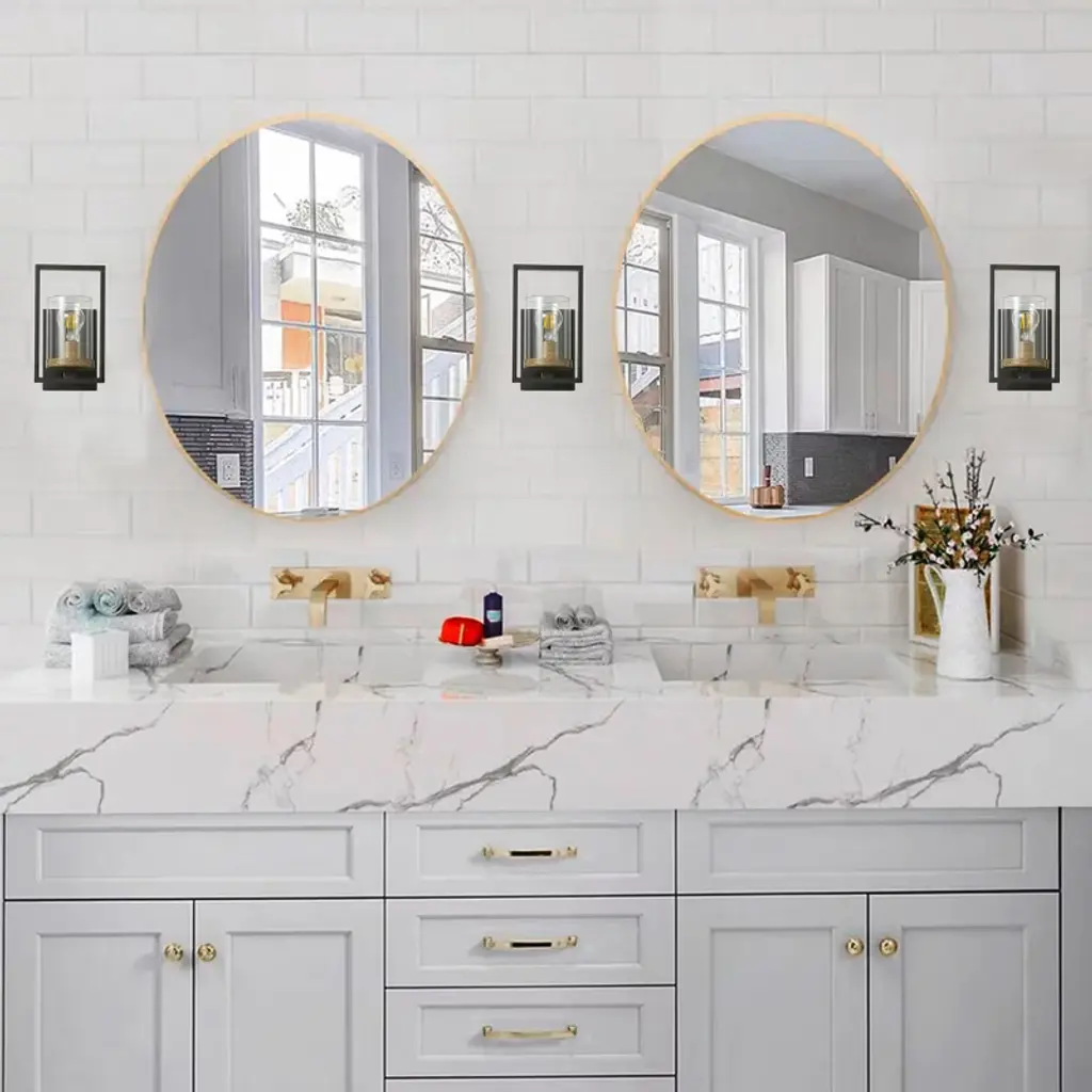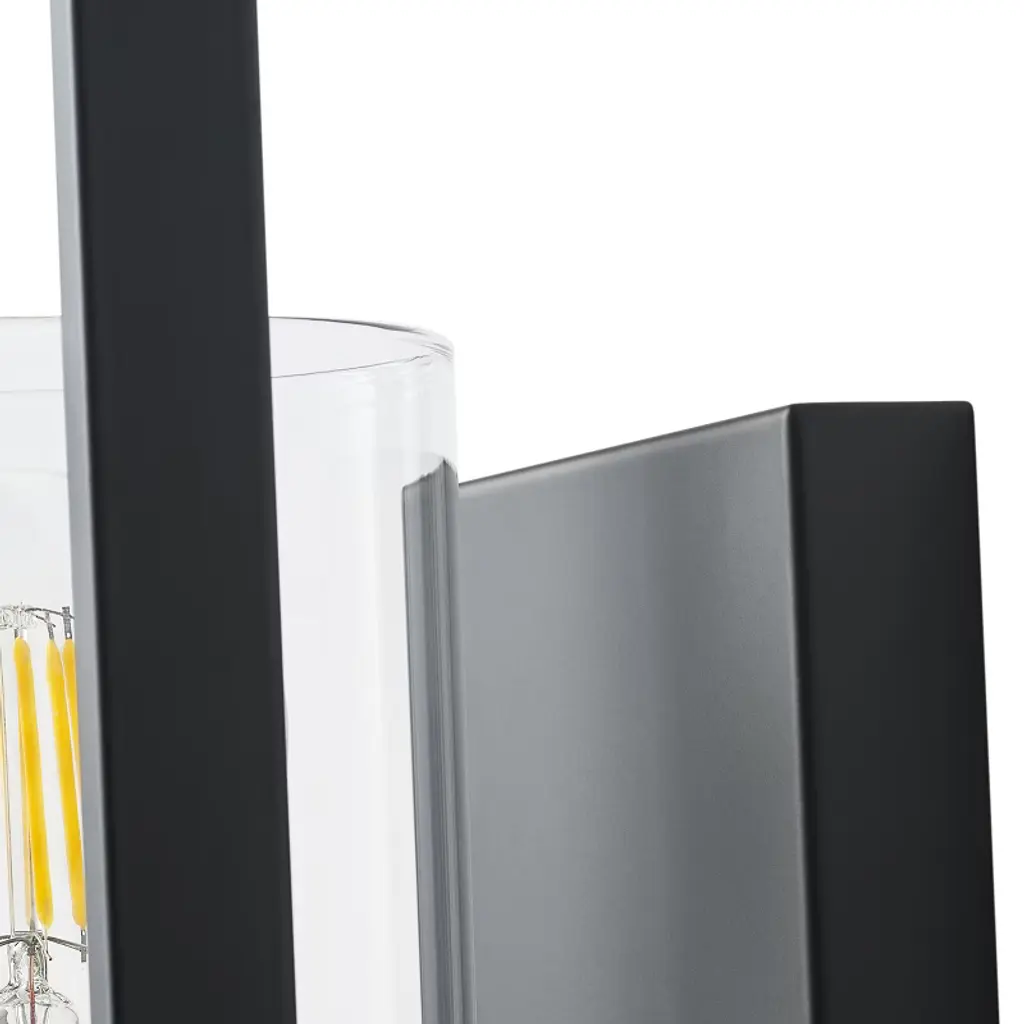 Dewdrop Industrial Wall Sconce With Clear Glass Shade, Black Frame And Wood Base For Bathroom Vanity