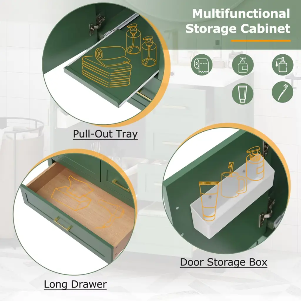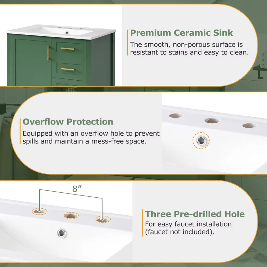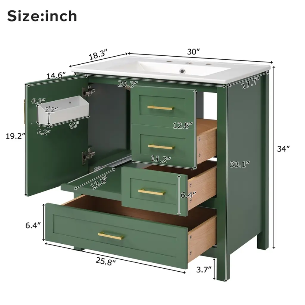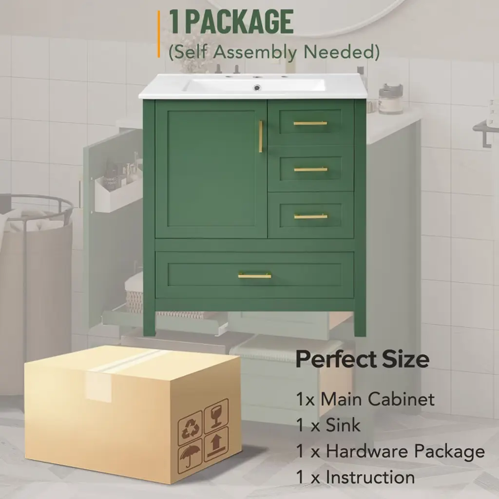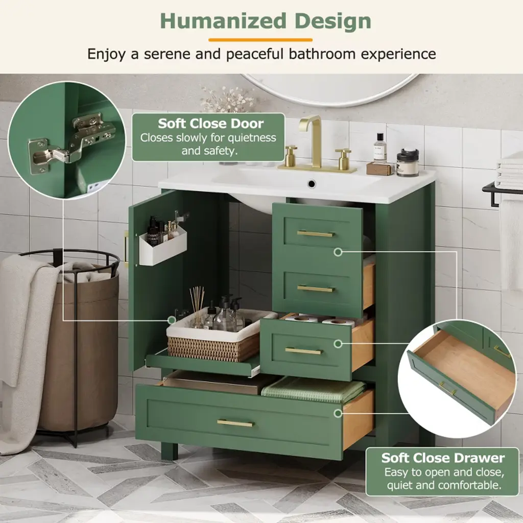30" Modern Bathroom Vanity in Green Transform your bathroom into a sanctuary with our 30-inch green vanity. The sleek silver handles draw your attention to the soft, muted elegance of the design. Beneath the smooth, white ceramic basin, easy to clean and ever-pristine, lies ample storage—an organized haven for all your essentials. With its perfect size, this vanity upgrades any small bathroom, offering both style and substance. Soft-close doors whisper quiet luxury, while the clever arrangement of drawers and shelves creates space where you thought there was none. Picture yourself in a bathroom that breathes tranquility, where every detail invites serenity. Versatile Storage, Effortless Organization Drawers of varying sizes and a movable tray offer flexible space for towels, shampoos, and more. Elegant Design, Minimalist Sophistication A green exterior with sleek silver handles creates a balanced, modern aesthetic. Durable Construction, Built to Last Solid wood frame and MDF materials ensure long-lasting durability for years of use.