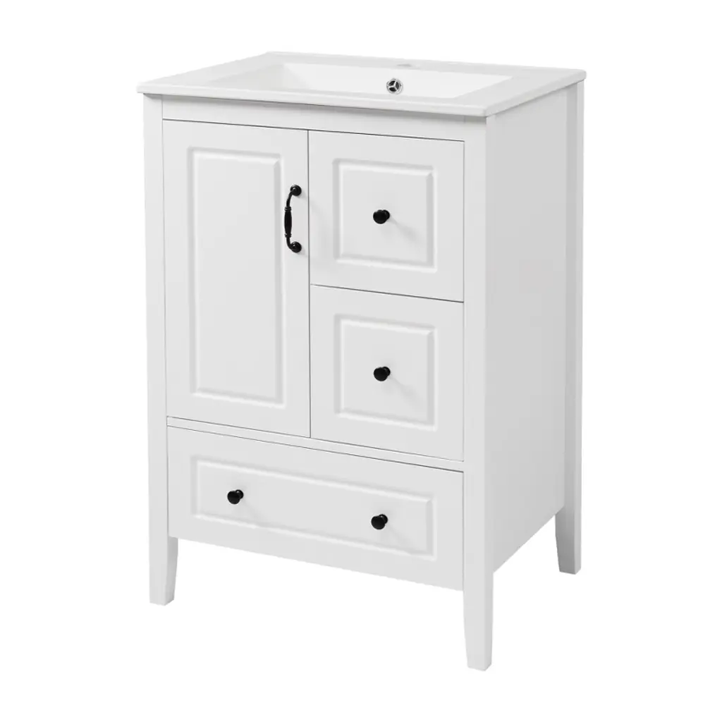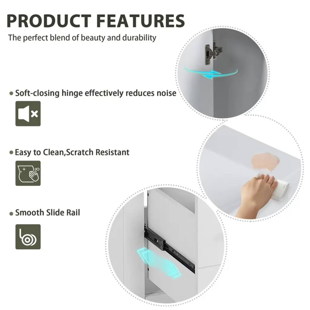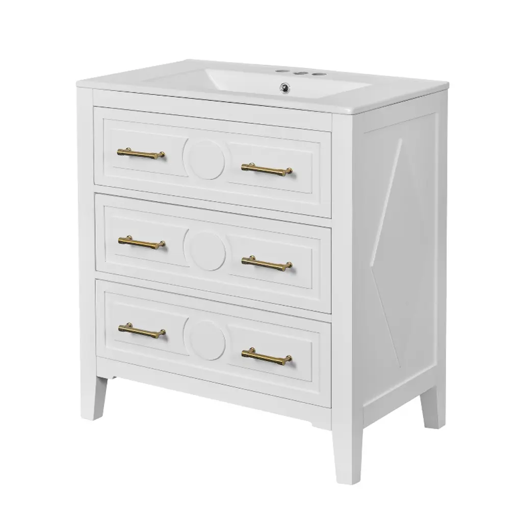 This 36-inch bathroom cabinet is made of high-quality solid wood and MDF panels, combining durability and beauty. The unique design not only provides three spacious drawers for you to organize various bathroom supplies, but also comes with a practical storage cabinet to meet your needs for space utilization. Each drawer opens smoothly and is equipped with exquisite handles, which is convenient to use and enhances the overall user experience. The meticulous craftsmanship and natural texture of the cabinet make it a visual focal point in the bathroom, creating a warm and comfortable atmosphere. Whether it is modern minimalist style or retro style, this bathroom cabinet can be perfectly integrated and become part of your ideal home. Let it add storage space to your bathroom while also enhancing the overall decorative effect. About This Item Functional Keywords 1.Solid Wood Frame 2.Soft-Closing Hinges 3.High Quality MDF Boards 4.Smooth Drawer Slide 5.Ample Storage Space Appearance Keywords 1.Retro Style 2. Exquisite Metal Handle 3.Unique Groove Pattern