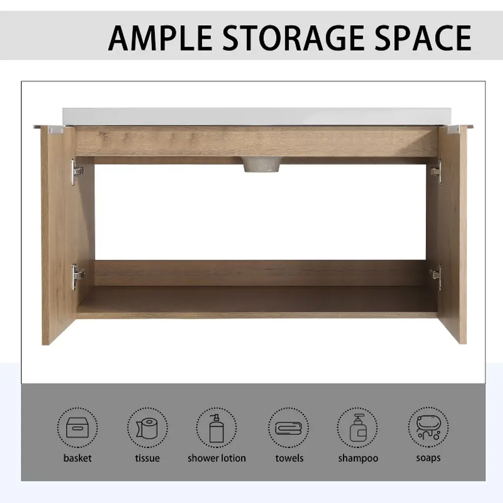 [Floating Bathroom Combination Cabinet] The ample double door cabinet provides plenty of storage space in the bathroom, and the space at the bottom allows for easier access to dirty clothes baskets and daily cleaning. Extra matching a combination of separate small side cabinet provides plenty of extra space for the bathroom. [Single Resin Sink] The diversified resin basin design allows us to escape from the traditional countertop. The lines and shapes of the products bring us enjoyment that can not be provided by ceramic countertop or stone countertop. Soft-Closing Door Hinges Vanity and side cabinet equipped with premium stainless steel soft-close hinges, the cabinet doors close silently with a gentle push, eliminating abrupt noises typically associated with traditional cabinet doors. Durable Material Vanity and side cabinet is made of high quality plywood that surface material used "Scratch & Water-Resistant" melamine, which is designed to not only withstand threats of moisture and humidity but also easy to clean and maintain.