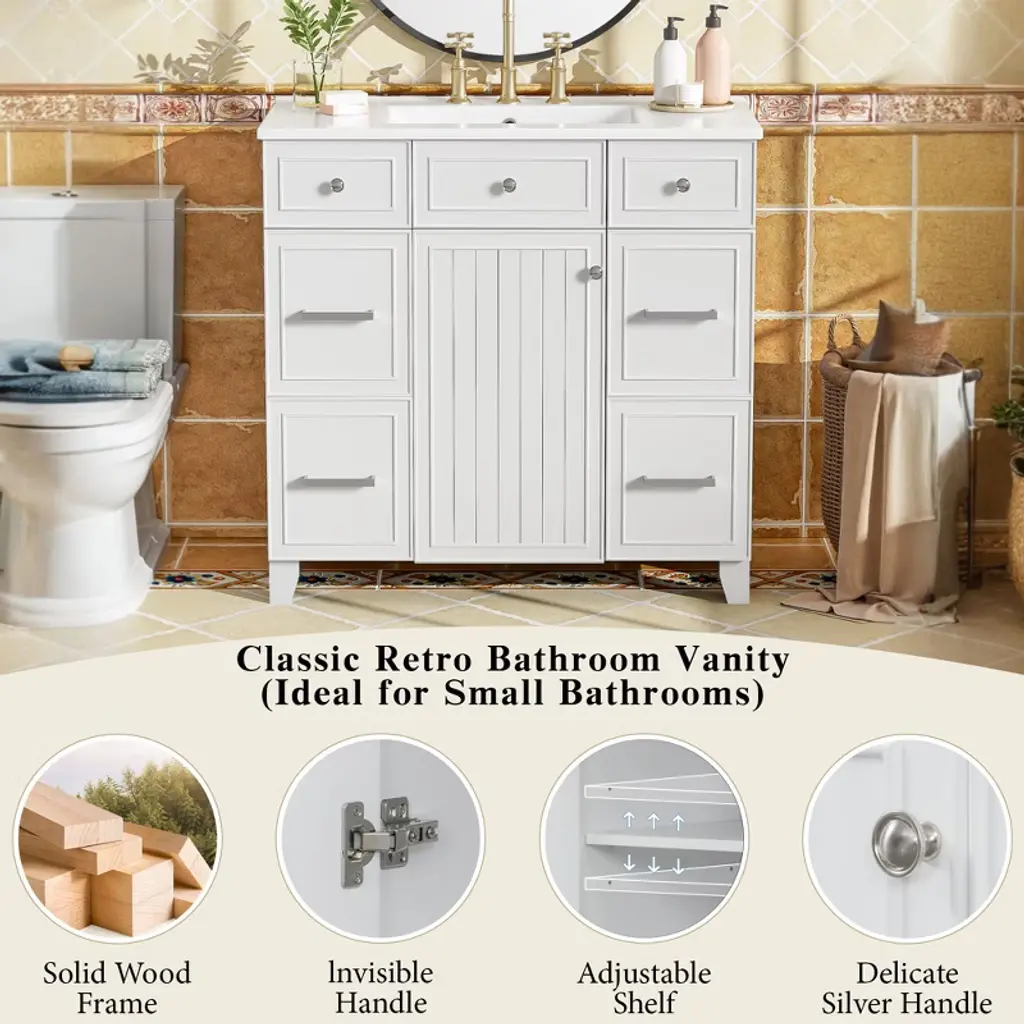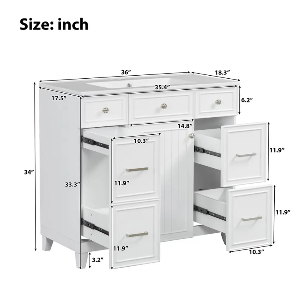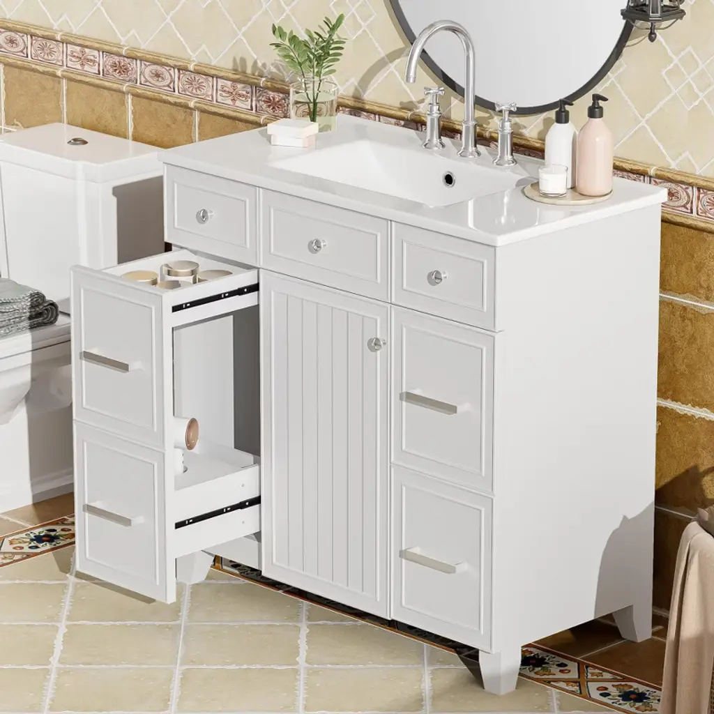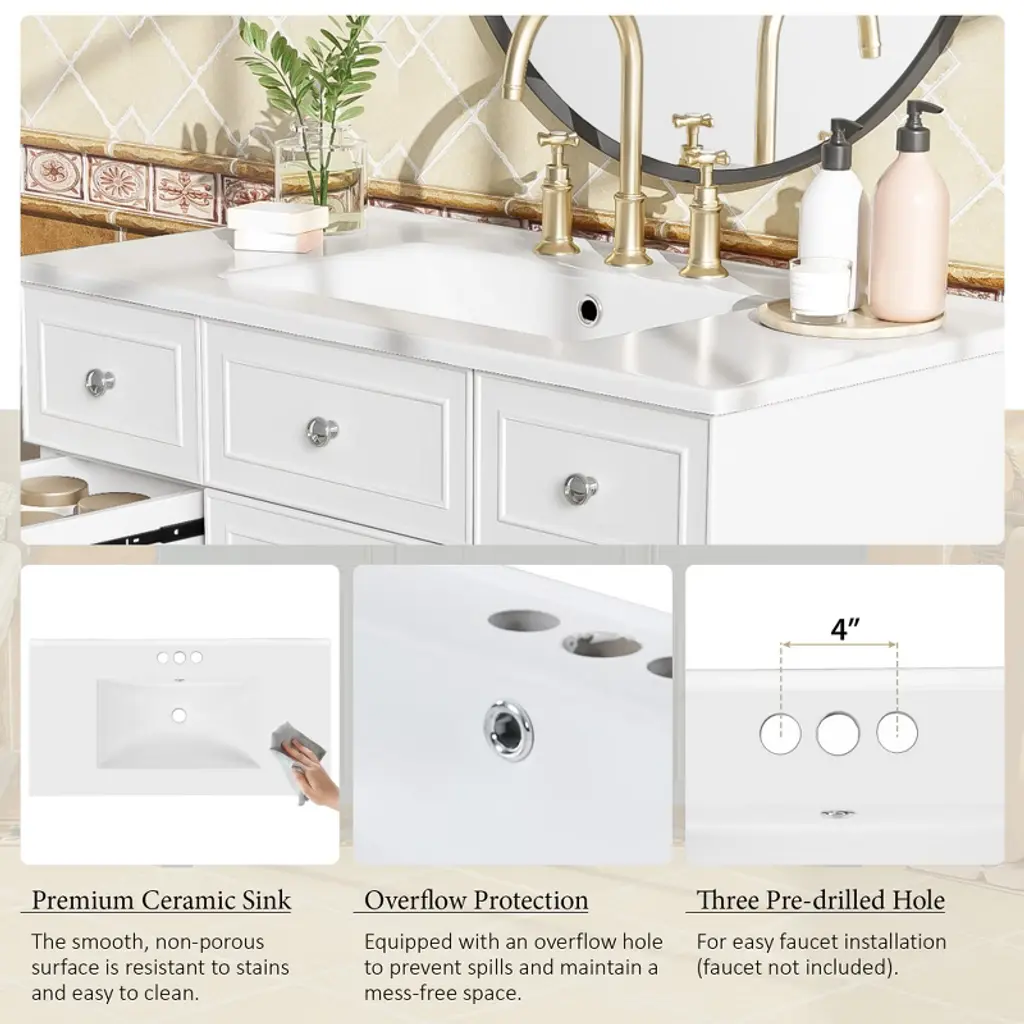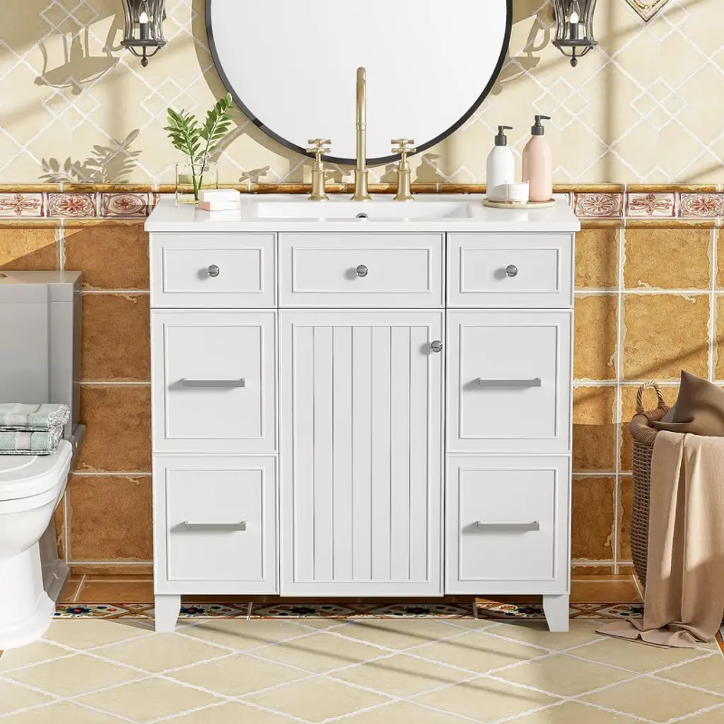 White 36" Transitional Bathroom Vanity with Ceramic Basin Transform your bathroom into a serene retreat with this 36-inch white vanity. Its compact size fits snugly into small spaces while offering abundant storage with double-layer drawers, a deep drawer, and adjustable shelves—everything has its place. The soft-close doors glide quietly, adding a sense of calm to your morning routine. Crafted from a solid wood frame, the vanity pairs durability with timeless elegance. The smooth ceramic sink, complemented by polished silver metal handles, reflects light beautifully, infusing your bathroom with a bright, refreshing ambiance. Every detail, from the built-in overflow hole to the seamless lines etched on the doors, speaks of thoughtful design. Whether you’re storing essentials or simply admiring its graceful presence, this vanity brings harmony and sophistication to your space, making every moment in your bathroom feel like a gentle escape. Powerful Storage Function One side drawer is connected, which can store bath necessities such as hair dryer/curling iron/straightener and shampoo, the other side is a separate drawer for storing towels, and the middle cabinet can store cleaning utensils. Sturdy Solid Wood Frame The cabinet structure is made of Solid wood, which has stronger product stability and can prolong the service life. Upgrade Your Bathroom Benefit from its powerful storage capacity, elegant brushed copper handles, and quiet soft-close door. With its waterproof and moisture-resistant features, our cabinet provides both practicality and durability, enhancing the functionality and aesthetics of your bathroom.