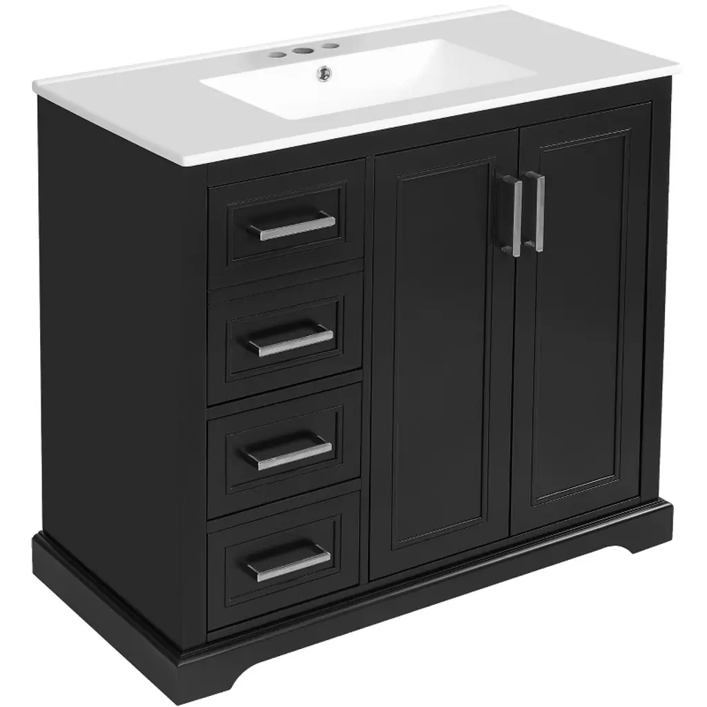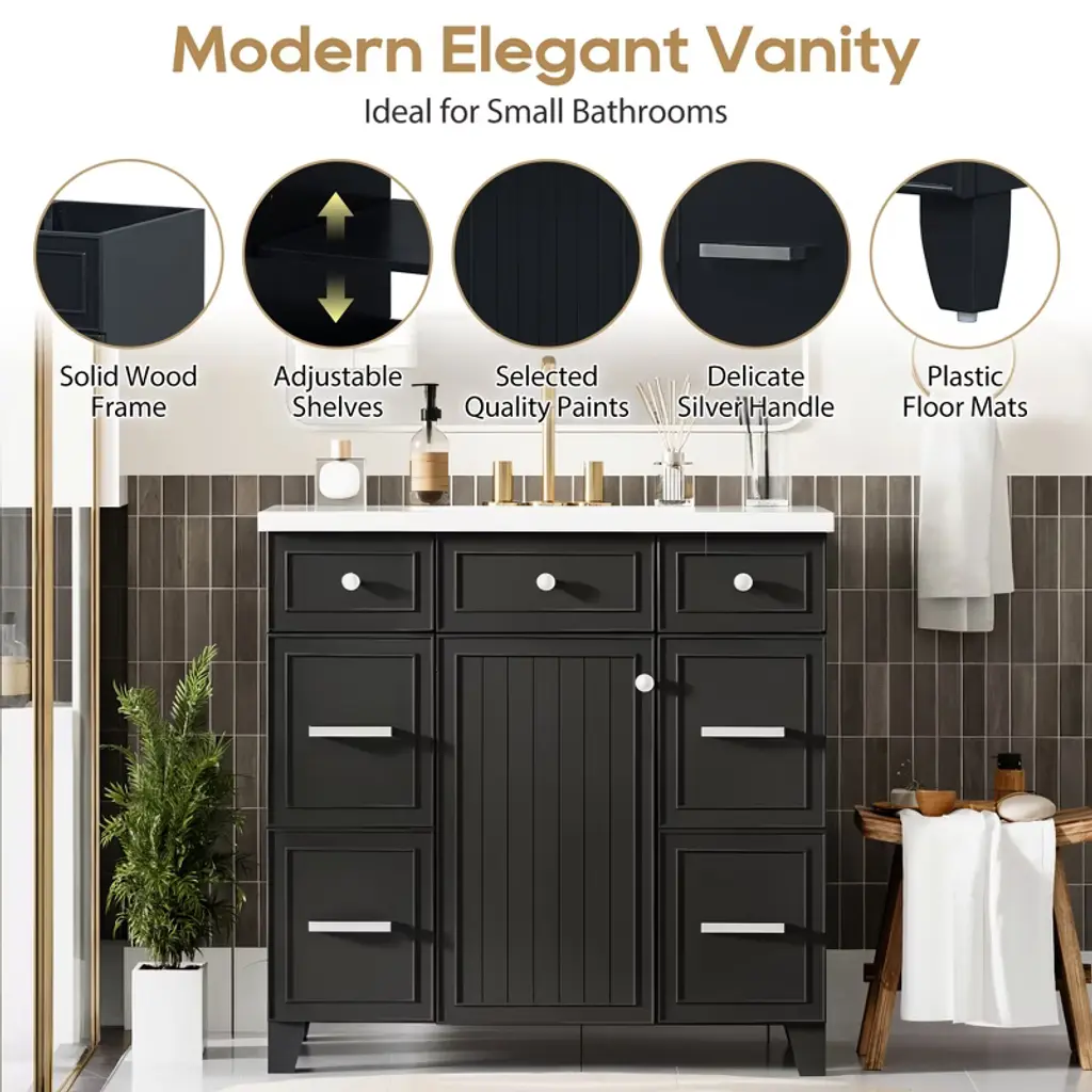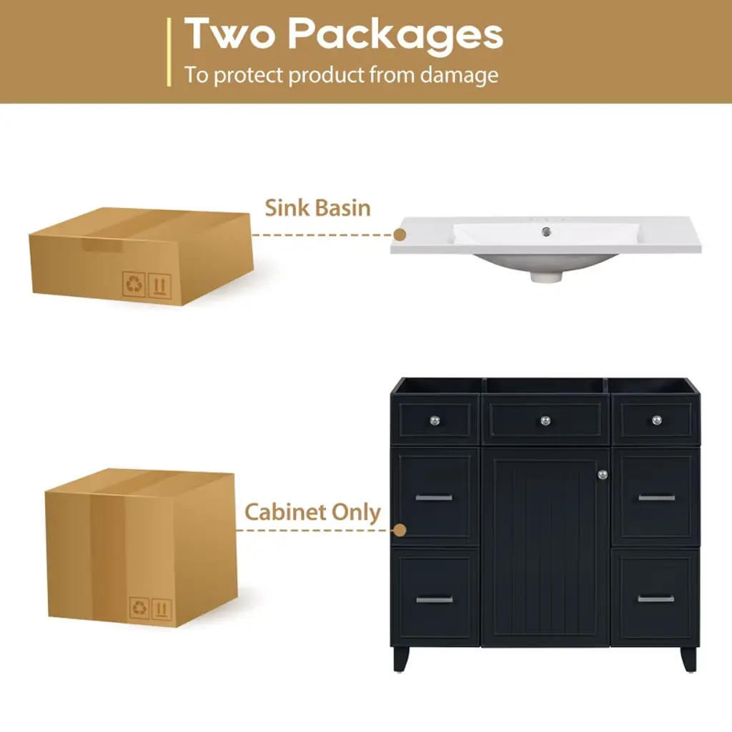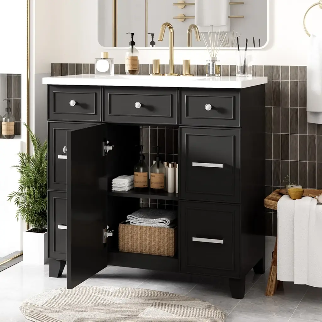 Black 36" Transitional Bathroom Vanity with Single Sink Introducing our exquisite and versatile black bathroom cabinet that combines functionality with timeless elegance. With its spacious storage capacity, you can effortlessly organize all your bathroom essentials, ensuring a clutter-free space.Experience the perfect blend of classic style and modern functionality with our black bathroom cabinet. Upgrade your space and enjoy the convenience and beauty it brings to your daily routine. Powerful Storage Function One side drawer is connected, which can store bath necessities such as hair dryer/curling iron/straightener and shampoo, the other side is a separate drawer for storing towels, and the middle cabinet can store cleaning utensils. Sturdy Solid Wood Frame The cabinet structure is made of Solid wood, which has stronger product stability and can prolong the service life. Upgrade Your Bathroom Benefit from its powerful storage capacity, elegant brushed copper handles, and quiet soft-close door. With its waterproof and moisture-resistant features, our cabinet provides both practicality and durability, enhancing the functionality and aesthetics of your bathroom.