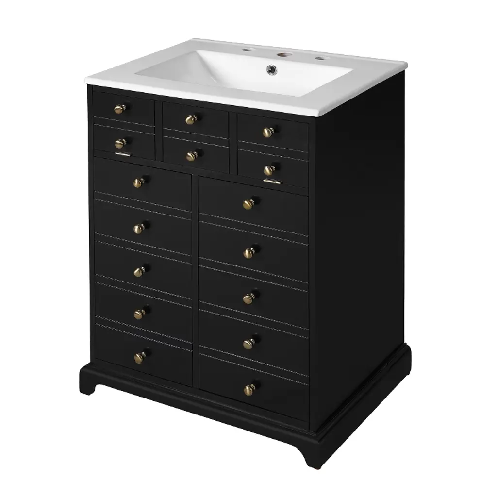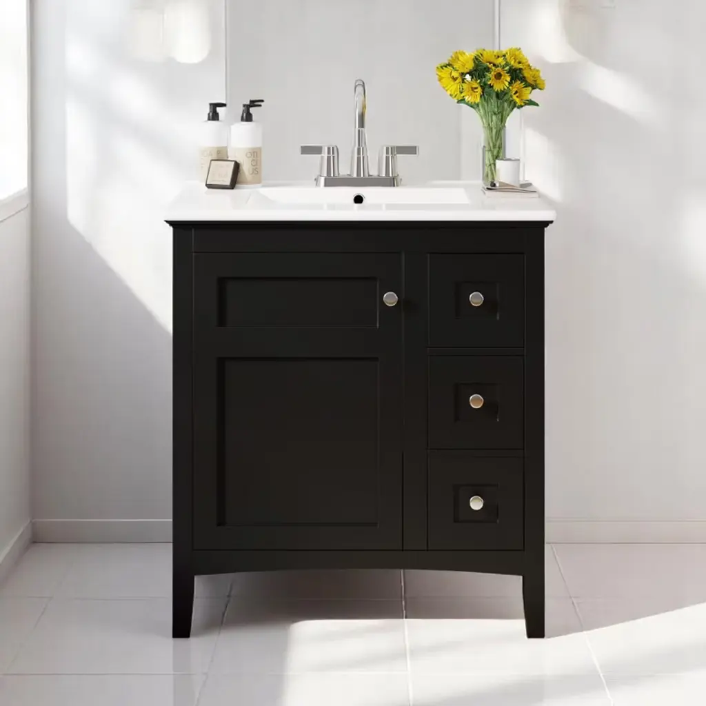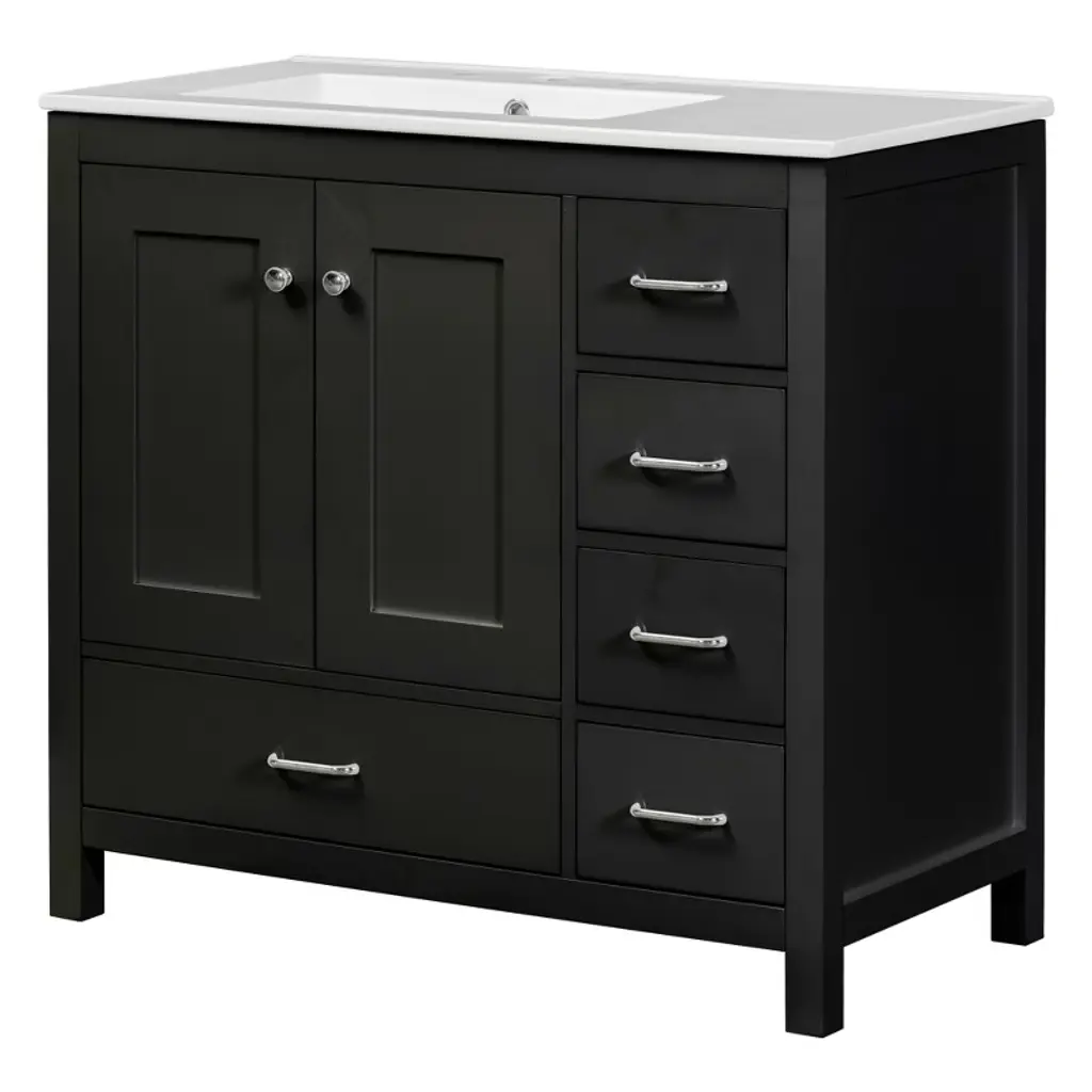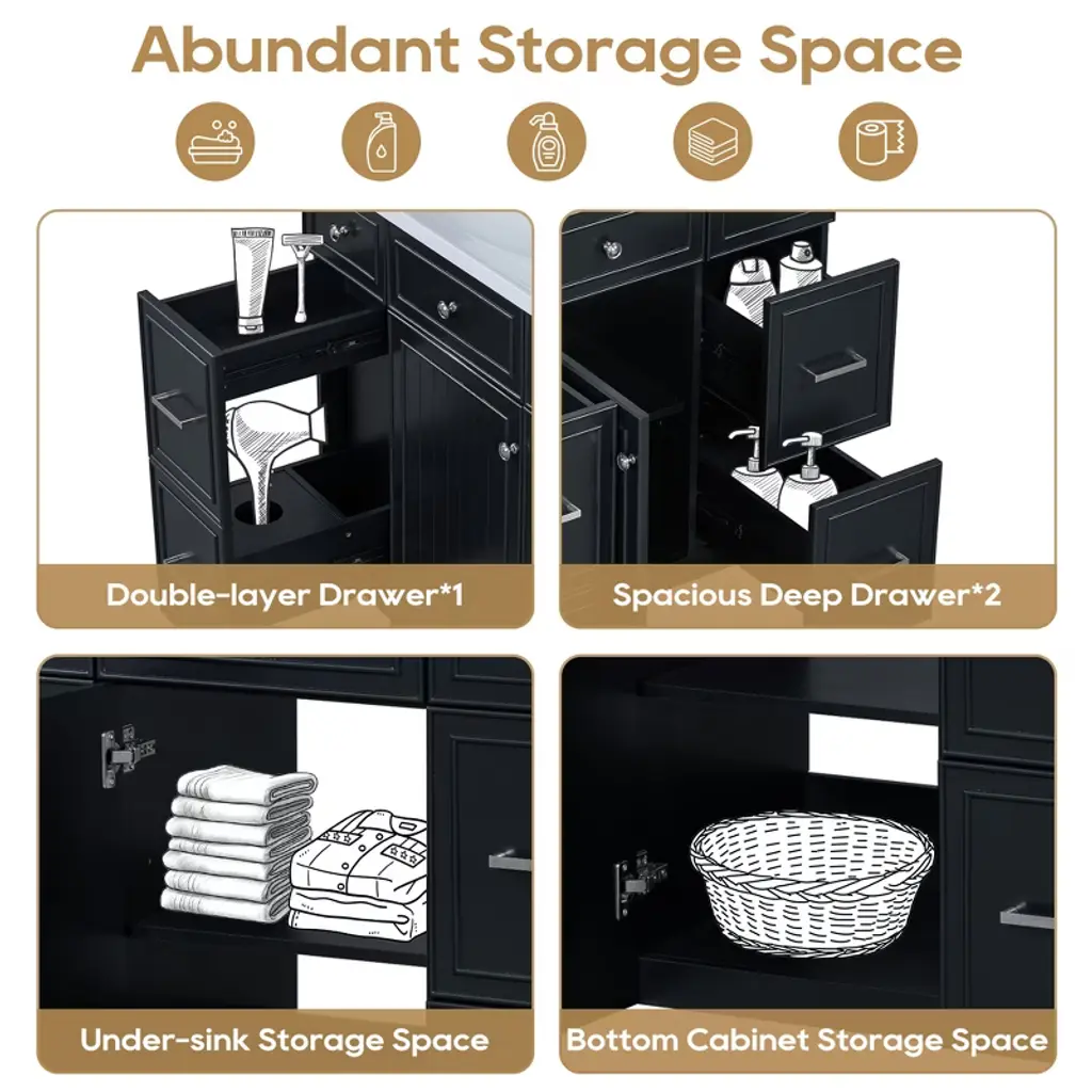 Black 36" Transitional Bathroom Vanity with Single Sink Introducing our exquisite and versatile black bathroom cabinet that combines functionality with timeless elegance. With its spacious storage capacity, you can effortlessly organize all your bathroom essentials, ensuring a clutter-free space.Experience the perfect blend of classic style and modern functionality with our black bathroom cabinet. Upgrade your space and enjoy the convenience and beauty it brings to your daily routine. Powerful Storage Function One side drawer is connected, which can store bath necessities such as hair dryer/curling iron/straightener and shampoo, the other side is a separate drawer for storing towels, and the middle cabinet can store cleaning utensils. Sturdy Solid Wood Frame The cabinet structure is made of Solid wood, which has stronger product stability and can prolong the service life. Upgrade Your Bathroom Benefit from its powerful storage capacity, elegant brushed copper handles, and quiet soft-close door. With its waterproof and moisture-resistant features, our cabinet provides both practicality and durability, enhancing the functionality and aesthetics of your bathroom.