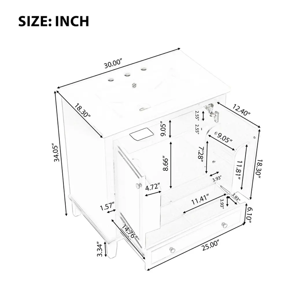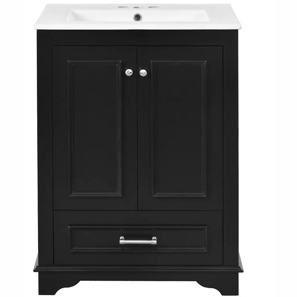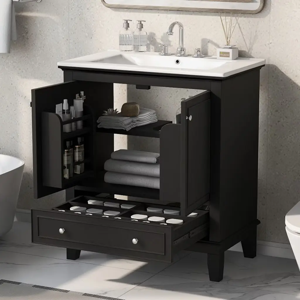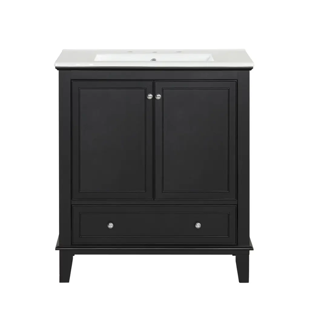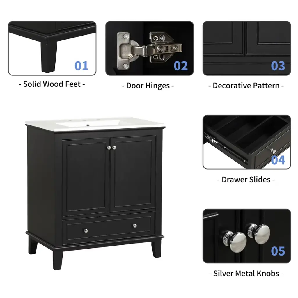 Solid Wood& High-quality MDF Board & Ceramic Sink & Painted Finish Cabinet with Doors & One Drawer One Package Details 1. Functional Storage Cabinet and Drawer 2. Adjustable Shelf 3. Drawer with Slides 4. Silver Round Knobs 5. Stainless Steel Hinges