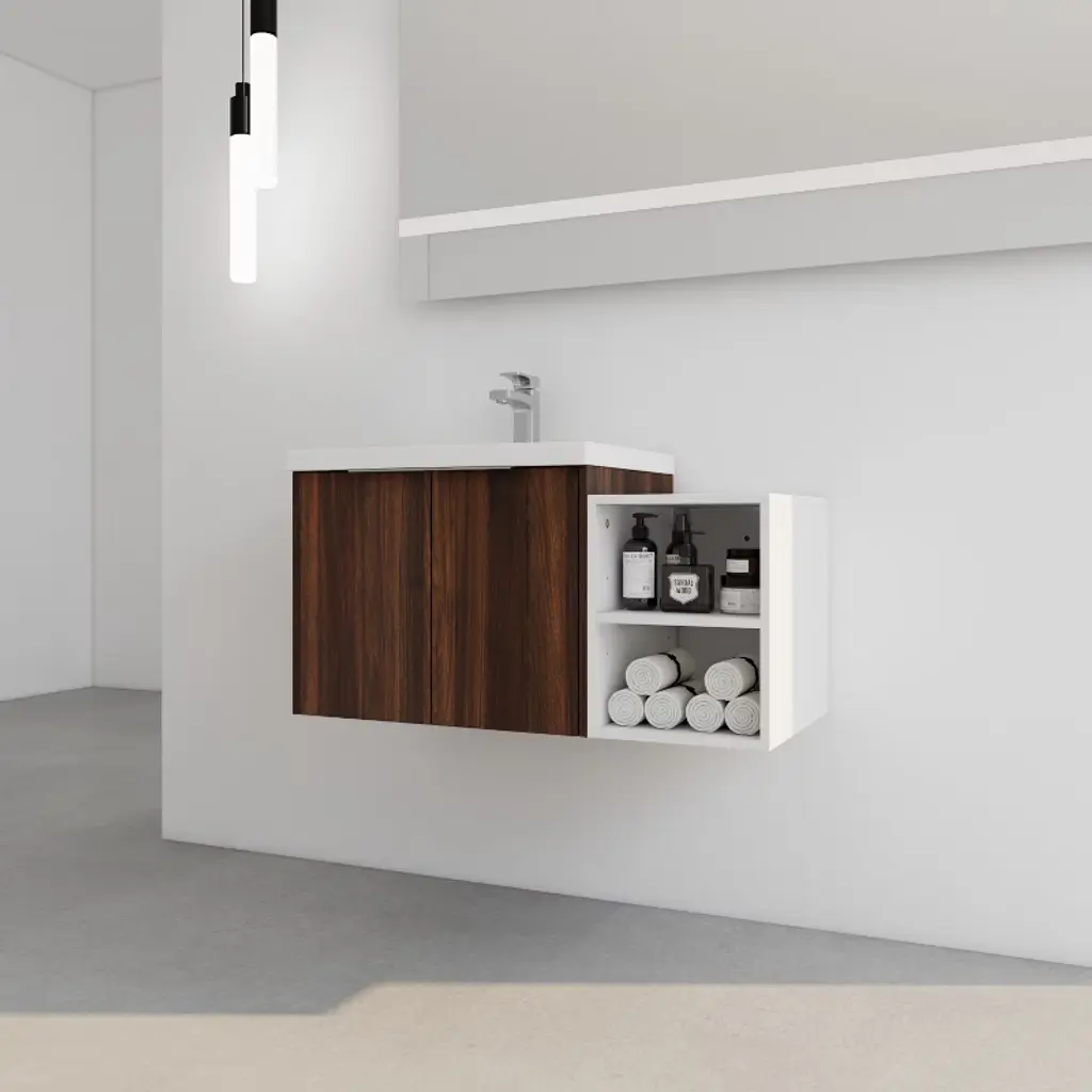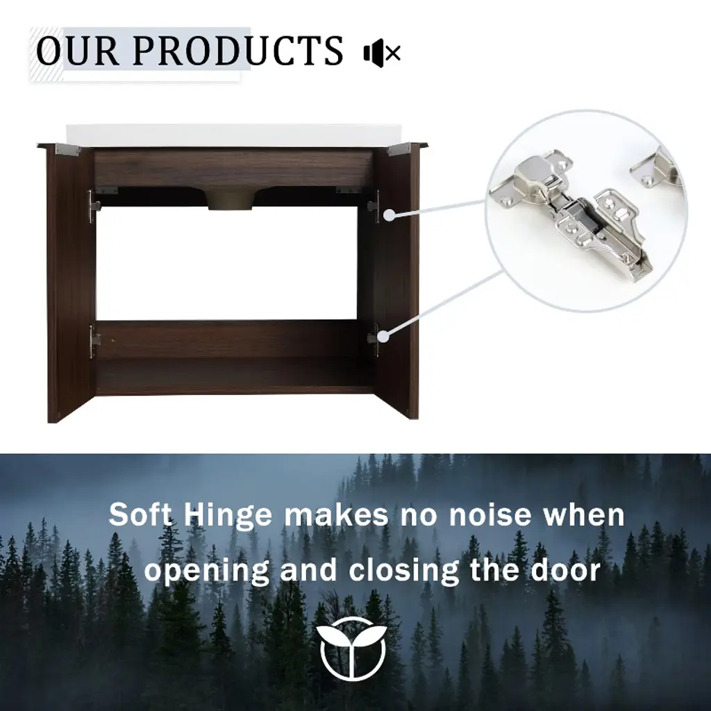 Wall Mounted Vanity The ample double door cabinet provides plenty of storage space in the bathroom, and the space at the bottom allows for easier access to dirty clothes baskets and daily cleaning. Extra matching a combination of separate small storage shelves provides plenty of extra space for the bathroom. Resin Sink The diversified resin basin design allows us to escape from the traditional countertop. The lines and shapes of the products bring us enjoyment that can not be provided by ceramic countertop or stone countertop. Metal Handle & Soft Closing Door The doors with soft-closing hinges can open up and close freely, enjoy silence and enhance your life joy. The material of the door hinges is stainless steel. The handle is firm and durable, has a very long service life, and makes your life more comfortable. Durable Material Vanity base is made of high quality "Eco-Friendly" plywood that surface material used "Scratch & Water-Resistant" melamine, which is designed to not only withstand threats of moisture and humidity but also easy to clean and maintain.