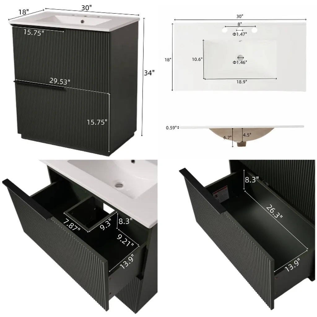 Dexmalle Green Fluted Design 30" Bathroom Vanity With Full-extension Drawers