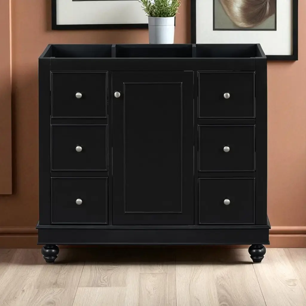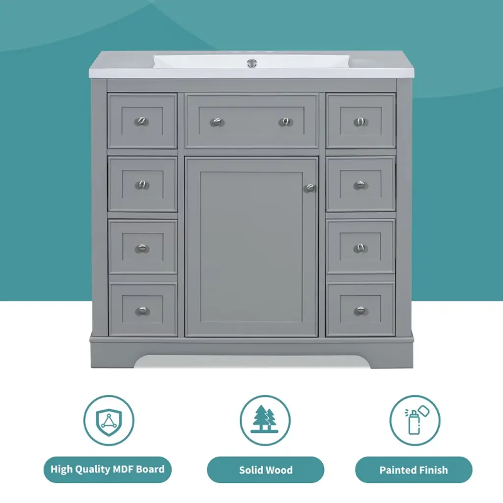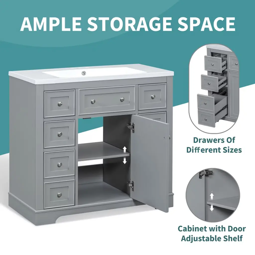 Vanity with Cabinet & Drawers & Shelf -Considering the humid environment in bathroom, this bathroom vanity has ample enclosed storage spaces: one cabinet with door, three drawers with slide rail each side (the top middle one drawer is for decoration use only), and adjustable shelf in the cabinet. You can put soaps, towels, shampoos, tissue paper and other bathroom essentials in it so to keep them away from dust.