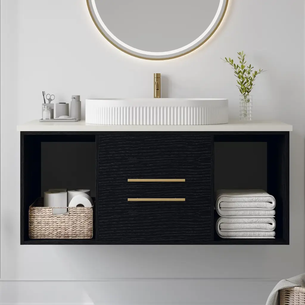 Transform your bathroom with this 40-inch floating bathroom vanity, designed for modern and contemporary spaces. With a wall-mounted installation and a sleek oval ceramic countertop basin, it adds both style and function to small bathrooms, condos, or apartment settings.