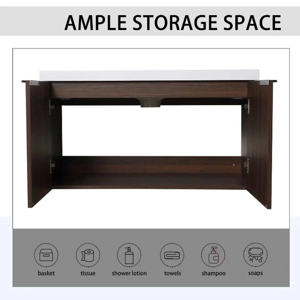 [Ample Storage Space] An open shelf to place some daily necessities, it offers sufficient bathroom storage. [Eco-friendly & Durable Material] High quality "Eco-Friendly " plywood that surface material used "scratch & water-resistant" melamine, withstand threats of moisture. [Soft Closing Door] The diversified resin basin design allows us to escape from the traditional countertop.
