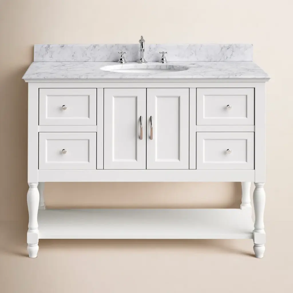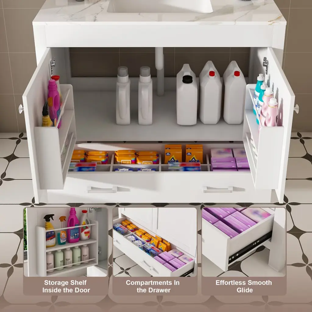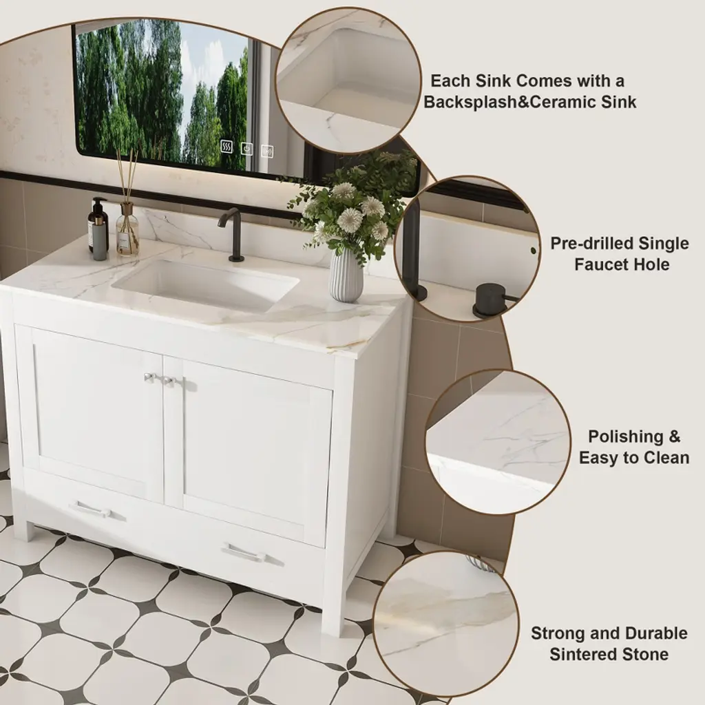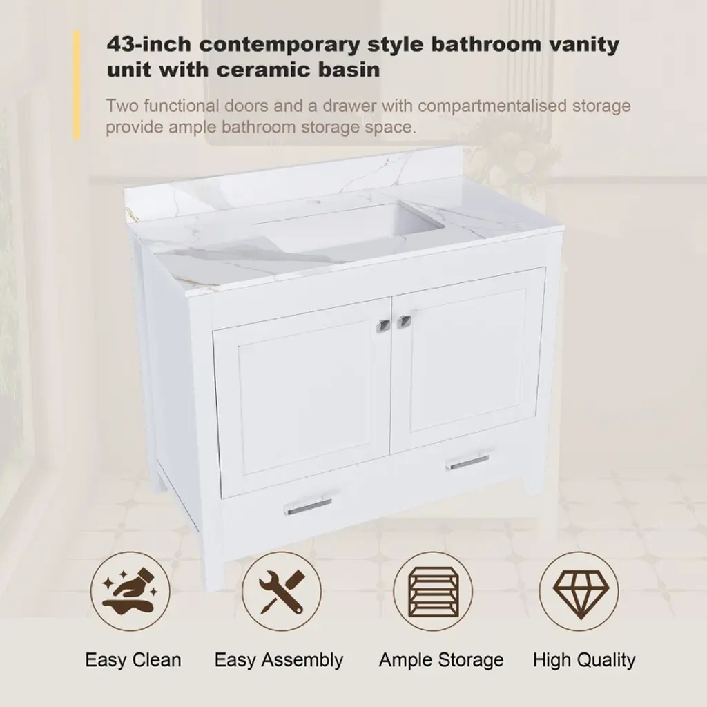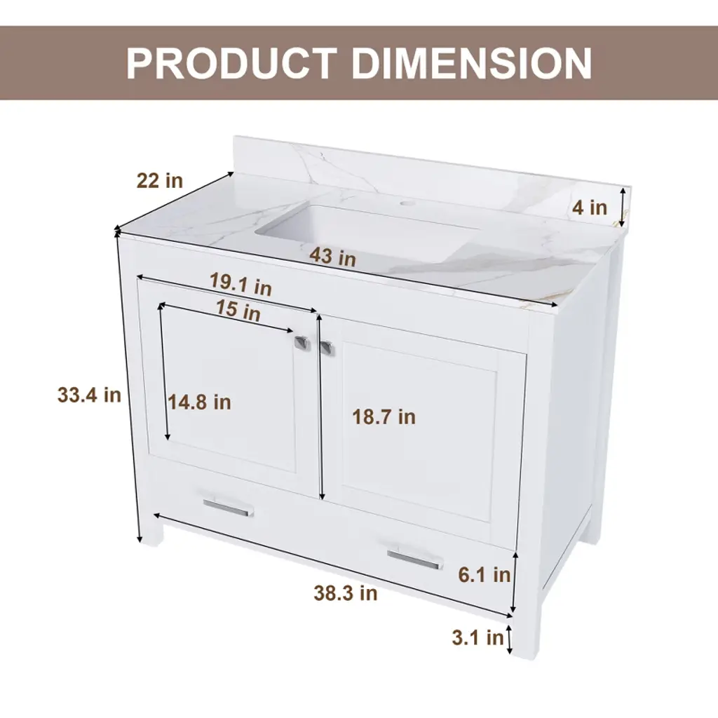 The bathroom vanity can be paired with a 43*22-inch ceramic sink. The pre-drilled holes of the ceramic sink simplify the installation of the faucet, enhancing the usability of the vanity cabinet without affecting the style.
