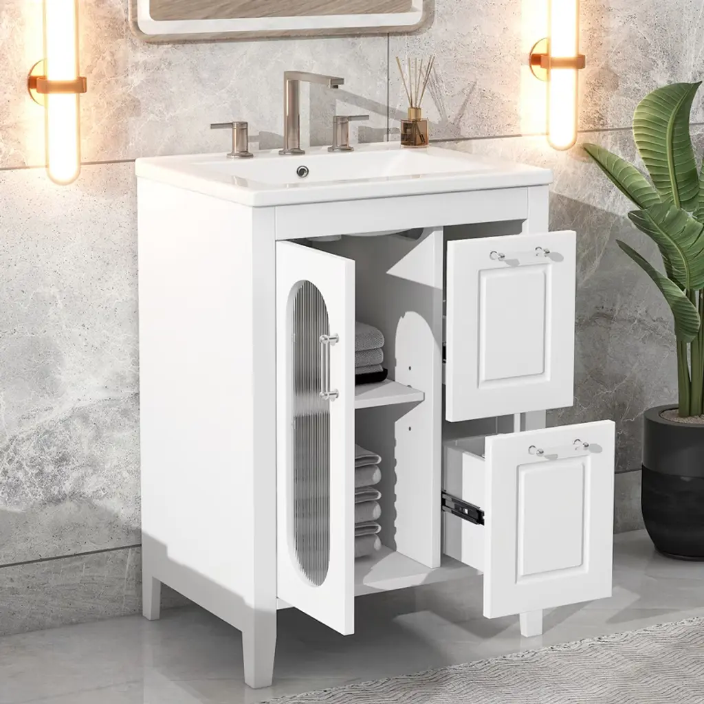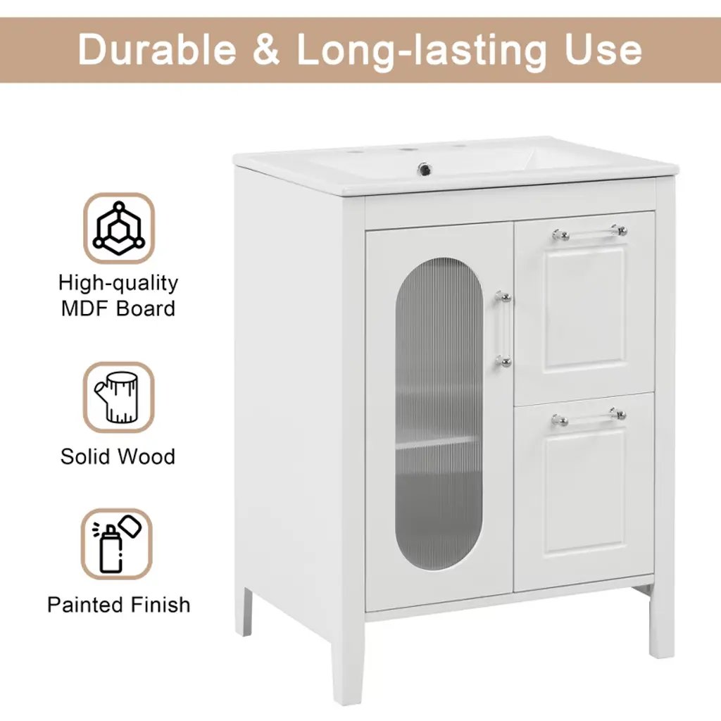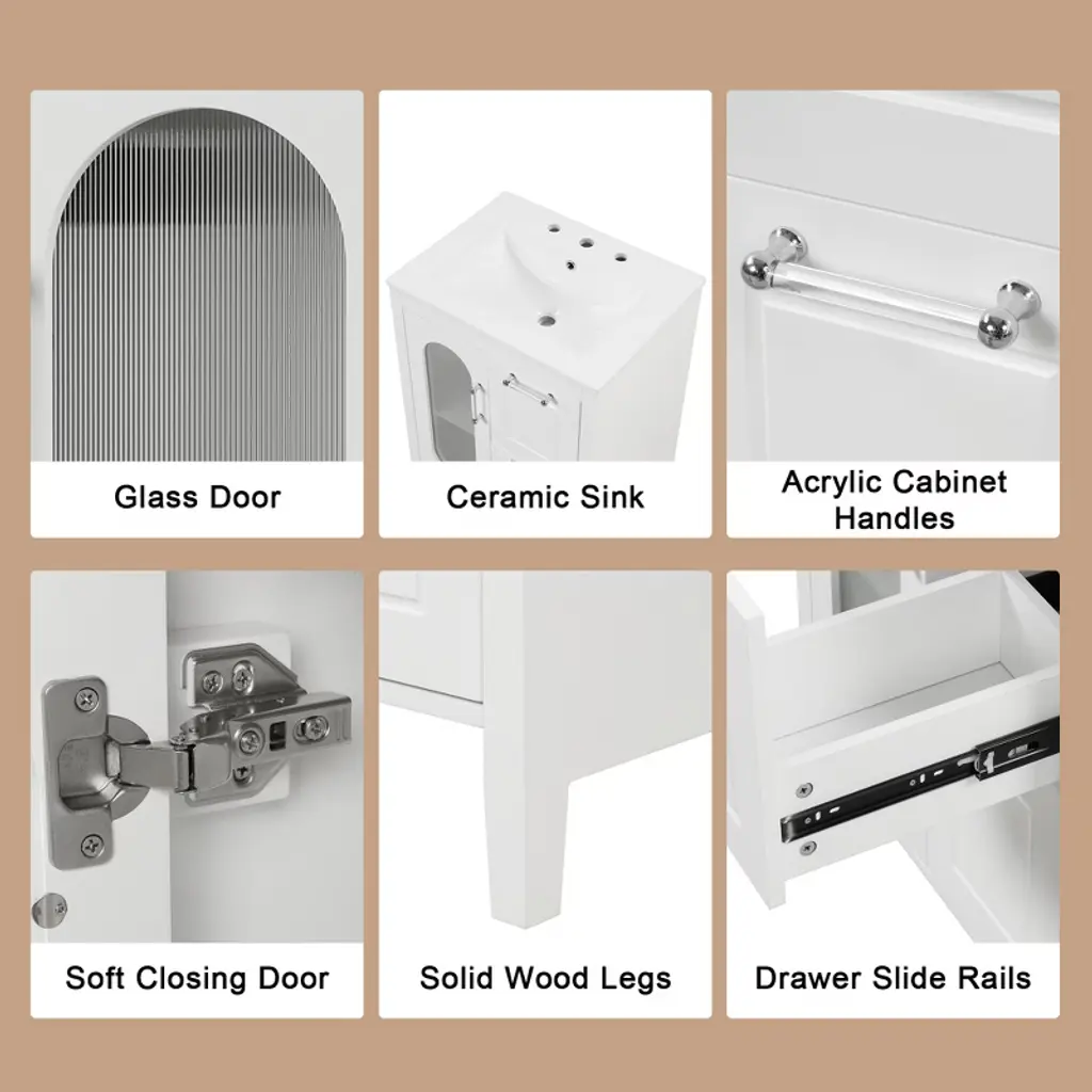 Solid Wood & High-quality MDF Board & Ceramic Sink & Moru Glass & Painted Finish Cabinet with Door & Two Drawers & Adjustable Shelf One Package Details 1. Two Drawers with Sildes 2. Acrylic Bar Handles 3. Stainless Steel Hinges