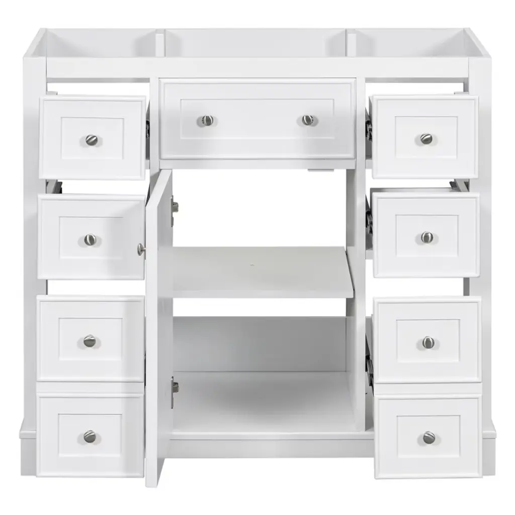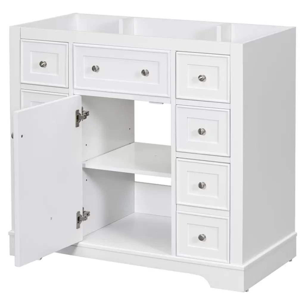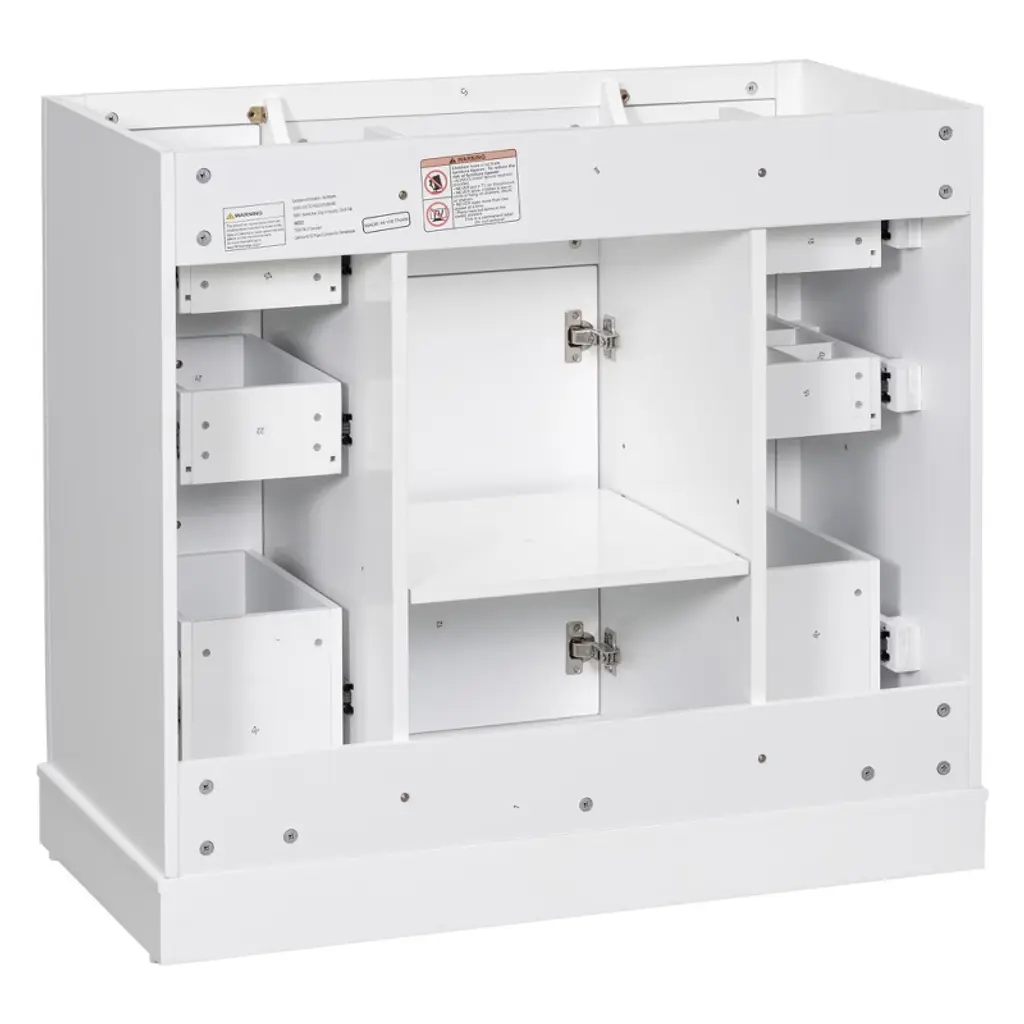 Vanity with Cabinet & Drawers & Shelf -Considering the humid environment in bathroom, this bathroom vanity has ample enclosed storage spaces: one cabinet with door, three drawers with slide rail each side (the top middle one drawer is for decoration use only), and adjustable shelf in the cabinet. You can put soaps, towels, shampoos, tissue paper and other bathroom essentials in it so to keep them away from dust.