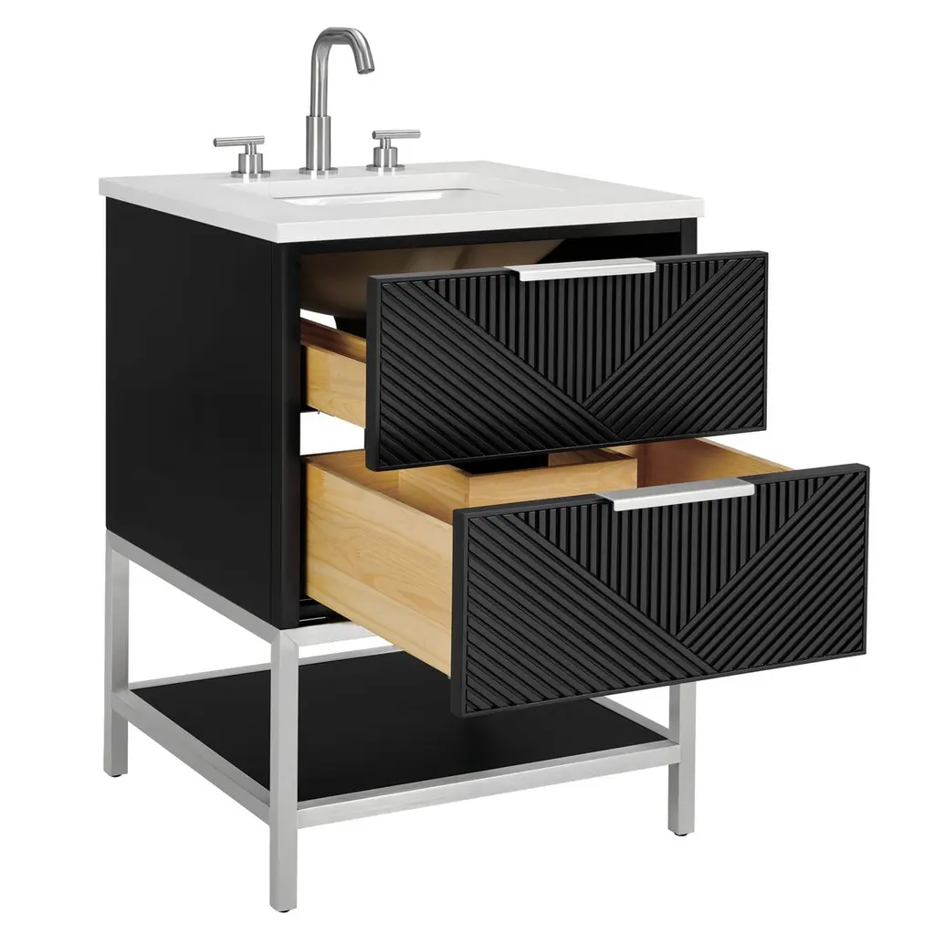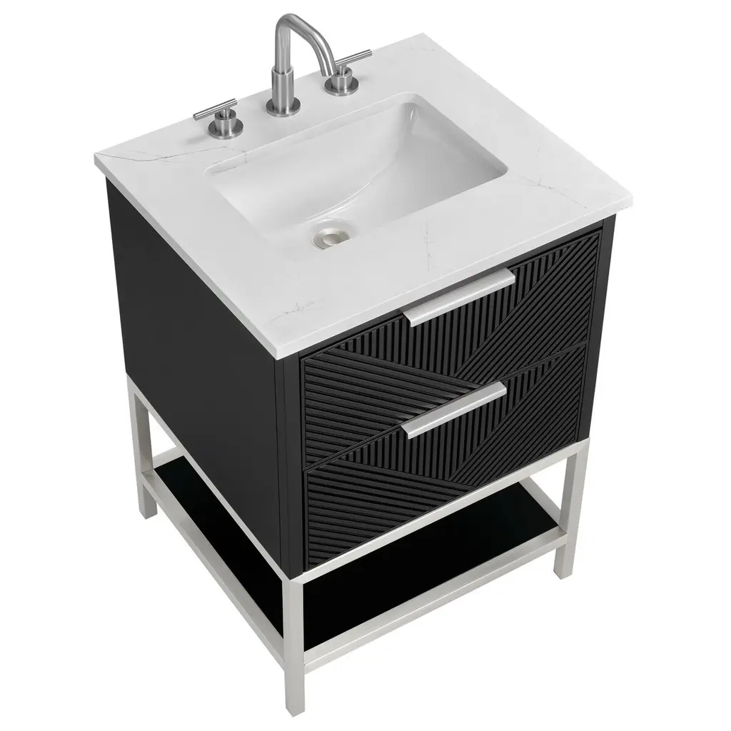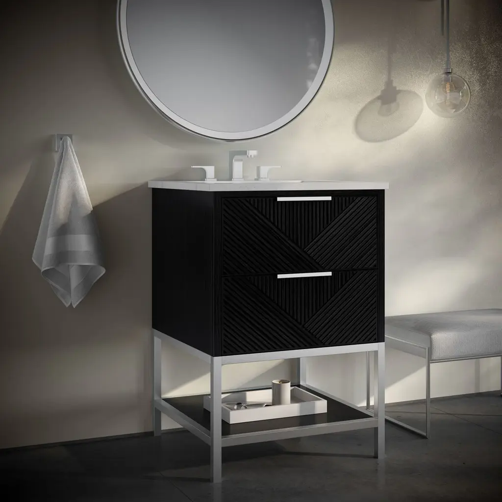 The Diamond 24" Bath Vanity is a design lover's dream, a true showstopper that commands attention in any space. Its dynamic diagonals across the drawer faces create a striking faceted design, while the handles add a touch of refined elegance and style. The open shelf at the base not only elevates the vanity but also creates a sense of openness, providing a convenient spot to store towels or essentials. Available in a variety of finishes, the Diamond vanity is the ultimate statement piece, designed to captivate and enhance the aesthetic of your bathroom. (Faucet not included)