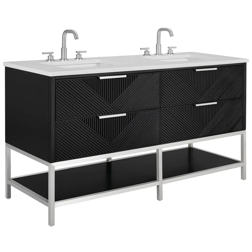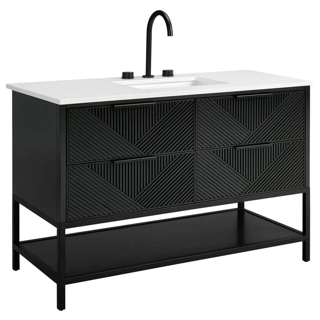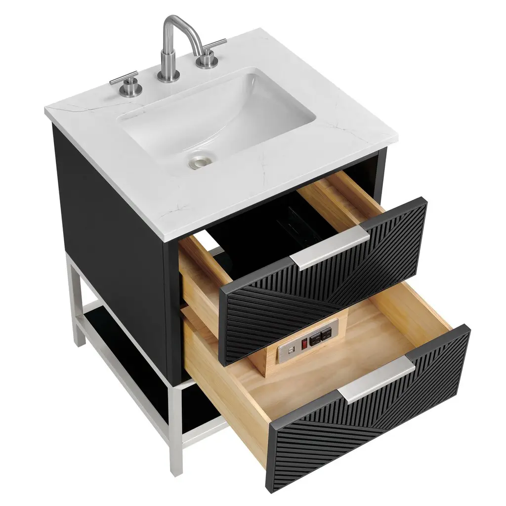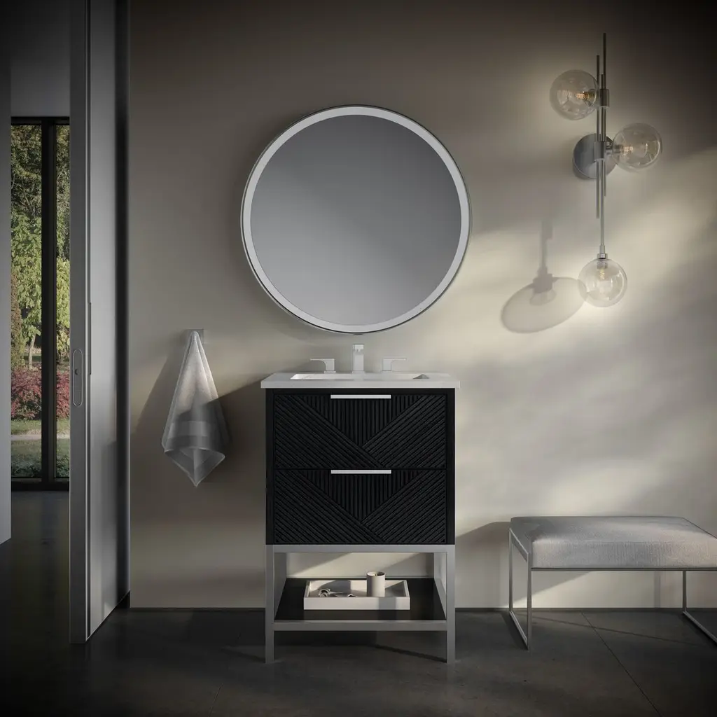 The Diamond 24" Bath Vanity is a design lover's dream, a true showstopper that commands attention in any space. Its dynamic diagonals across the drawer faces create a striking faceted design, while the handles add a touch of refined elegance and style. The open shelf at the base not only elevates the vanity but also creates a sense of openness, providing a convenient spot to store towels or essentials. Available in a variety of finishes, the Diamond vanity is the ultimate statement piece, designed to captivate and enhance the aesthetic of your bathroom. (Faucet not included)